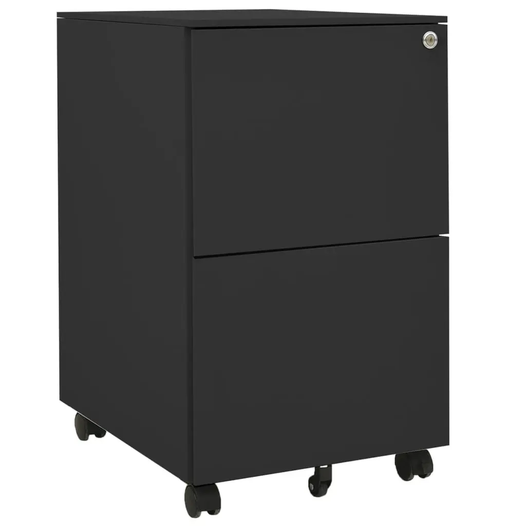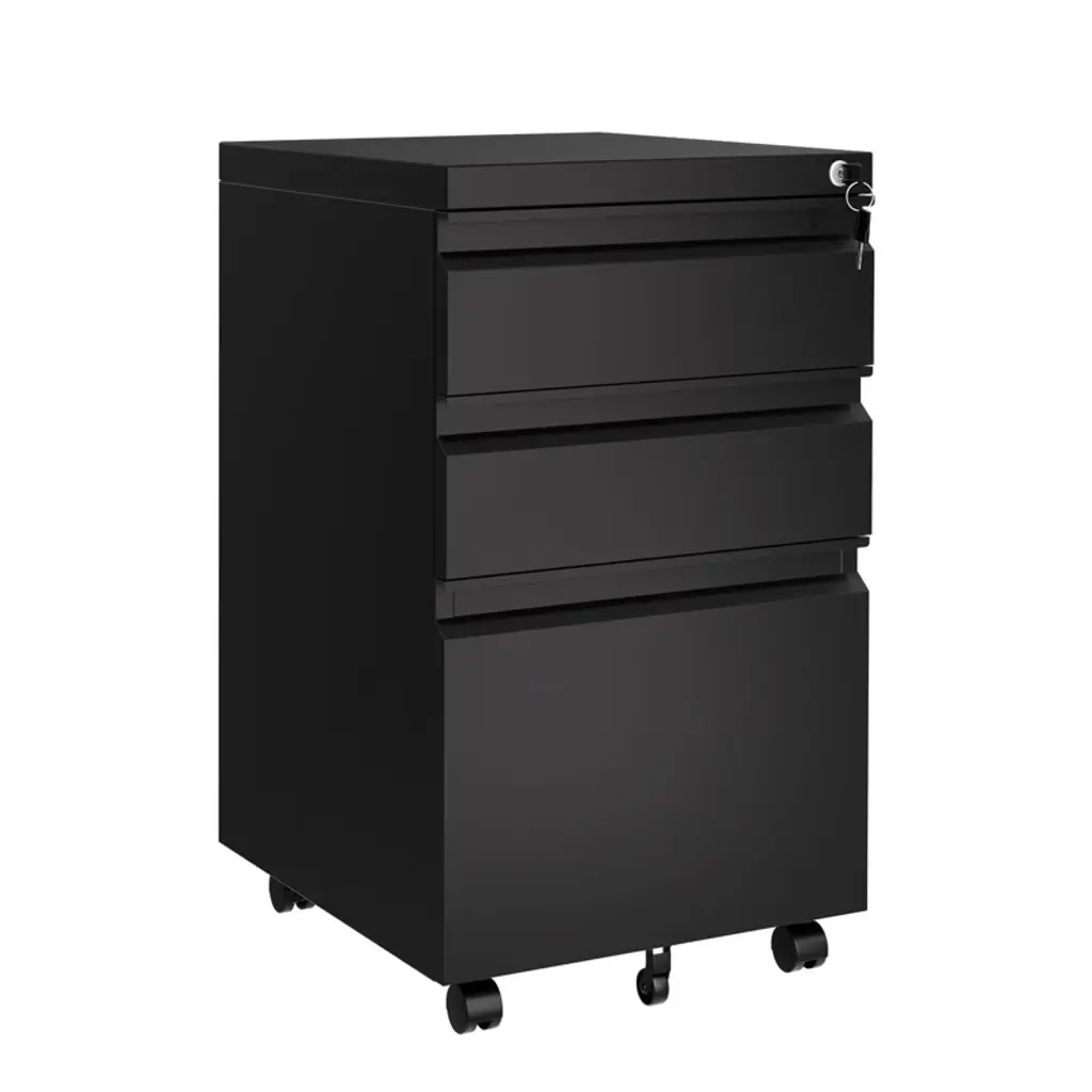 The Three Drawer Metal File Cabinet is a multi-functional storage solution perfect for files, office supplies, and accessories for your small professional office or home office. Featuring two file drawers and one storage drawer, this file cabinet features steel construction and a smart, efficient design. Our compact filing cabinet works well in small spaces and fits under most work surfaces or office desks. Each drawer features high-sides to accommodate letter-sized hanging files. The top accessory drawer is perfect for office storage and organization. The additional wheels that come with this file cabinet are both stylish and functional, making it easy to move around your home or office. Using a patented glide suspension, the drawers have a smooth open and close slide with a three-quarter drawer extension to prevent tipping. In addition, you can keep your files and possessions secure by using the built-in lock for the top two drawers. The painted steel surface is non-porous and easy to clean. Bring organization and function to your home or office with this three-drawer file cabinet.