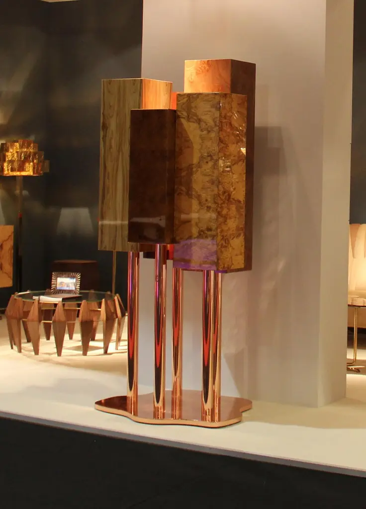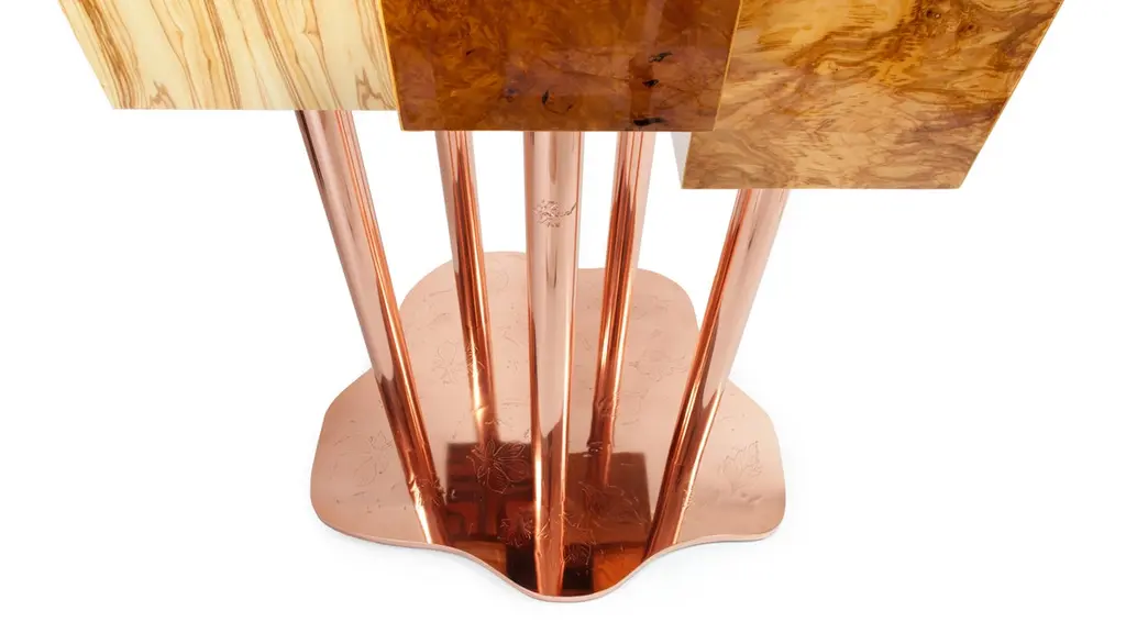 The special tree is a tree in which two lovers write the promise of an everlasting love.The craftsmanship work in exotic roots emphasizes each volume of The Special Tree cabinet and celebrates the hues of the autumnal season. The copper base of the cabinet presents a chiseled jewellery work with five types of fallen leaves. A special detail stands out in the central ‘trunk’ in which the jeweller chiseled the name of the creation.This luxury cabinet is a statement piece handmade by Portuguese artisans and designed for the most exquisite interiors. Product detailsTop: wood structure finished with exotic veneers in high gloss varnish. Interior finished with satinwood veneer in high gloss varnish. Glass shelves.Base, tubes and shelf supports: handcrafted in polished copper.Product optionsUnder request.Weight 170Kg 374,8 lbsMade to order. Custom sizes and other finishes are available under request.Designed by Joana Santos Barbosa for InsidherLand, 2013. Handmade in Portugal.
