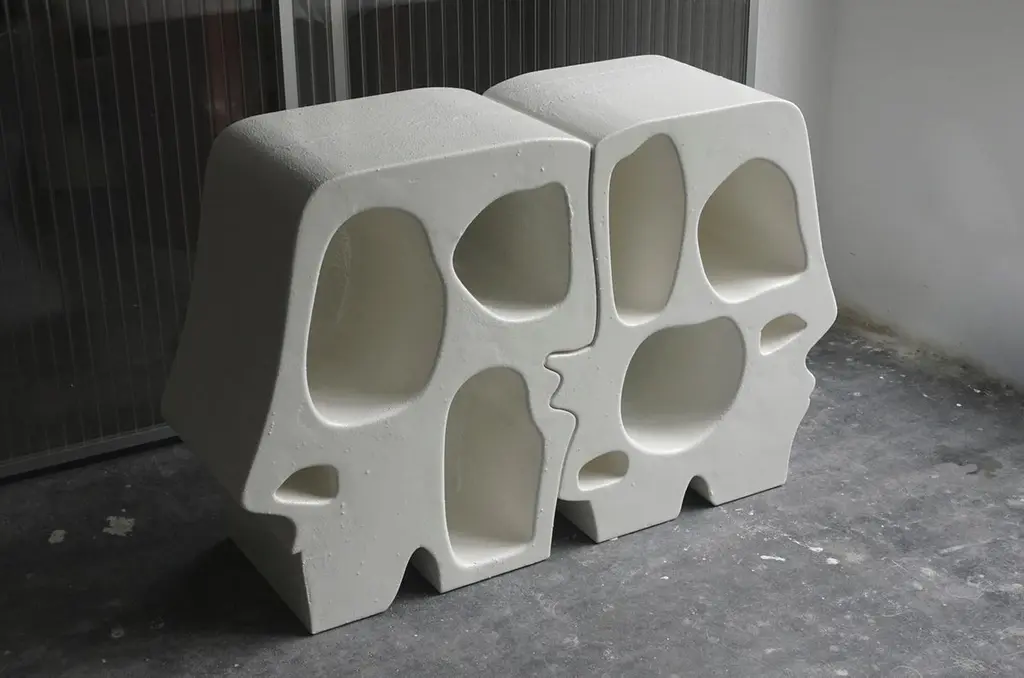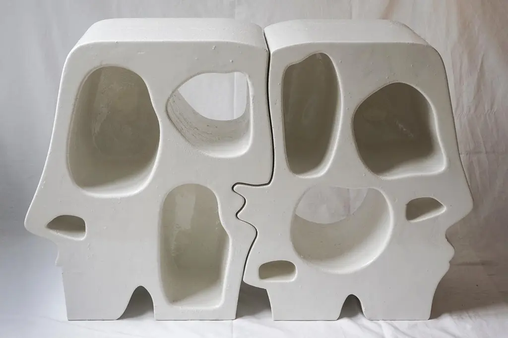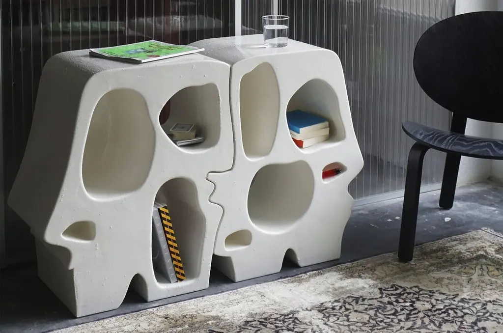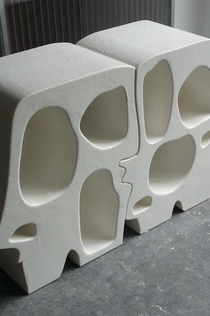 Spectator twins by Freia AchenbachLimited Edition of 25Dimensions: D 105 x W 33 cm x H 68 cmMaterials: resin, sand, foamThe amorphly shaped shelf is not only offering storage or presentation space, but stimulates the mechanism of projection and alludes to different faces that can only be recognized at second glance. When a sensory stimulus is offered to our perception, the spirit accepts this piece and completes what is missing. By recognizing the faces in the object, the role between subject and object is reversed and the shelf is moved into the position of the observer.Spectator Twins is part of the Spectator Shelf family . It consists of two elements that are interlocking with each other and can be used as a small cabinet or sideboard. Like the rest of the Spectator family, it is characterized by its amorphous curved shapes and alludes to different faces that can be recognized at second glance. Each piece is hand painted with resin whichgives each shelf a unique and vibrant finish.Freia Achenbach is a Stuttgart-based object, furniture, and spatial designer. Her approach allows movement between disciplines and playfully explores material, form, and colour. In her work Freia Achenbach experiments with a wide variety of materials and both traditional and innovative manufacturing processes.Her objects always tell a story and bring a certain ambiguity with them. All objects are handmade and/or created in collaboration with small manufactories. She produces objects as unique pieces as well as in small series and realizes commissioned works for customers. Since 2018 she has been collaborating with June Gschwander and Carlo Kurth under the joint design studio anima ona. She has completed projects with a range of clients including Fondation d´entreprise Martell, Kunstverein Böblingen e.V., GRDXKN structure printing, Studio Saje, Moncomble Paris, Centre Pompidou.