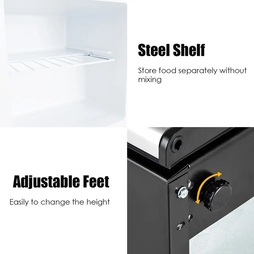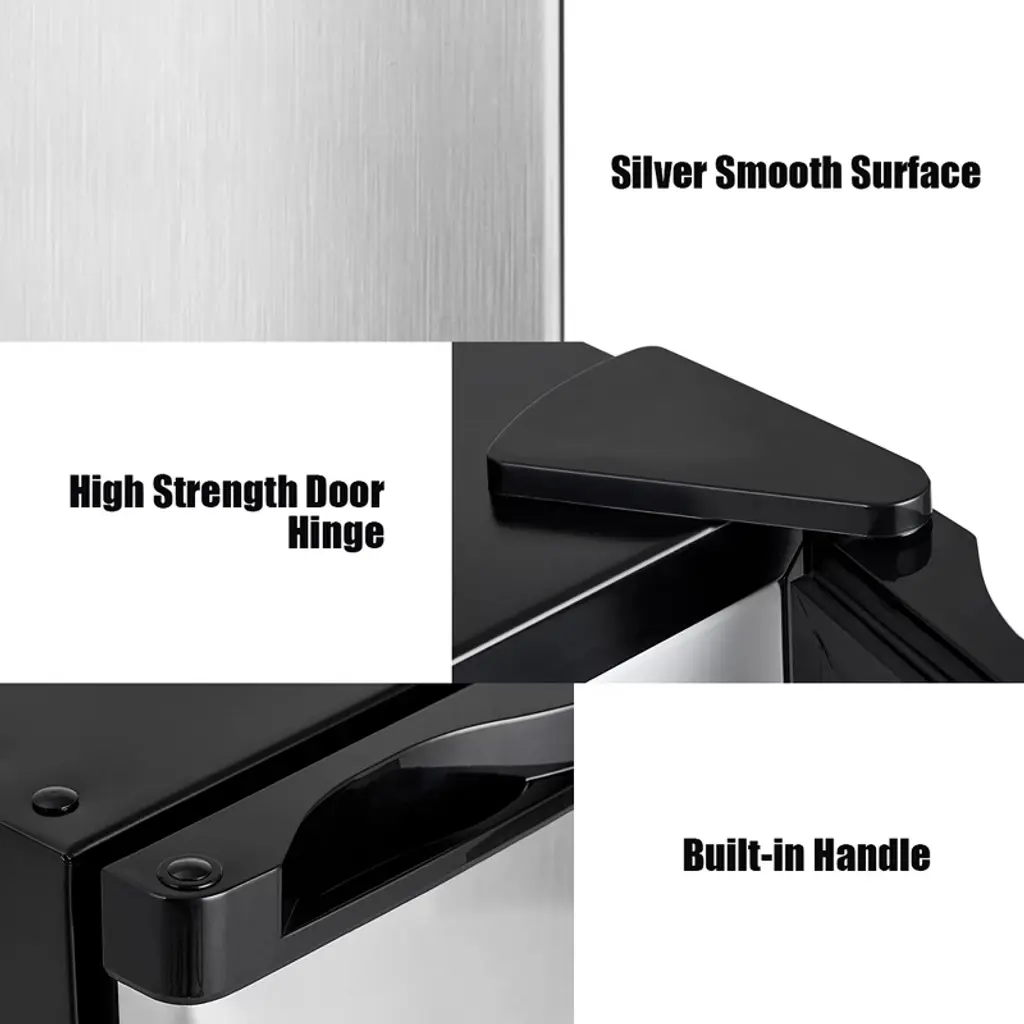 You'll never run out of space again with our compact but spacious upright freezer. This stainless steel freezer fits in any small space where cold storage is needed. This space-saving compact upright freezer is designed with a flush back, allowing it to fit cleanly against the wall or into corners. Adjustable leveling leg to fit unique spaces, and store all your go-to foods in an accessible wire pullout shelf Adjustable thermostat can meet all your needs while keep your energy costs down.FeaturesFreestanding setup design with 1.1 cubic feet capacity Stainless door and black cabinet presents a sleek and clean look Adjustable 7-grade temperature control to select your desired temperature Approximate temperature range of -8degree F to 7degree F A removable slide-out chrome shelf for your storage needs Classification storage decreases taint of odor and easy to locate food Recessed Door handle for easy access to your frozen foodsWith adjustable leveling legs to adjust levelManual defrost helps keep the freezer cleanFlush back design saves space in your home or officePerfect for small spaceInterior Capacity: 1.1 cu.ft.Temperature Range: -22 -14degrees / -8-7degree FRefrigerant: R600ARated Voltage/Frequency: 115V/60HzAmps: 0.8ATotal Dimensions: 18''L x 18''D x 18.5''H Product Weight: 33lbs Package Includes: 1 x Upright Freezer 1 x Instruction