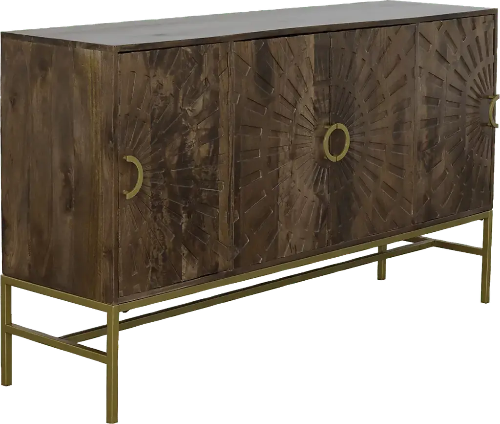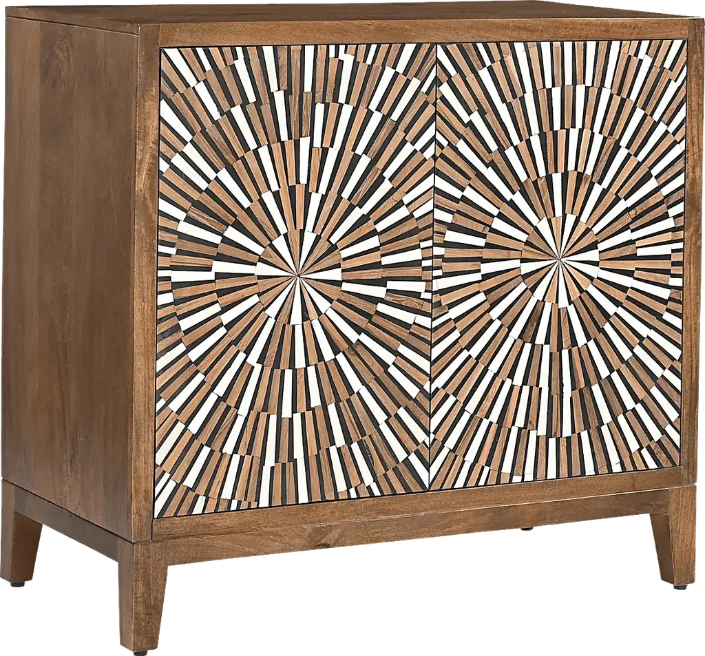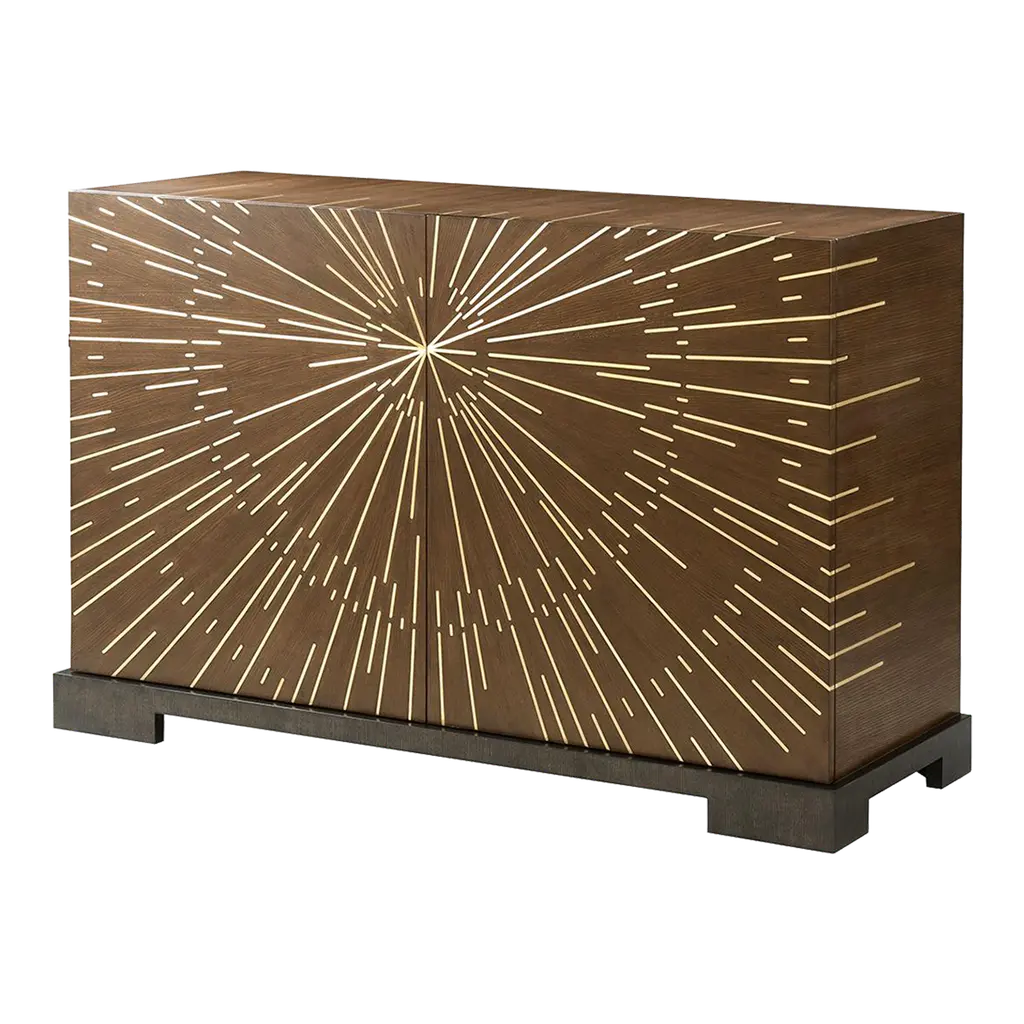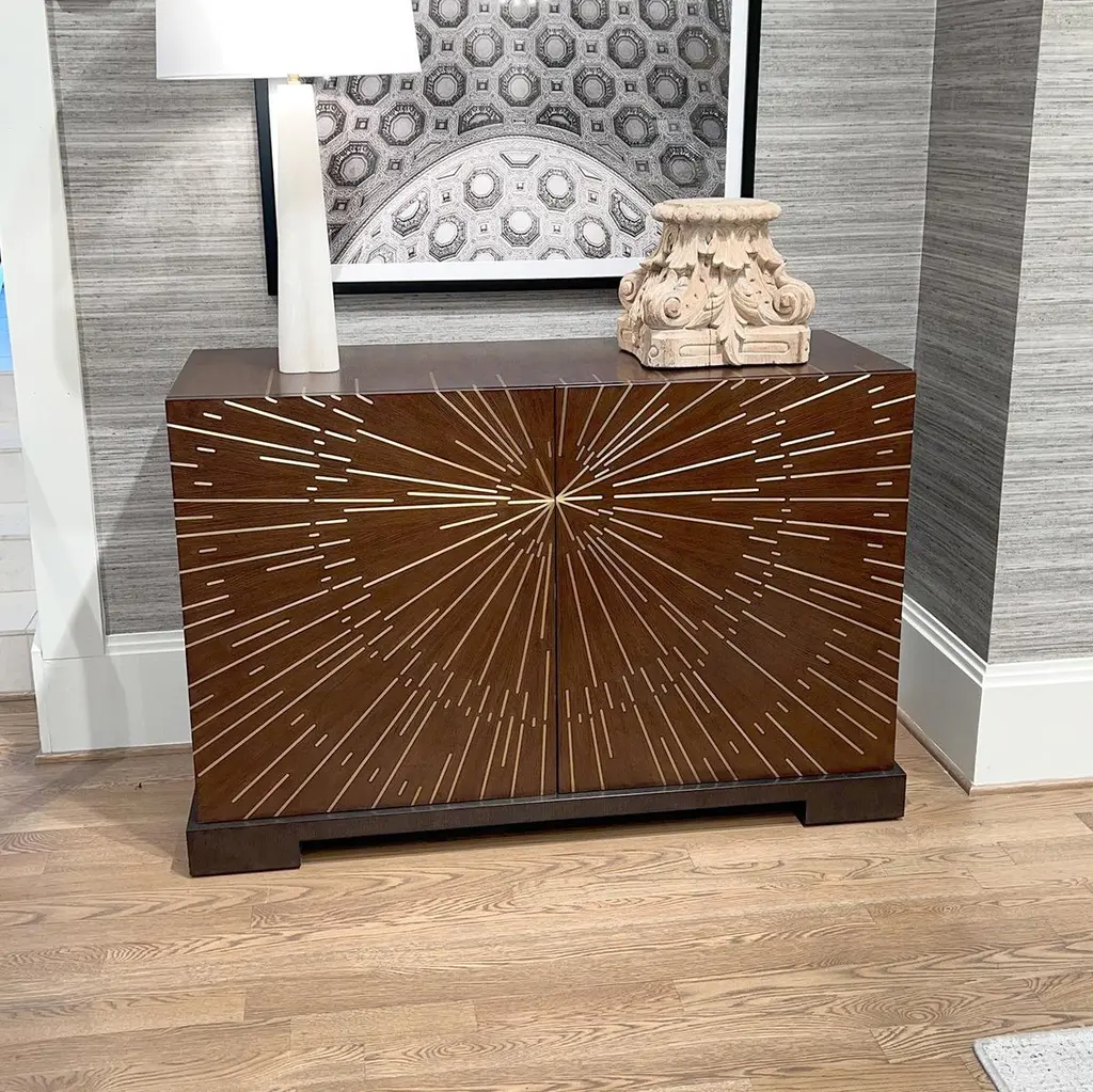 Set upon a robust mahogany base, this two-door cabinet exudes luxury and style. The starburst brass inlay pattern, meticulously designed across the doors and case, is showcased in our elegant Gelato finish, adding a touch of glamour to any room. Perfect for those who appreciate fine craftsmanship and unique design, this cabinet is more than just a piece of furniture—it's a statement. Whether placed in a living room, dining area, or entryway, it promises to catch the eye and spark conversation.Dimensions: 53.5" W x 20.75" D x 34.5" H