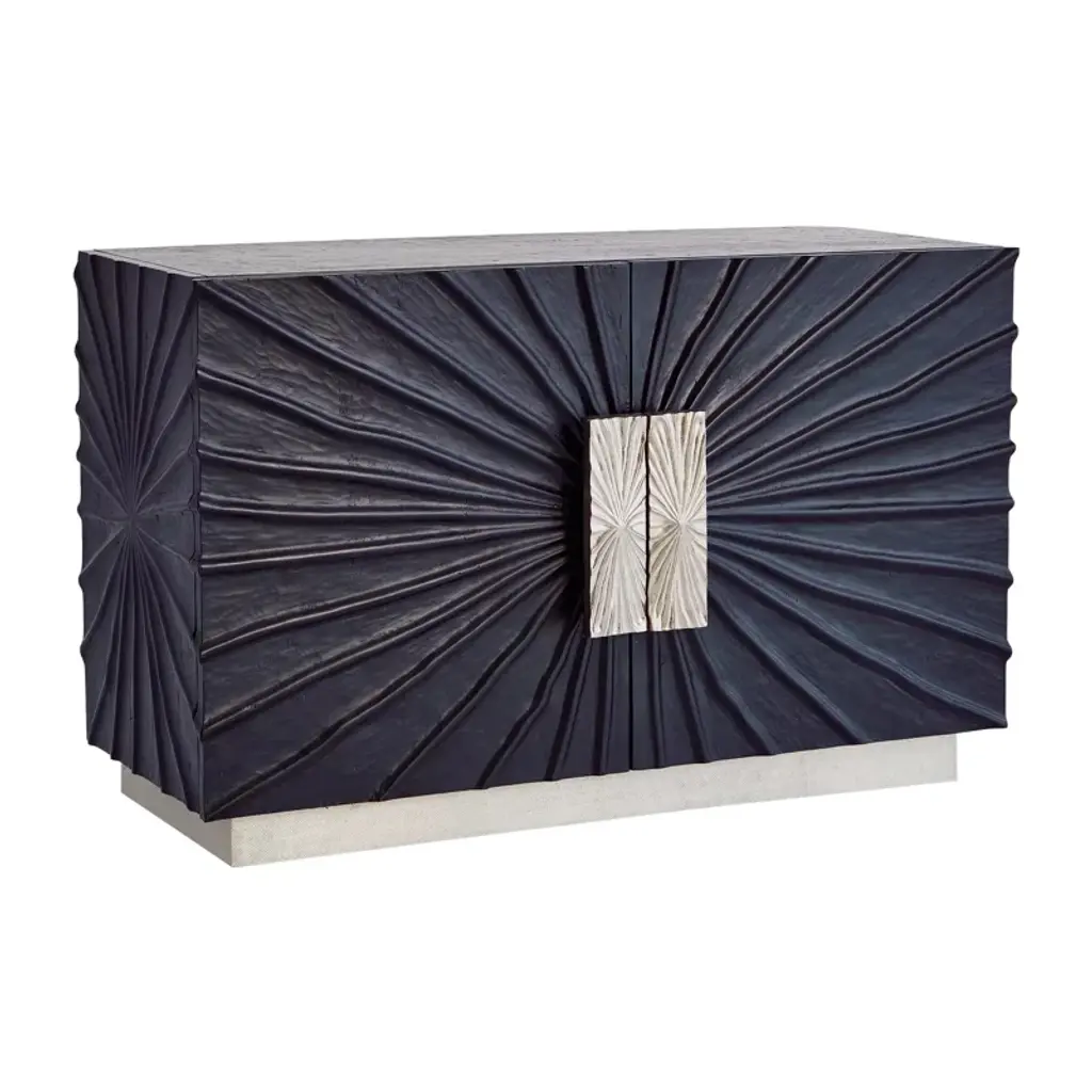 Set upon a robust mahogany base, this two-door cabinet exudes luxury and style. The starburst brass inlay pattern, meticulously designed across the doors and case, is showcased in our elegant Gelato finish, adding a touch of glamour to any room. Perfect for those who appreciate fine craftsmanship and unique design, this cabinet is more than just a piece of furniture—it's a statement. Whether placed in a living room, dining area, or entryway, it promises to catch the eye and spark conversation. Dimensions: 53.5" W x 20.75" D x 34.5" H