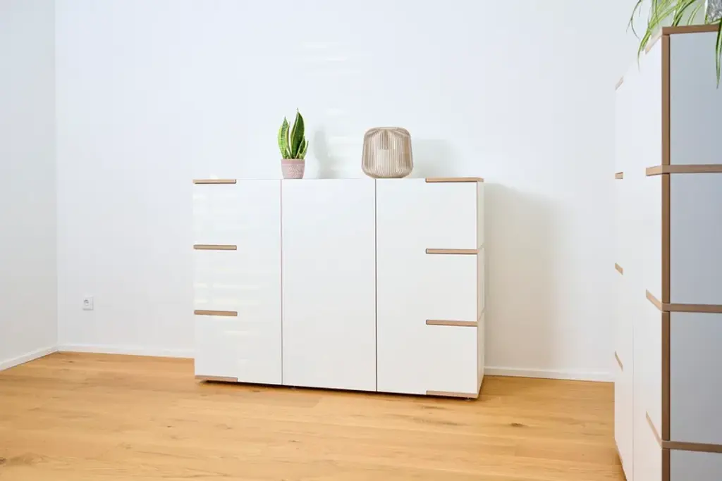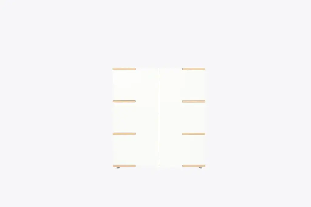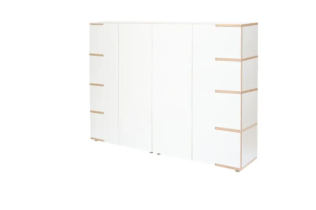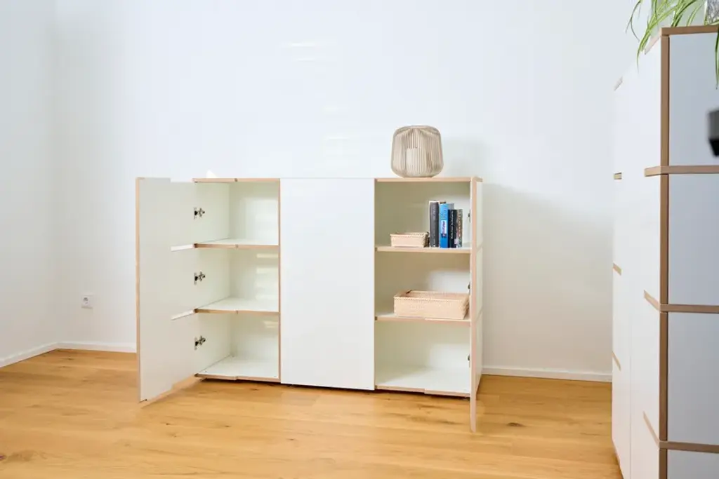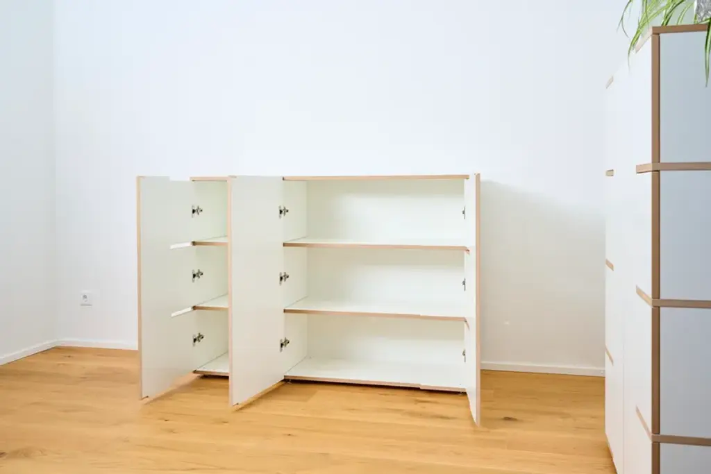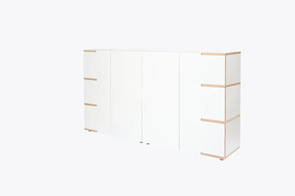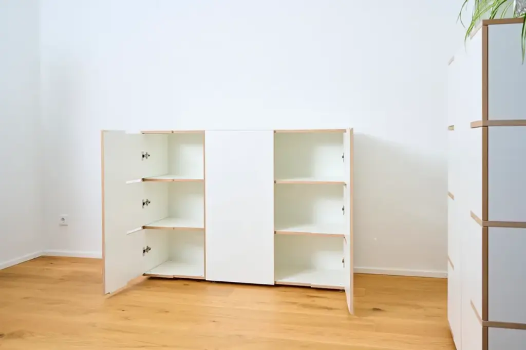Stau is a puristic highboard. It will be available in six different sizes and finds its individual use through this diversity. There are three different widths in 3 height variants each to choose from. Tojo-stau is perfect for any move and becomes a long-lasting companion - whether in the living room, dining room or study. The doors can be opened by a recessed handle at the top which supports the reduced look. The sides and outer doors are visually broken by the shelves and illustrate the shelf heights, which are also suitable for file folders. As flat-pack furniture and component-optimized, the carcass can be assembled and disassembled by one person without tools. Only for the fastening of the hinges a tool insert is necessary.