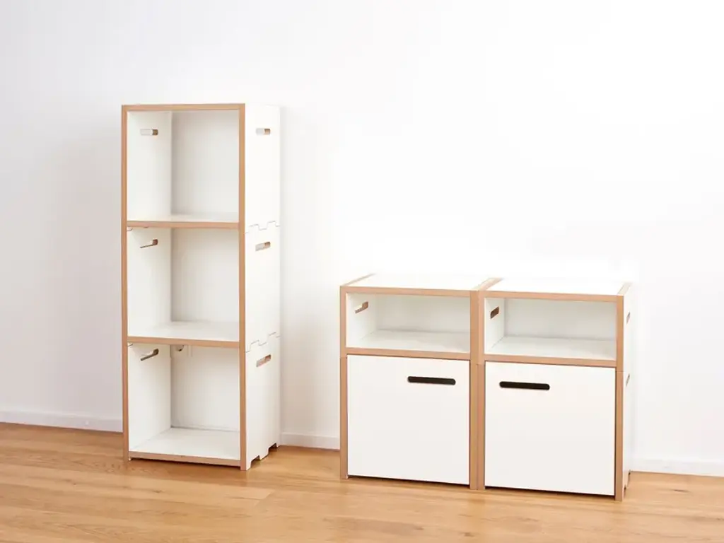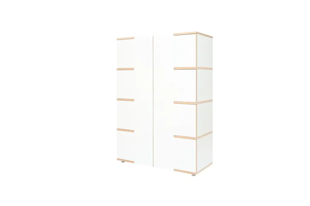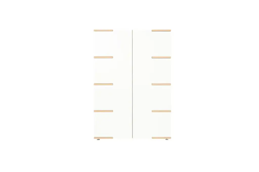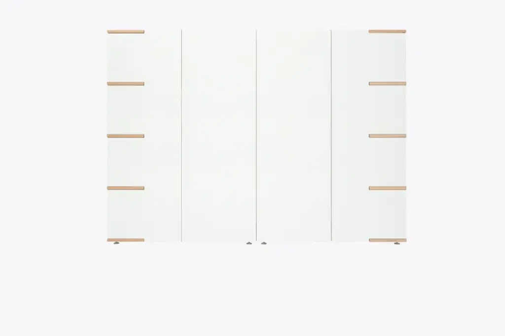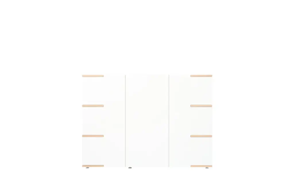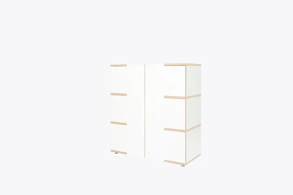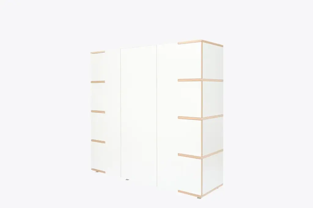 Stau is a puristic highboard. It will be available in six different sizes and finds its individual use through this diversity. There are three different widths in 3 height variants each to choose from. Tojo-stau is perfect for any move and becomes a long-lasting companion - whether in the living room, dining room or study. The doors can be opened by a recessed handle at the top which supports the reduced look. The sides and outer doors are visually broken by the shelves and illustrate the shelf heights, which are also suitable for file folders. As flat-pack furniture and component-optimized, the carcass can be assembled and disassembled by one person without tools. Only for the fastening of the hinges a tool insert is necessary.