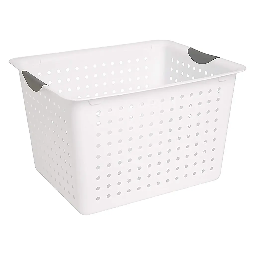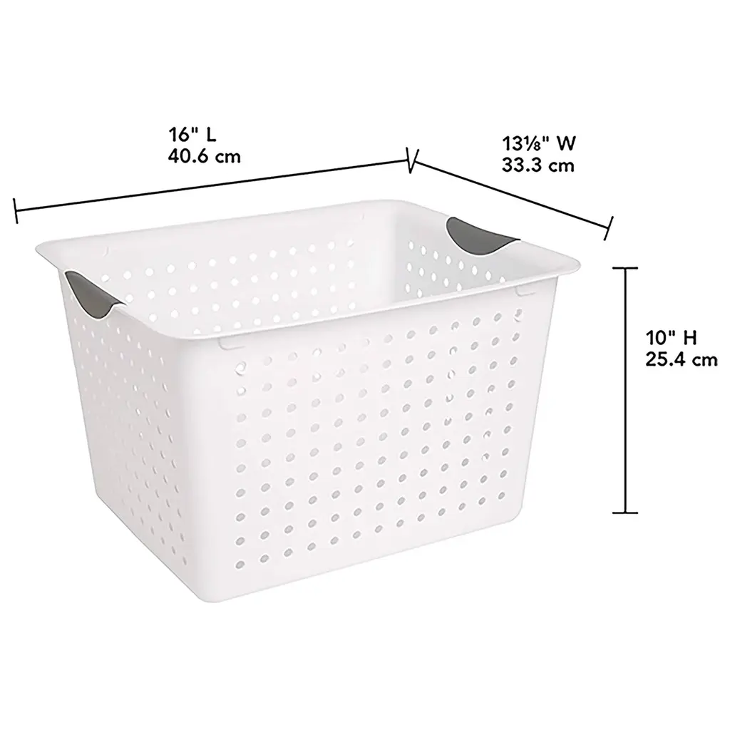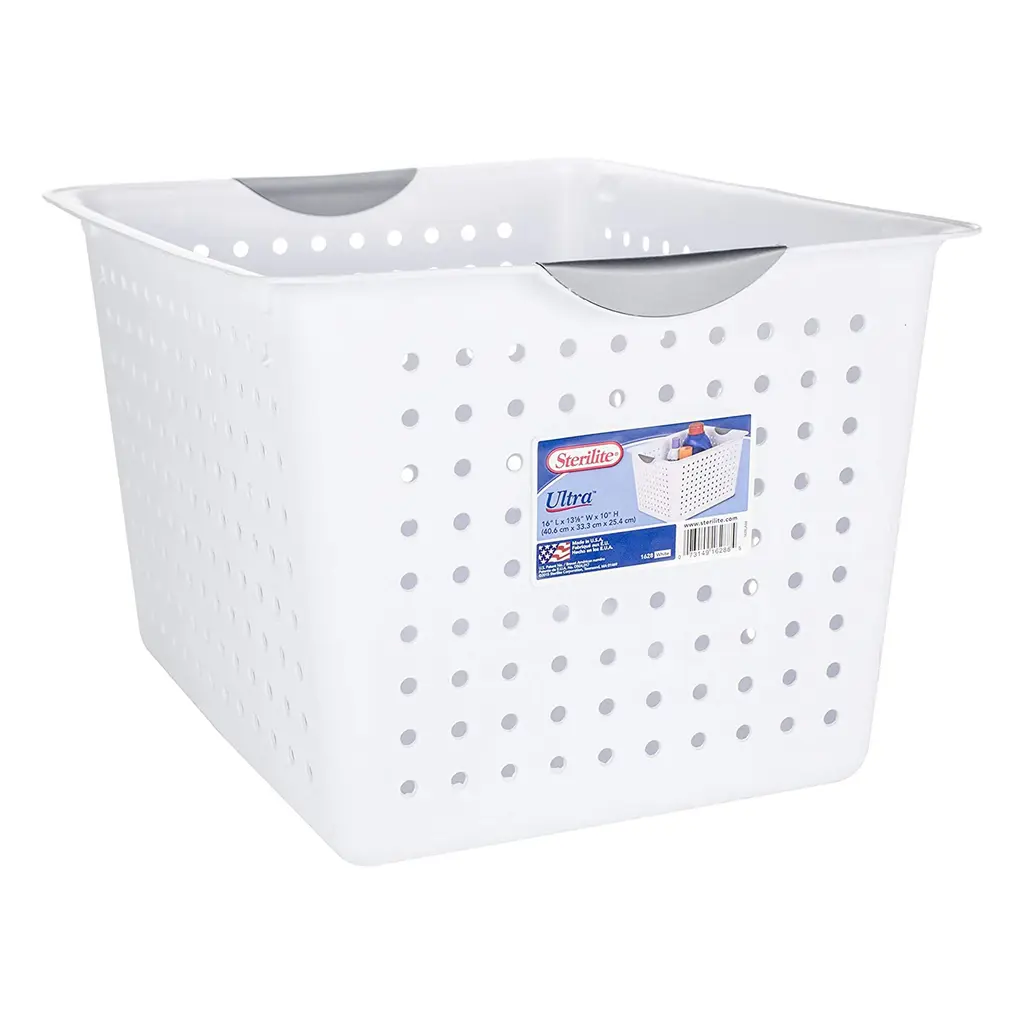 Whether you need to upgrade your organizational skills and pack away keepsakes, toys, crafts, food items, or office supplies, do it with ease. Clear some clutter from your home and put away all those larger bulky items taking up space in your closet with this set of 6 White Sterilite Large Deep Durable Ultra Plastic Storage Basket Tote that offers a convenient and space-saving storage solution for your home or office spaces. These deep baskets are ideal for organizing countertops, kitchen cabinets, home office space, and shelving around the home. Made in the USA, these items are ideal for storing CDs, DVDs, bathrooms, and garage or office supplies. Absolutely almost anywhere a person needs to control some clutter, these durable ultra baskets are ideal for a wide variety of uses. Measuring 16 by 13.12 by 10 inches, these Ultra baskets are also durable with their titanium insert handles. With their smooth finish, these storage bins are easy to clean. They have contoured handles for comfortable transporting while the holes allow for the ventilation of items. Find the best solution for your decluttering needs with this 6-Pack White Deep Ultra Basket Durable Plastic Storage Organizer from Sterilite. Pack of (6) large storage baskets provide endless storage and organization possibilities Ideal for organizing drawers, shelf space, or countertops Contemporary ventilated side design complements any home Contoured handles for comfortable transporting Baskets were made to nest together to save space Durable plastic construction built to last and easy to clean Color: White with titanium-colored handles Outside Dimensions (L x W X H): 16 x 13.12 x 10 inches Manufacturer warranty: 1-year warranty Quantity: 6