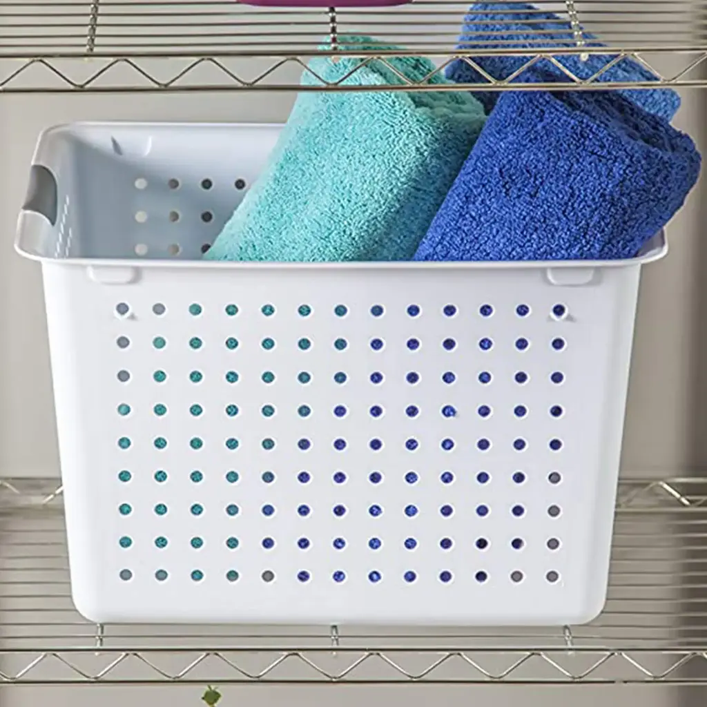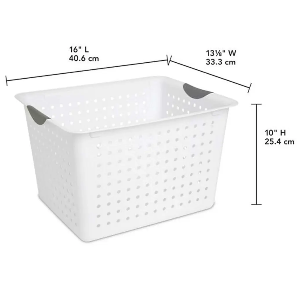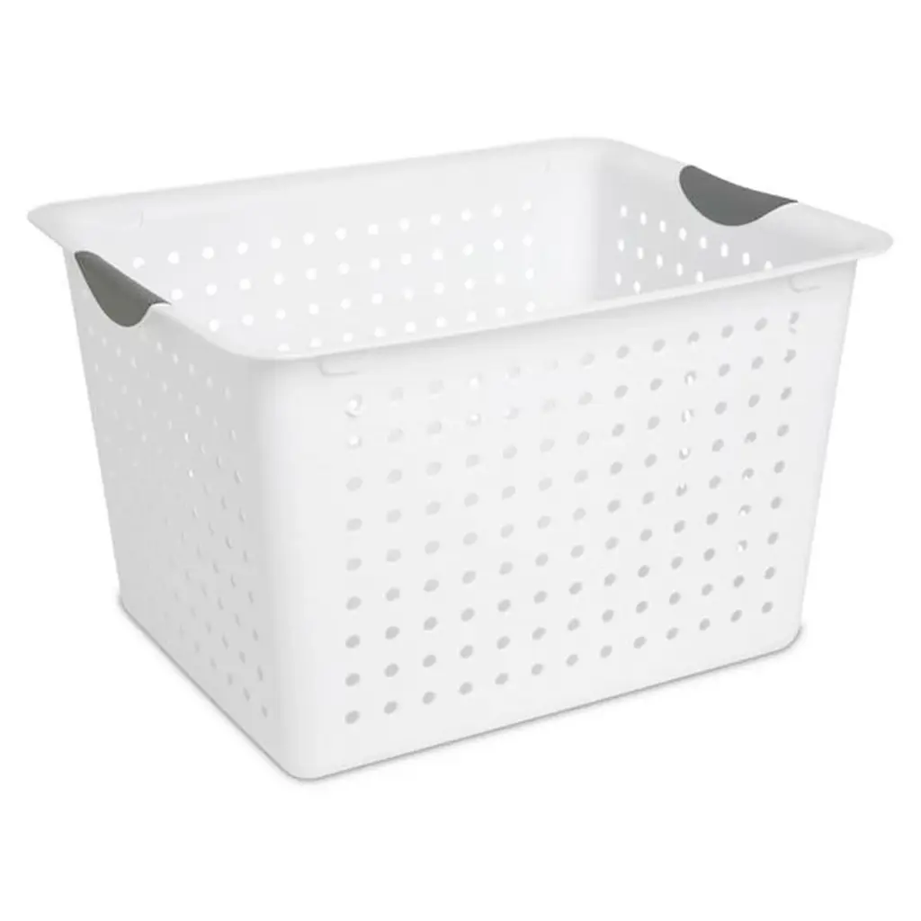 Whether you need to upgrade your organizational skills and pack away keepsakes, toys, crafts, food items, or office supplies, do it with ease. Clear some clutter from your home and put away all those larger bulky items taking up space in your closet with this set of 6 White Sterilite Large Deep Durable Ultra Plastic Storage Basket Tote that offers a convenient and space-saving storage solution for your home or office spaces. These deep baskets are ideal for organizing countertops, kitchen cabinets, home office space, and shelving around the home. Made in the USA, these items are ideal for storing CDs, DVDs, bathrooms, and garage or office supplies. Absolutely almost anywhere a person needs to control some clutter, these durable ultra baskets are ideal for a wide variety of uses. Measuring 16 by 13.12 by 10 inches, these Ultra baskets are also durable with their titanium insert handles. With their smooth finish, these storage bins are easy to clean. They have contoured handles for comfortable transporting while the holes allow for the ventilation of items. Find the best solution for your decluttering needs with this 6-Pack White Deep Ultra Basket Durable Plastic Storage Organizer from Sterilite. Pack of (6) large storage baskets provide endless storage and organization possibilities Ideal for organizing drawers, shelf space, or countertops Contemporary ventilated side design complements any home Contoured handles for comfortable transporting Baskets were made to nest together to save space Durable plastic construction built to last and easy to clean Color: White with titanium-colored handles Outside Dimensions (L x W X H): 16 x 13.12 x 10 inches Manufacturer warranty: 1-year warranty Quantity: 6