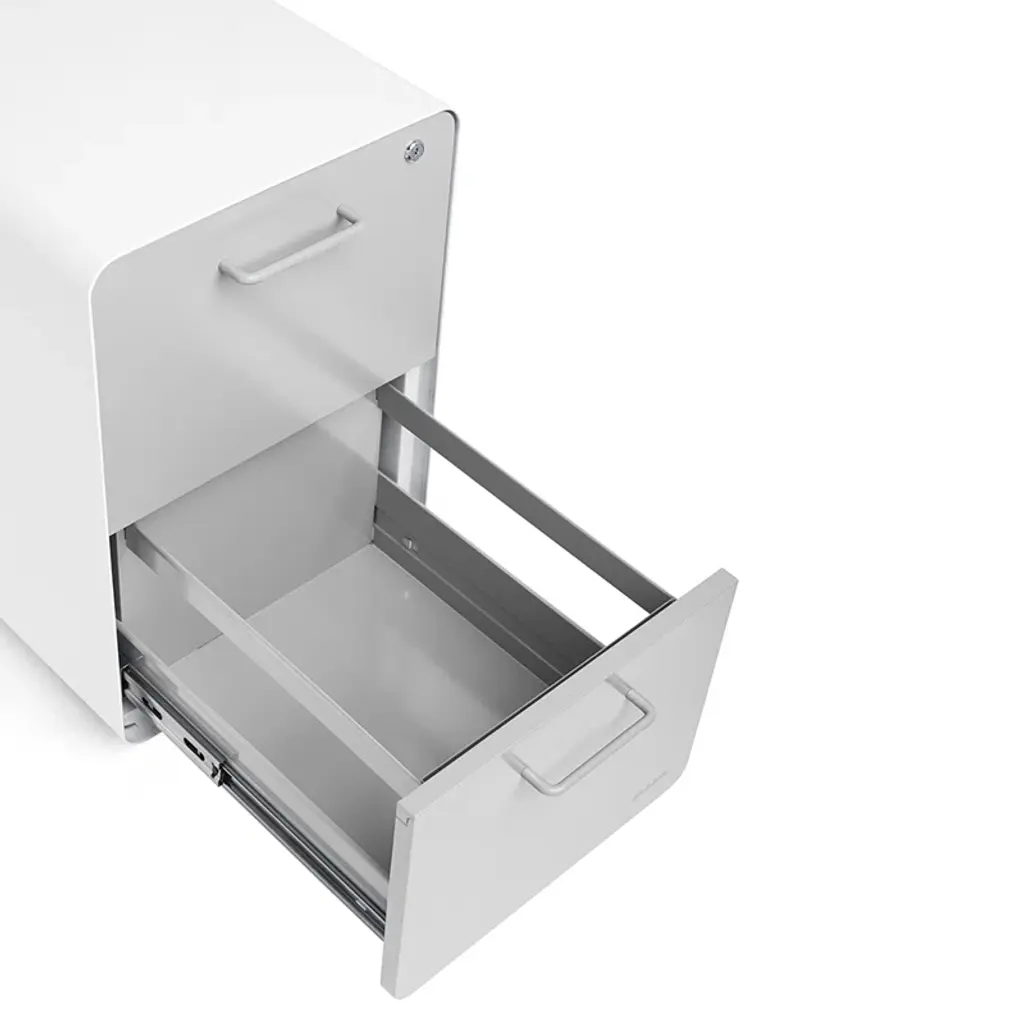 Our stow file cabinet is the stylish shelter your files are seeking. Powder-coated steel construction with peek-a-boo matching steel interior keeps documents and doo-dads super safe. Locking drawers and attachable casters with a full 360 ° swivel are bound to get you lockin' and rollin'.