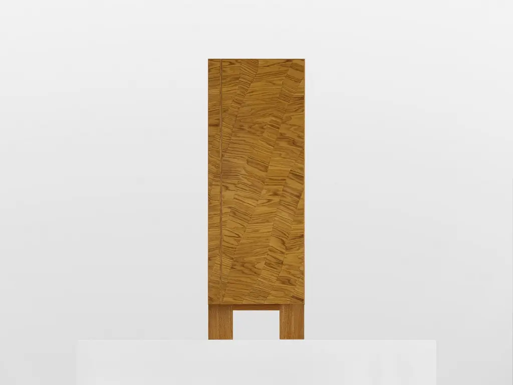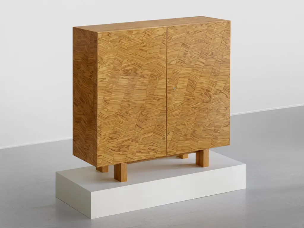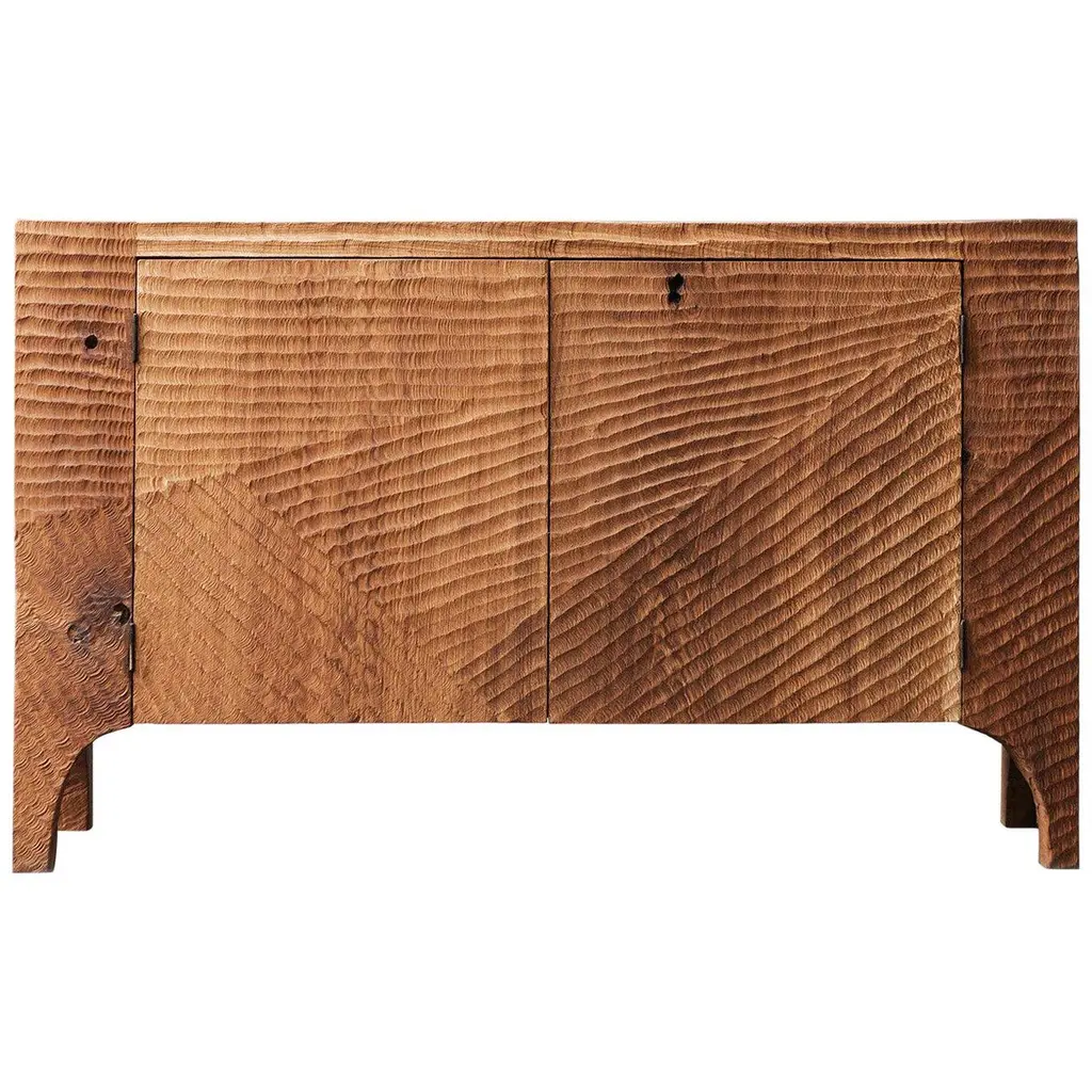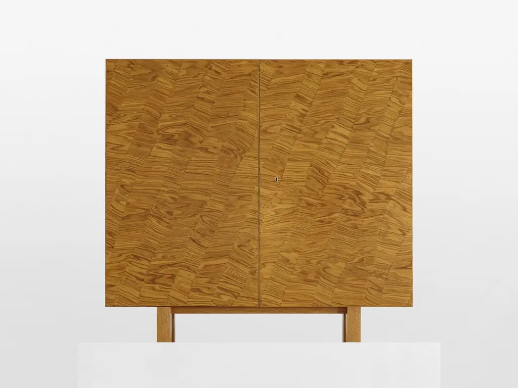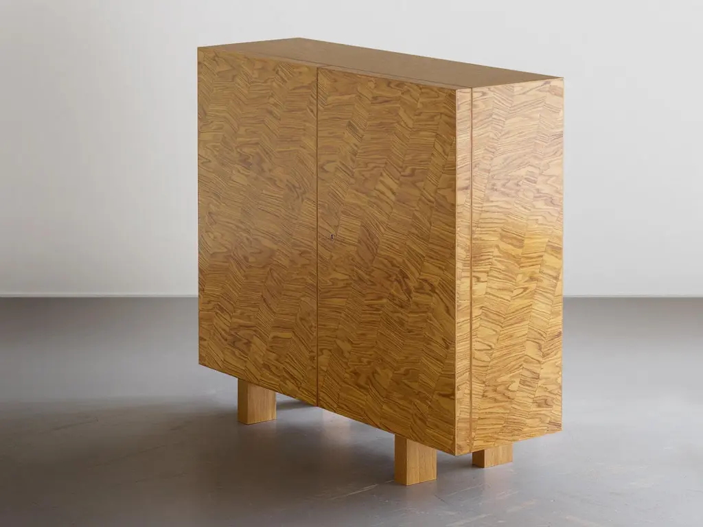 Strata Cabinet by SNICKERIETDimensions: D 40 x W 125 x H 115,7 cm. Materials: Oak veneer, solid oak, lacquer and wax.Smaller size adjustments are accepted without additional cost. Largeradjustments can be discussed as long as the furniture archetype is maintained. Please contact us.By manipulating wood grain patterns, Strata captures an expression inbetween the organic and the man-made. The surface consists of tangential layers of oak, veneered at an angle on top of each other, and carefully sanded down into a pattern inspired by the veining of sedimentary rock. The combination of wood grain patterns and stone vein formations creates a mesmerizing texture that draws the mind toward root or burl wood, yet is distinctly different through its repetition and distortion.The technique developed has its roots in conventional intarsia inlay, but inorder to find an expression more organic and naturally occurring, thegraphical nature of cut-out veneering has been replaced by an extensiveprocess of sanding down transitions between overlapping veneers. Continuing the approach of interpreted nature; all angles, shapes, and proportions of the cabinet relate to pi and the golden ratio. The subsurface of Strata is prepared to compensate for the irregularities caused by the sanding, resulting in a perfectly flush surface. The cabinet is finished with a glossy lacquer and a wax coating.SNICKERIET is a furniture studio with an explorative approach to traditional woodworking craft and philosophy. Projects are initiated as research into topics revolving technique, construction, decoration and material properties. The findings are released in the form of individual pieces of furniture. The studio was founded in 2011 and is based in Stockholm and Gothenburg.Karl-Johan Hjerling, designer, creative director, founderGunnar Dahl, Production manager, founderHannu Hietamäki, Lead cabinet makerRobert Zillén, Head of studio and client matters