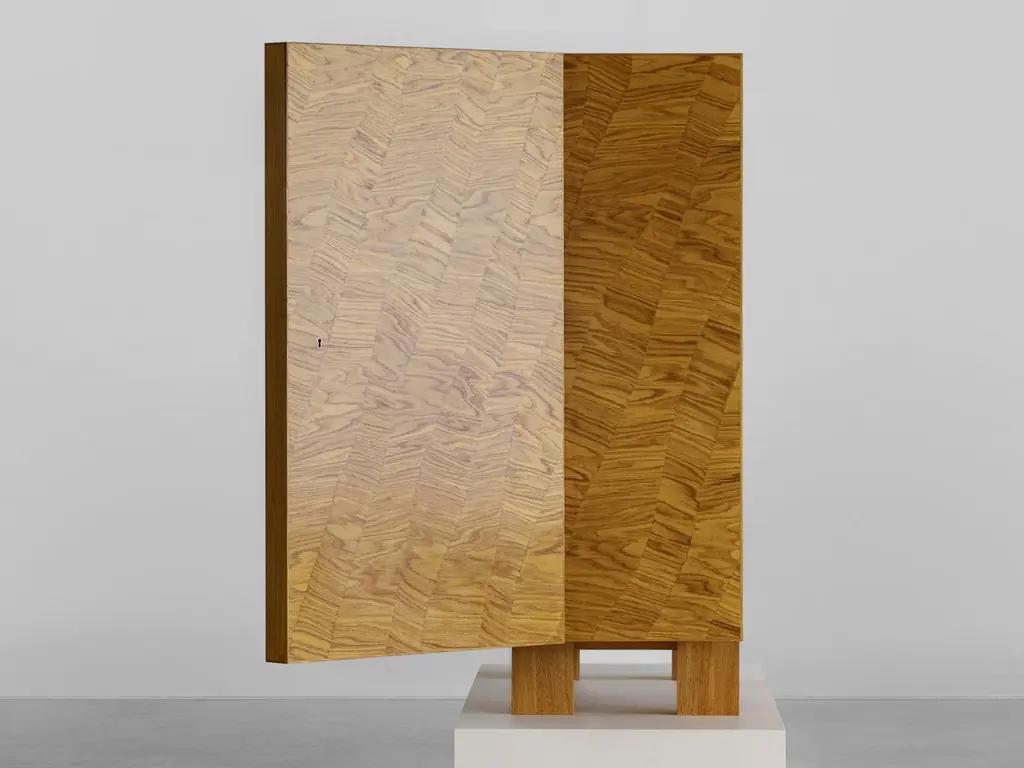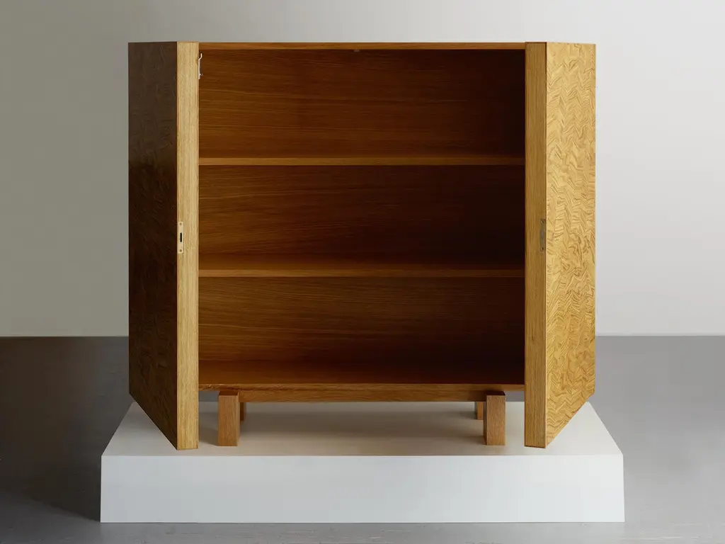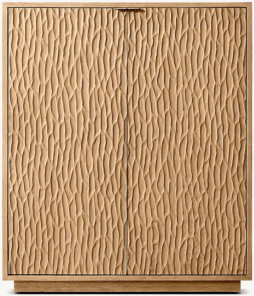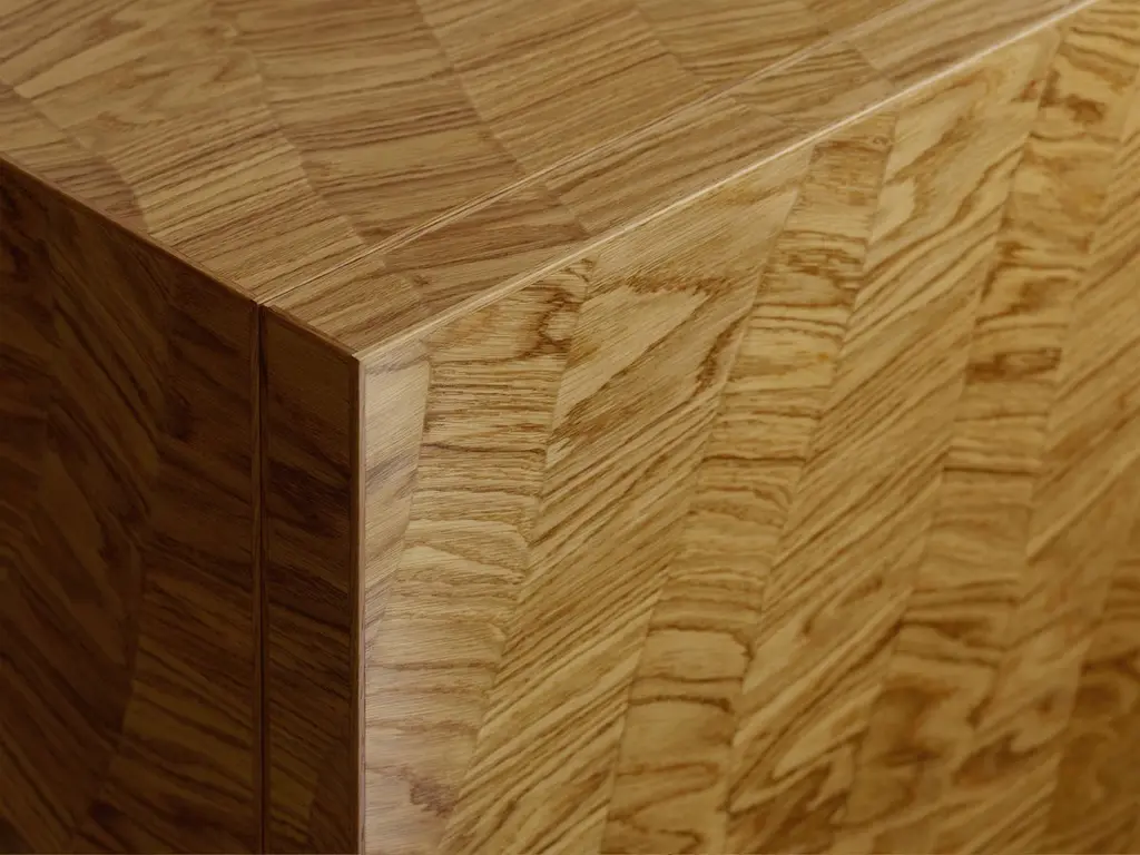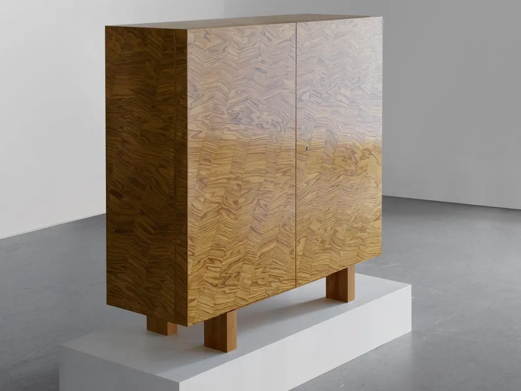 Strata Cabinet by SNICKERIETDimensions: D 40 x W 125 x H 115,7 cm. Materials: Oak veneer, solid oak, lacquer and wax.Smaller size adjustments are accepted without additional cost. Largeradjustments can be discussed as long as the furniture archetype is maintained. Please contact us.By manipulating wood grain patterns, Strata captures an expression inbetween the organic and the man-made. The surface consists of tangential layers of oak, veneered at an angle on top of each other, and carefully sanded down into a pattern inspired by the veining of sedimentary rock. The combination of wood grain patterns and stone vein formations creates a mesmerizing texture that draws the mind toward root or burl wood, yet is distinctly different through its repetition and distortion.The technique developed has its roots in conventional intarsia inlay, but inorder to find an expression more organic and naturally occurring, thegraphical nature of cut-out veneering has been replaced by an extensiveprocess of sanding down transitions between overlapping veneers. Continuing the approach of interpreted nature; all angles, shapes, and proportions of the cabinet relate to pi and the golden ratio. The subsurface of Strata is prepared to compensate for the irregularities caused by the sanding, resulting in a perfectly flush surface. The cabinet is finished with a glossy lacquer and a wax coating.SNICKERIET is a furniture studio with an explorative approach to traditional woodworking craft and philosophy. Projects are initiated as research into topics revolving technique, construction, decoration and material properties. The findings are released in the form of individual pieces of furniture. The studio was founded in 2011 and is based in Stockholm and Gothenburg.Karl-Johan Hjerling, designer, creative director, founderGunnar Dahl, Production manager, founderHannu Hietamäki, Lead cabinet makerRobert Zillén, Head of studio and client matters