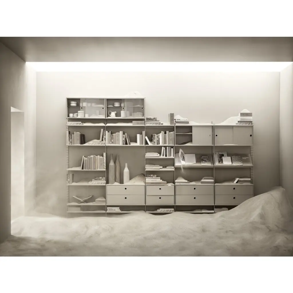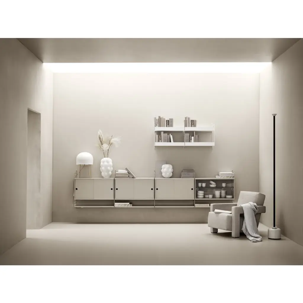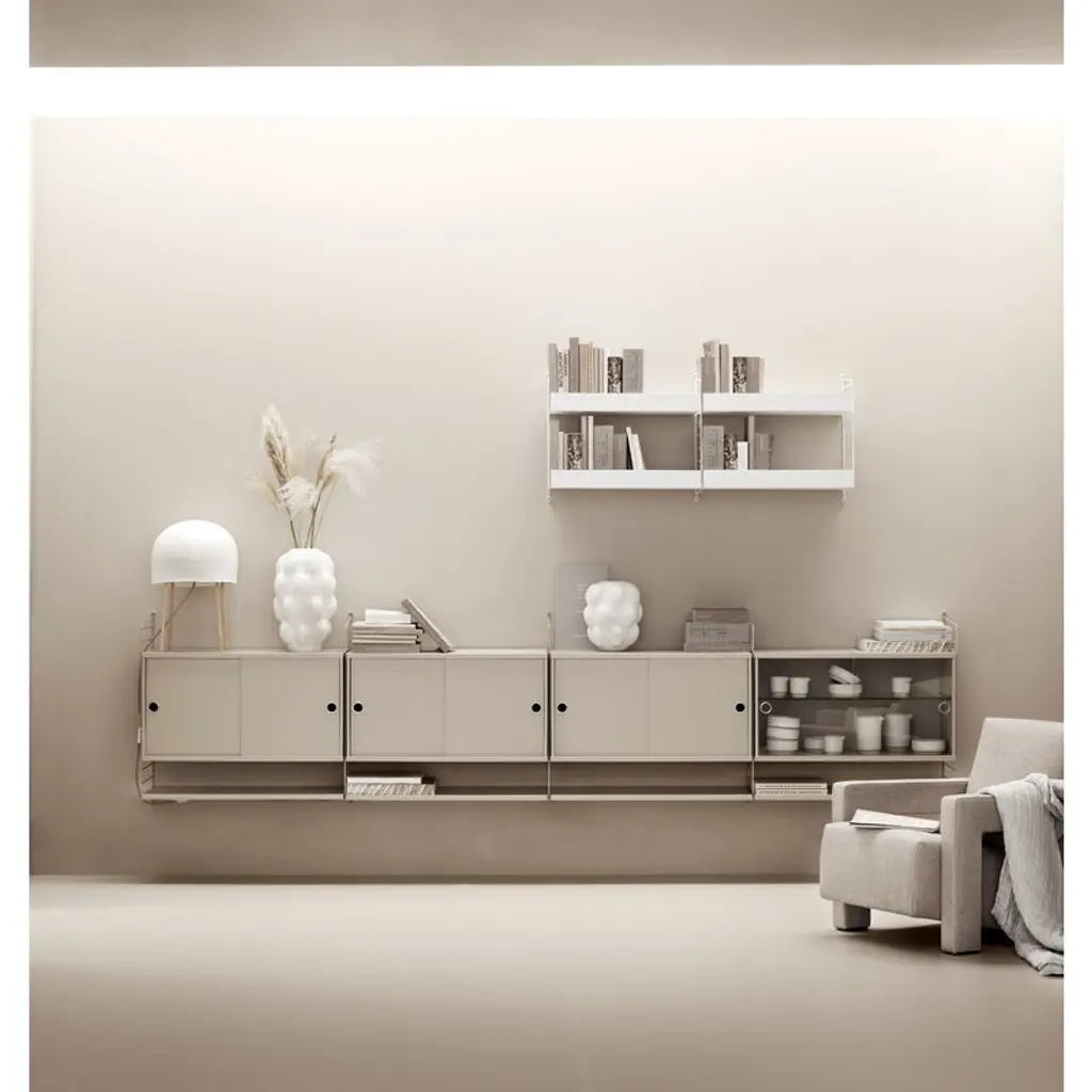 The String display cabinet with sliding glass doors complements the String shelving system in an elegant and practical manner. Suitable for all 11.81 in (30 cm) deep String panels, the display cabinet features two sliding glass doors and one adjustable shelf. This glass display cabinet provides beautiful and dust-free storage space for wine glasses and porcelain plates in the kitchen as well as decorative objects in the living room. String System is an iconic modular shelving system that was originally designed by Swedish architect Nils Strinning back in 1949. The signature ladder-like side panels can be combined with different shelves, magazine racks, work desks, folding tables, chests and cabinets, allowing you to create a customized system that best suits your needs. The timeless and minimalist design of the String System makes it an ideal choice for modern homes and offices, and the versatile shelving system can be endlessly expanded both vertically and horizontally. String Furniture remains dedicated to designing and manufacturing its products in Sweden.