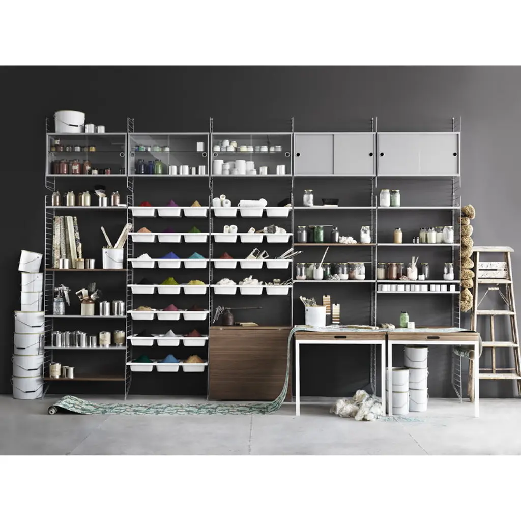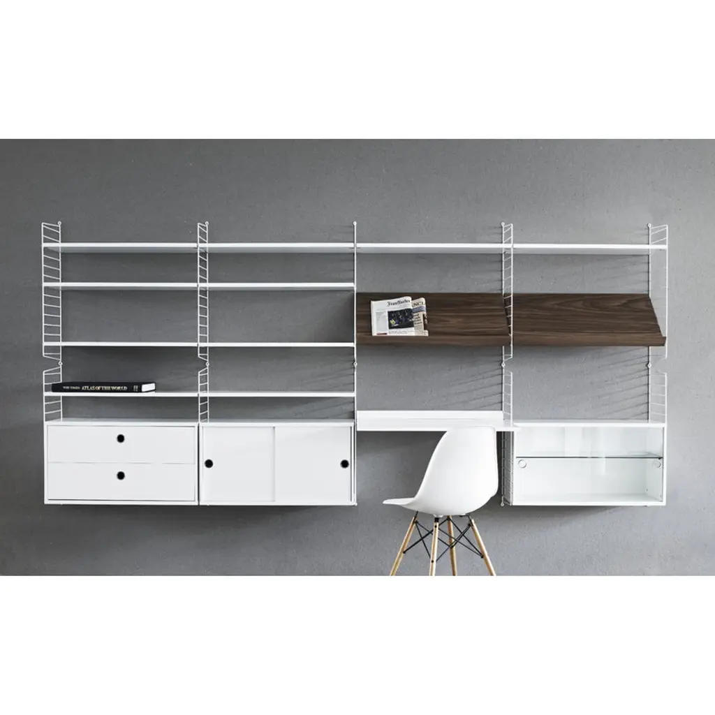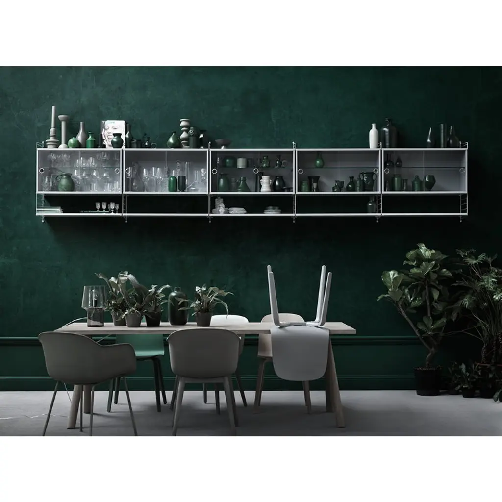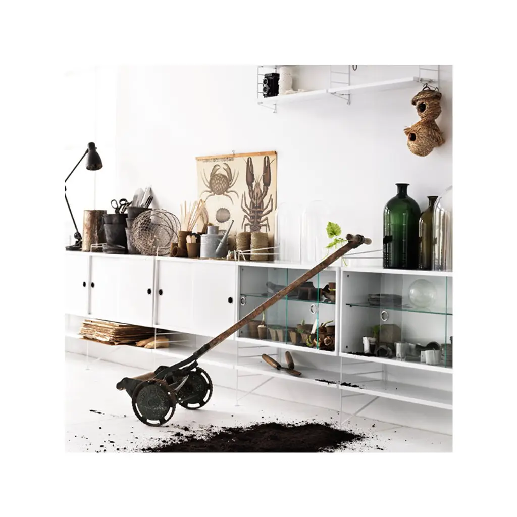 The String display cabinet with sliding glass doors complements the String shelving system in an elegant and practical manner. Suitable for all 11.81 in (30 cm) deep String panels, the display cabinet features two sliding glass doors and one adjustable shelf. This glass display cabinet provides beautiful and dust-free storage space for wine glasses and porcelain plates in the kitchen as well as decorative objects in the living room. String System is an iconic modular shelving system that was originally designed by Swedish architect Nils Strinning back in 1949. The signature ladder-like side panels can be combined with different shelves, magazine racks, work desks, folding tables, chests and cabinets, allowing you to create a customized system that best suits your needs. The timeless and minimalist design of the String System makes it an ideal choice for modern homes and offices, and the versatile shelving system can be endlessly expanded both vertically and horizontally. String Furniture remains dedicated to designing and manufacturing its products in Sweden.