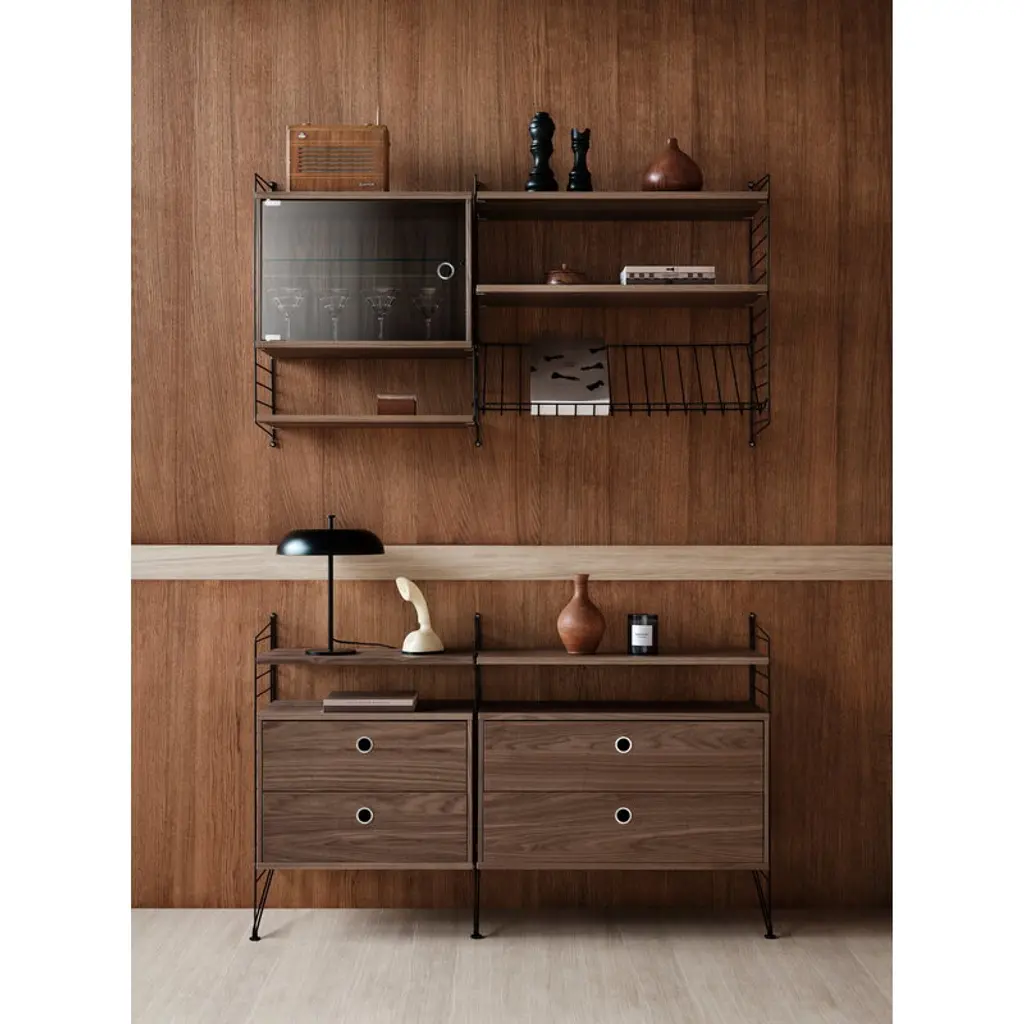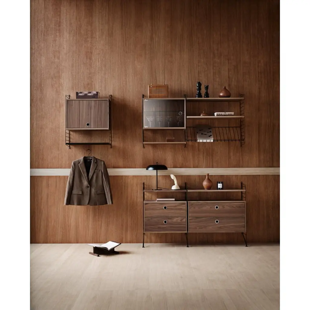 The String display cabinet with a swing glass door complements the String shelving system in an elegant and practical manner. Suitable for all 11.81 in (30 cm) deep String panels, the display cabinet features a hinged glass door and one adjustable shelf. This small glass display cabinet provides beautiful and dust-free storage space for wine glasses and porcelain plates in the kitchen as well as decorative objects in the living room. String System is an iconic modular shelving system that was originally designed by Swedish architect Nils Strinning back in 1949. The signature ladder-like side panels can be combined with different shelves, magazine racks, work desks, folding tables, chests and cabinets, allowing you to create a customized system that best suits your needs. The timeless and minimalist design of the String System makes it an ideal choice for modern homes and offices, and the versatile shelving system can be endlessly expanded both vertically and horizontally. String Furniture remains dedicated to designing and manufacturing its products in Sweden.