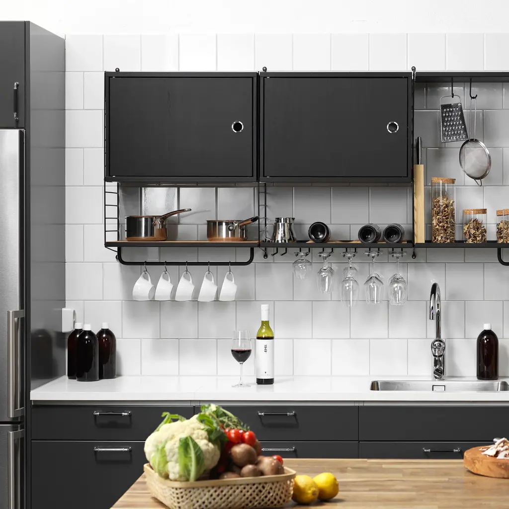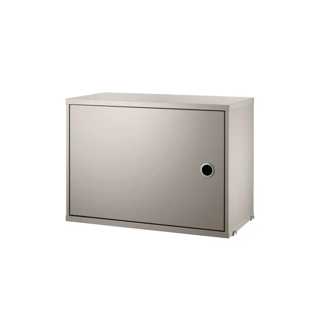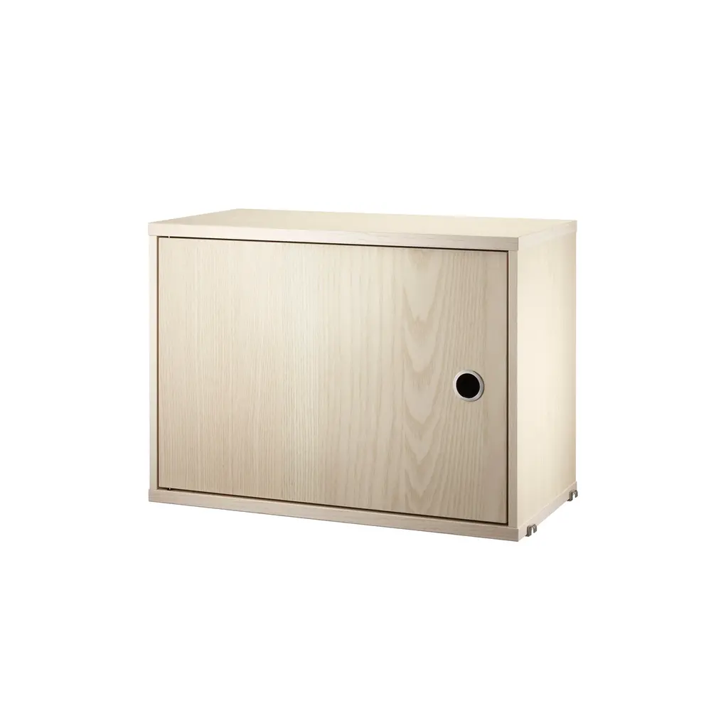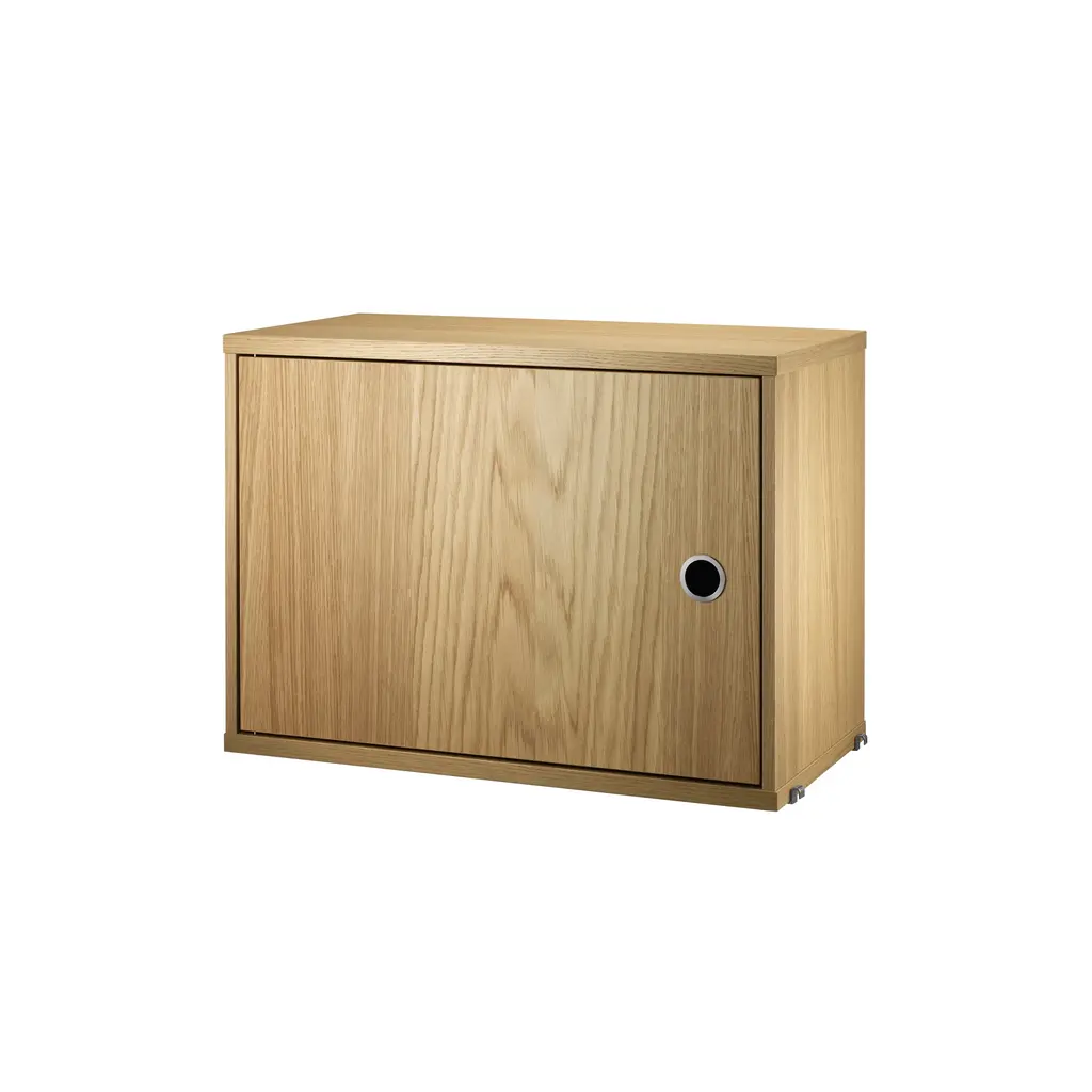 String adds a roomy cabinet with an easily opened swing door as an appealing storage option for its wall system. Available in woodgrain veneer or solid-color MDF with a lacquer finish, it also brings a visually pleasing note as a bolder element in a configuration. The door can be mounted to open on either side of the cabinet and the unit includes an adjustable interior shelf.