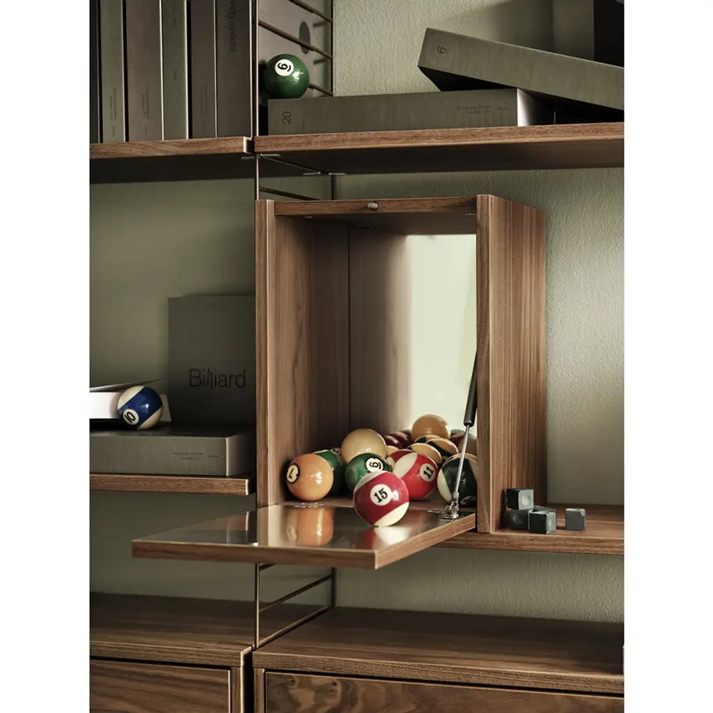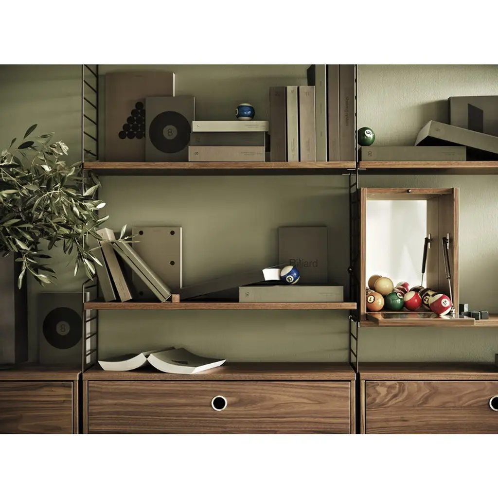 The tiny String cabinet is an elegant, little box, that complements the String shelving system: the piece is to be placed on top of the shelf and attached to the side panel. The inside of the cabinet's door is finished with a plate made of brushed stainless steel and the back wall with a mirror. The drop-down door cabinet stores household items or, on the other hand, displays them beautifully. String System is an iconic modular shelving system that was originally designed by Swedish architect Nils Strinning back in 1949. The signature ladder-like side panels can be combined with different shelves, magazine racks, work desks, folding tables, chests and cabinets, allowing you to create a customized system that best suits your needs. The timeless and minimalist design of the String System makes it an ideal choice for modern homes and offices, and the versatile shelving system can be endlessly expanded both vertically and horizontally. String Furniture remains dedicated to designing and manufacturing its products in Sweden.
