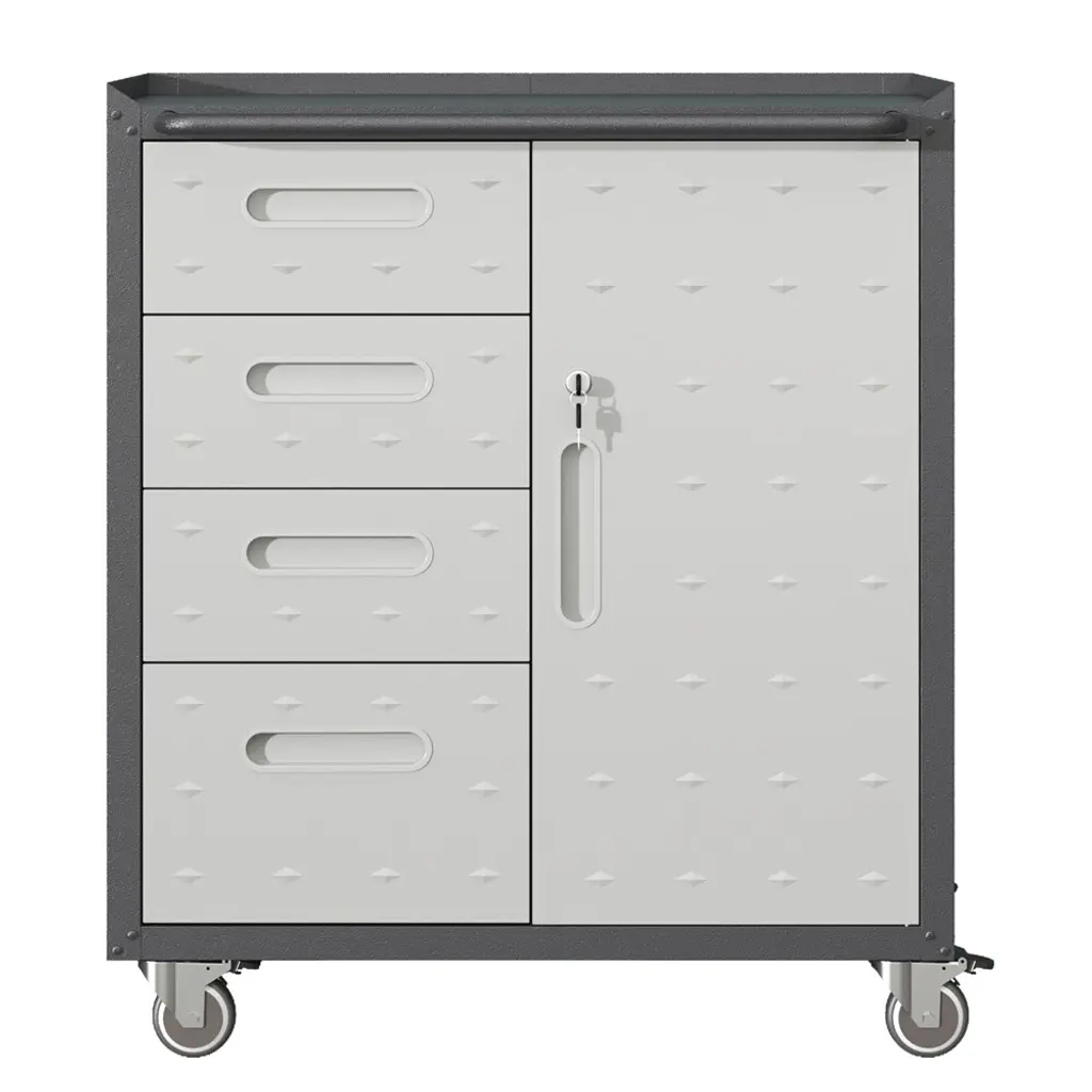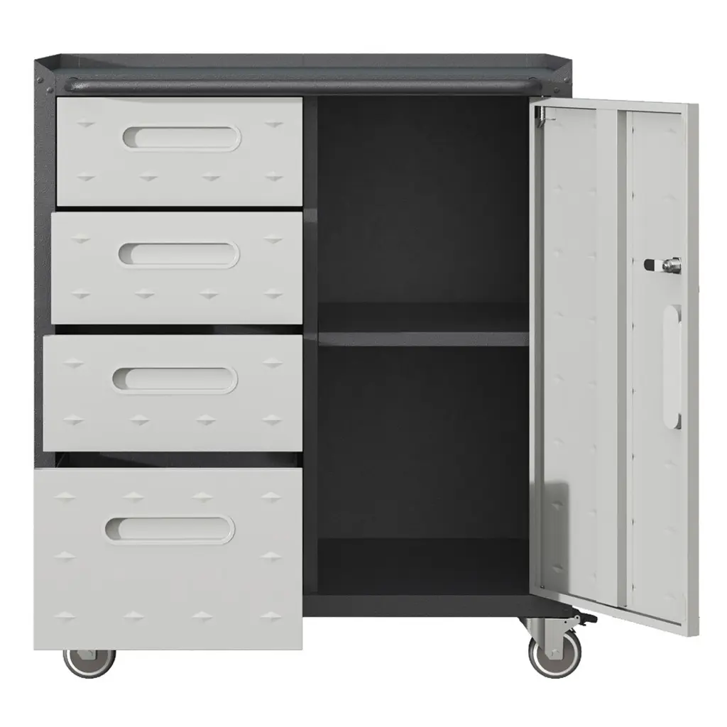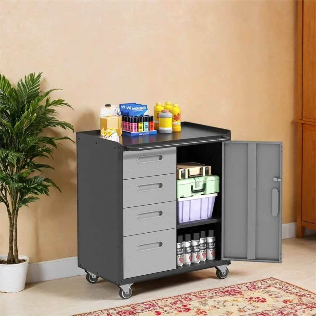 Product Features Size and space: The size is 29.53 inches wide, 16.54 inches deep and 34.65 inches high, which provides sufficient storage space without occupying too much space. Mobility and stability: equipped with 360 lockable casters, it can not only achieve smooth movement, but also achieve stable positioning by locking casters, and the casters are detachable. Structure and design: the top surface is convex, which can prevent items from rolling down, and is suitable for adding wooden boards to build DIY workstations; There are four small drawers on the left side to facilitate the classification of articles, and a lockable storage space with adjustable internal shelves on the right side; Equipped with ergonomic metal tube handle, easy to move; The shelf is adjustable and can adapt to different sizes and types of articles. Material and safety: it is made of cold-rolled steel, which is durable and can withstand daily wear and tear; The surface is coated with powder, which is environmentally friendly and does not contain formaldehyde, ensuring a safe and healthy storage environment. Installation and application: widely used, suitable for storing tools, documents and other items in offices, garages and warehouses; The assembly is simple, and it can be completed in about 30 minutes. It is equipped with all necessary tools, gloves and magnetic screwdrivers, and you can also watch teaching videos through QR codes.