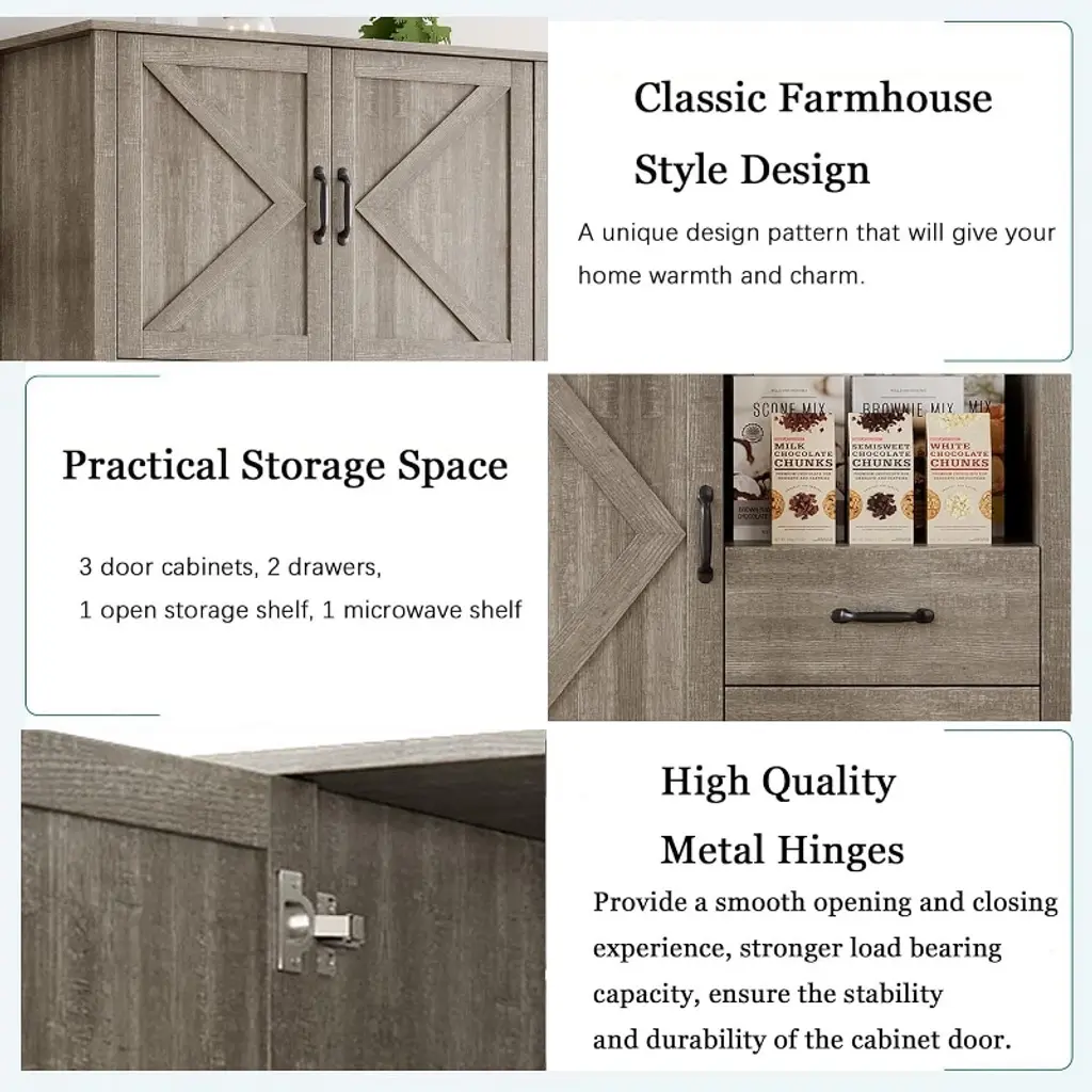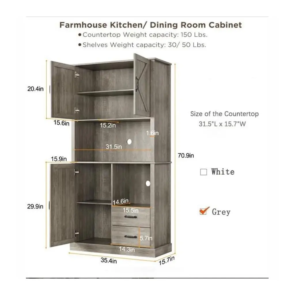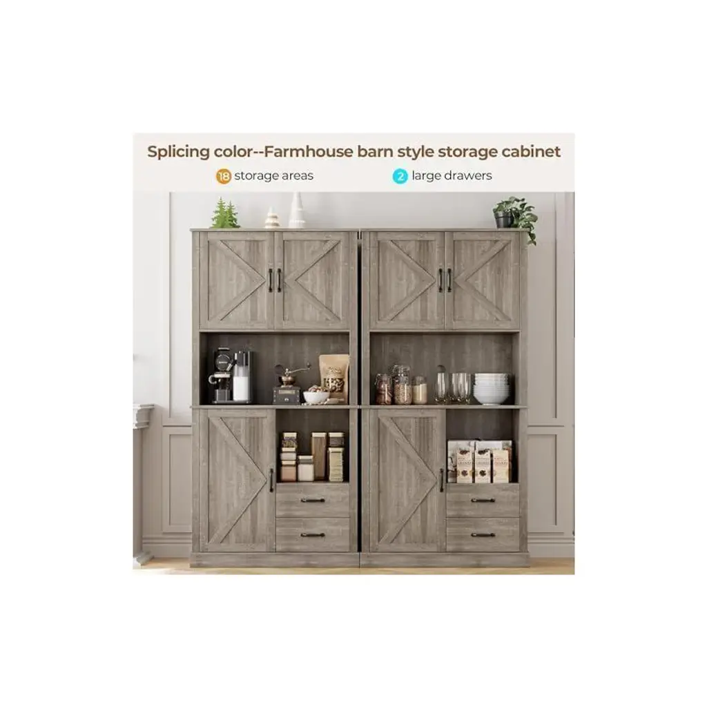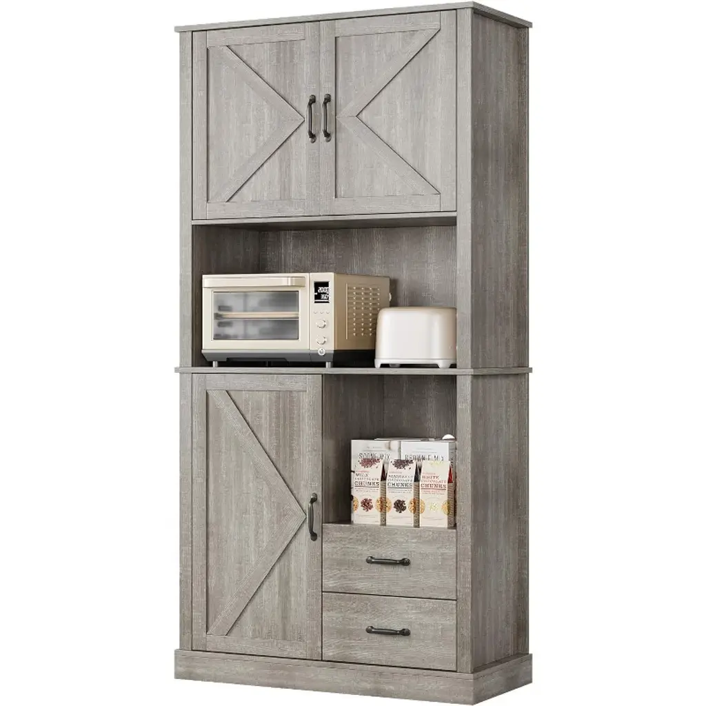 Transform your kitchen or dining area with our stylish Kitchen Pantry Cabinet. This tall hutch stands at 71 inches, offering ample storage with two spacious drawers, two open compartments, and three enclosed cabinets. Crafted from premium particle board, it features a durable construction designed for everyday use, complemented by anti-tip hardware for stability. The smart cable management system ensures that your microwave or coffee maker can be easily integrated without unsightly cords showing. Its chic farmhouse design—with charming barn doors and matte black handles—brings a touch of rustic elegance to your home, making it a perfect addition to any decor. Designed with versatility in mind, this cabinet can serve as a kitchen cupboard, coffee bar, or dining room hutch, adapting to your organizational needs. Assembly is a breeze with easy-to-follow instructions, allowing you to quickly set up and enjoy your new furniture. Pair multiple units for even more stylish storage solutions, creating a beautifully organized and functional space.