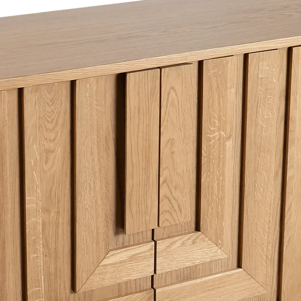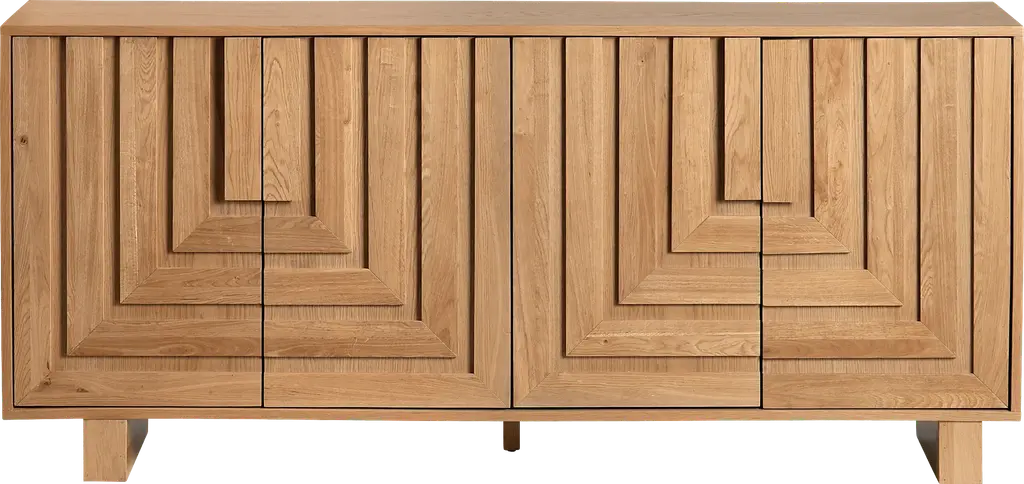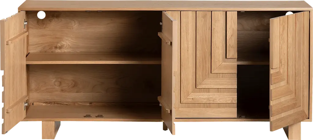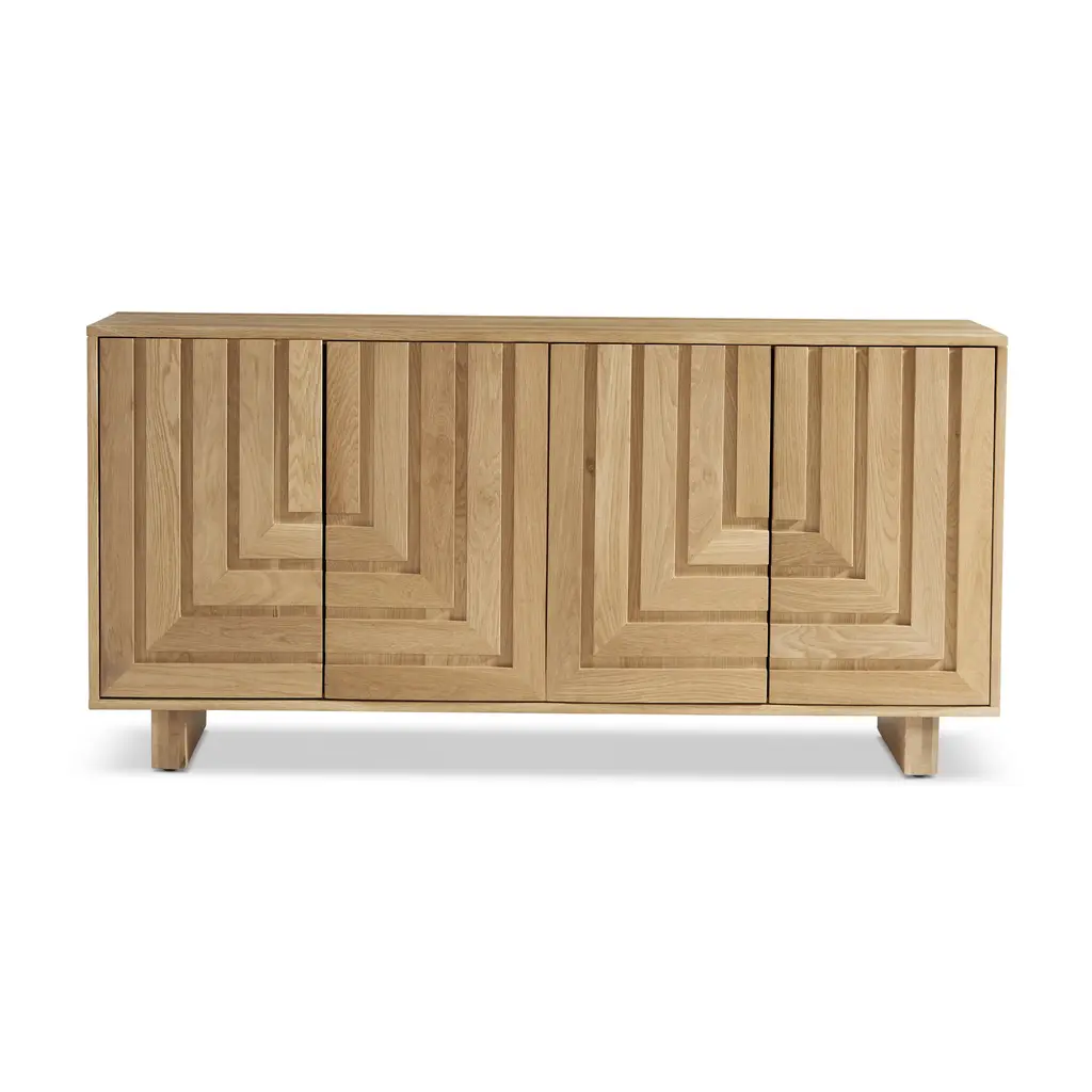 Crafted from solid oak wood, the Sunbeat brown sideboard showcases a natural brown wood grain finish that enhances its organic appeal. The rectangular design features four intricately paneled wooden doors with European hinges and magnetic closures, concealing two spacious cabinets with interior shelves for organized storage. Two cord management holes at the back keep wires neatly tucked away, while the sturdy base ensures durability. Customer assembly is required.