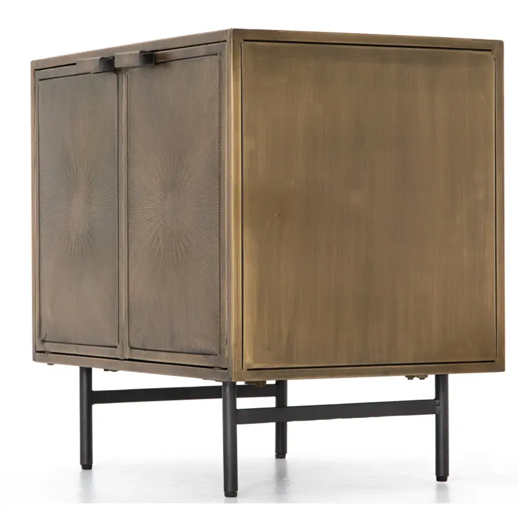 Evocative of Hollywood Regency glamour, aged brass-finished iron is etched with a striking sunburst pattern for a unique look with a hint of glam. H-stretcher legs of gunmetal-finished iron add a touch of industrial influence. Great solo or in pairs.