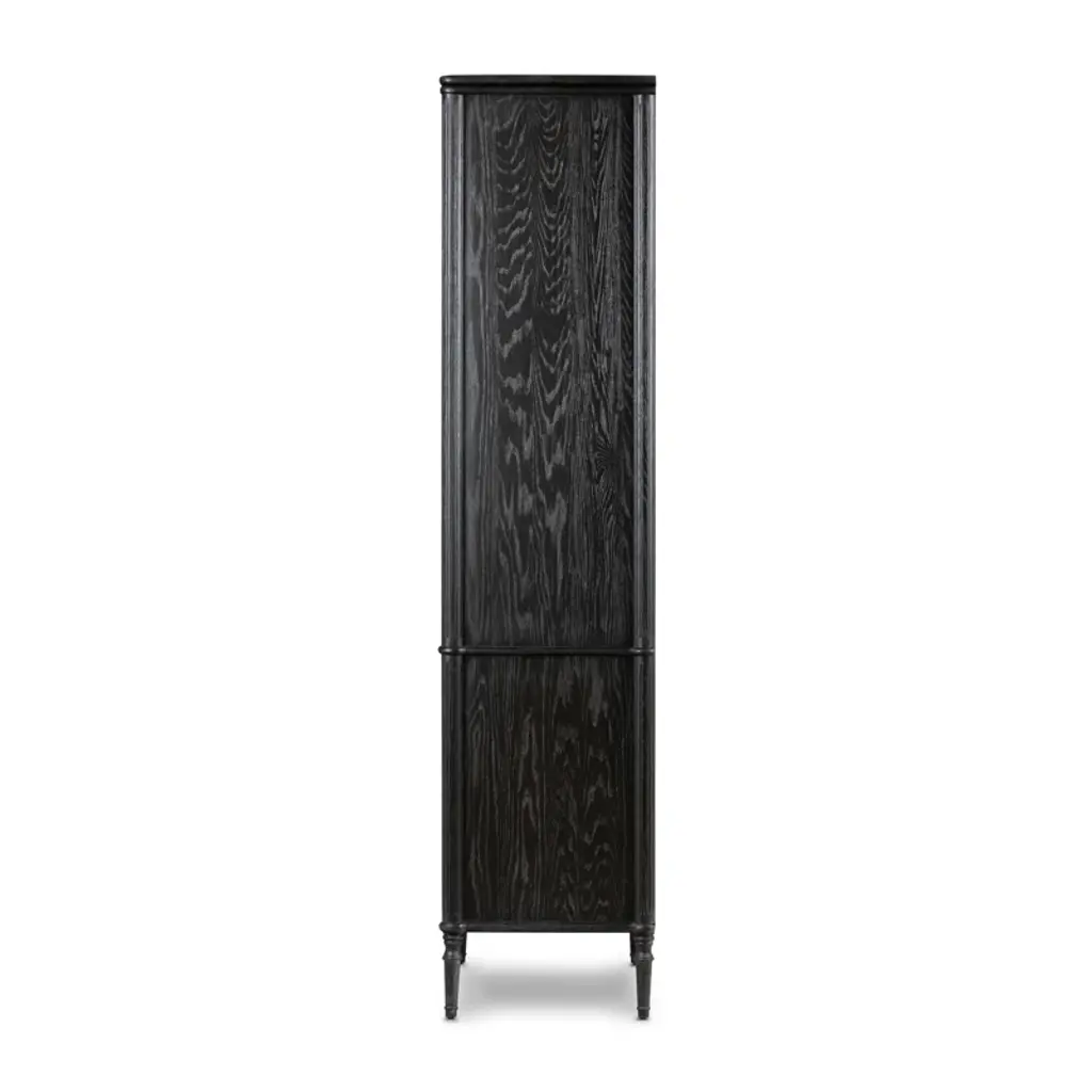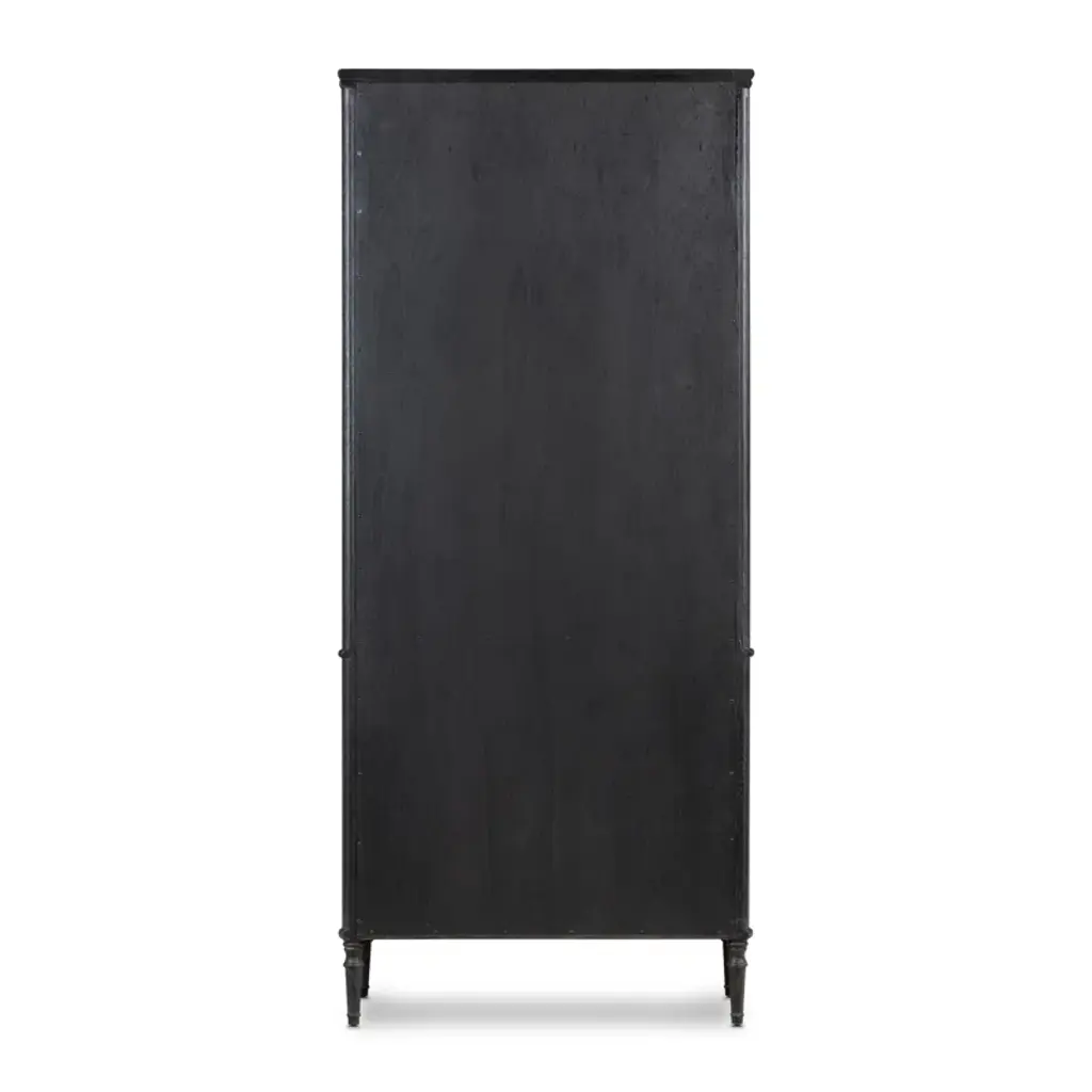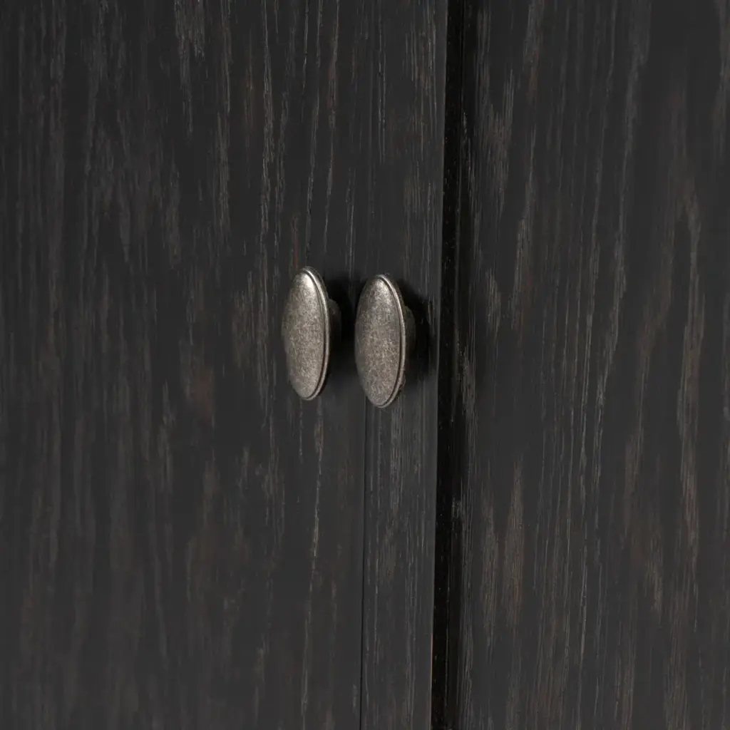 Framed panels, subtly softened corners and tapered spindle legs speak to the vintage European inspiration behind this spacious cabinetry style. Made from solid oak and oak veneer and finished in a distressed black.