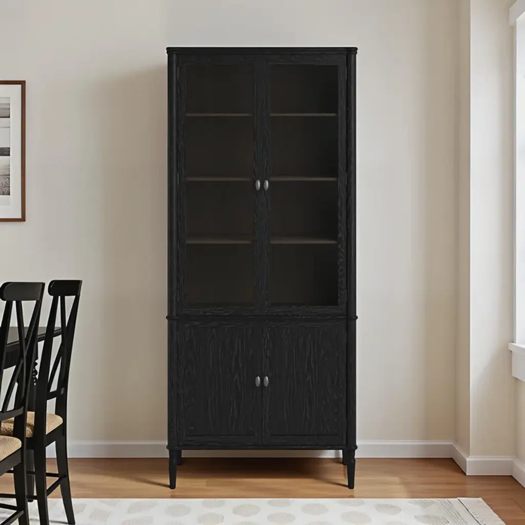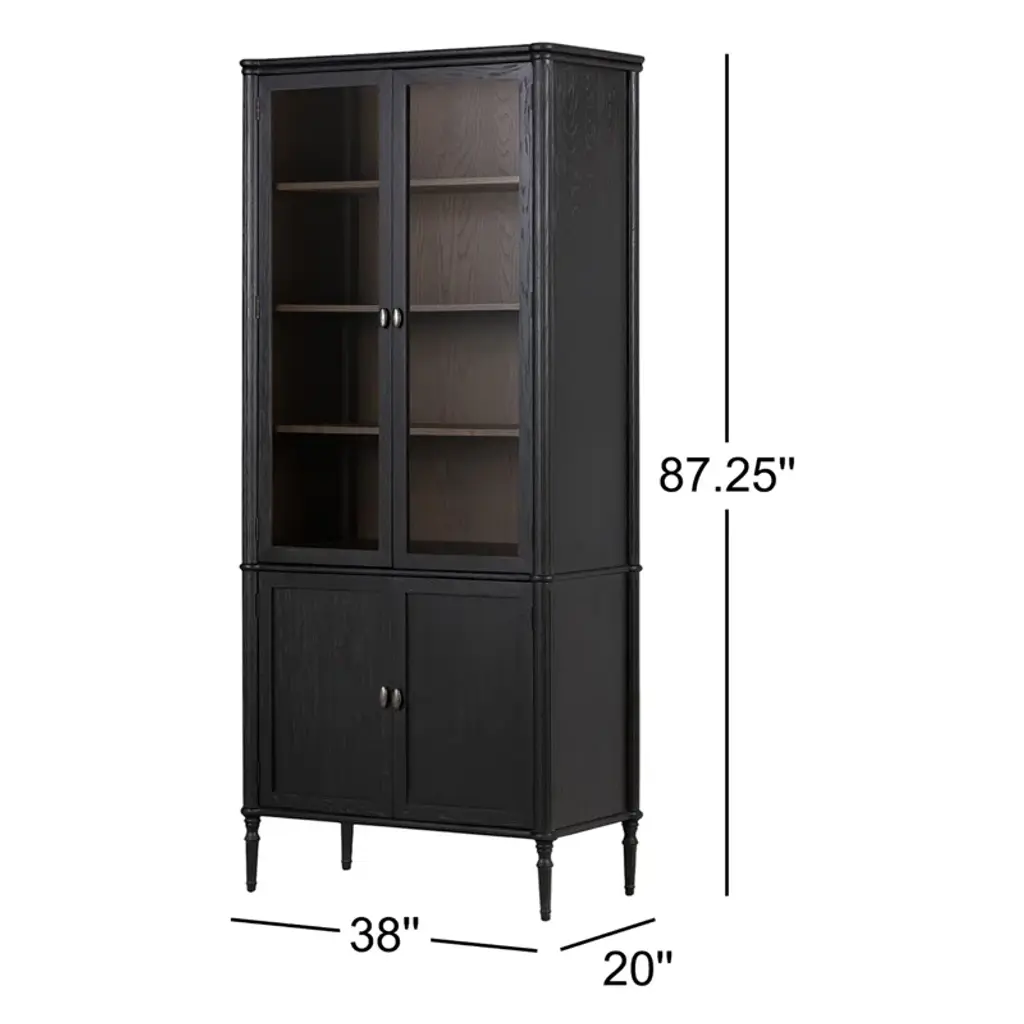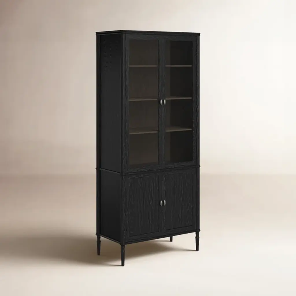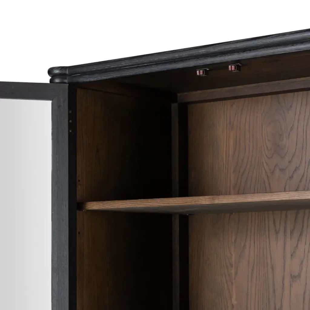 Framed panels, subtly softened corners and tapered spindle legs speak to the vintage European inspiration behind this spacious cabinetry style. Made from solid oak and oak veneer and finished in a distressed black.