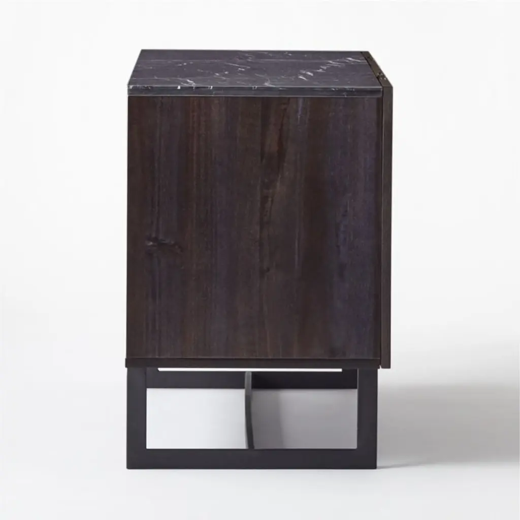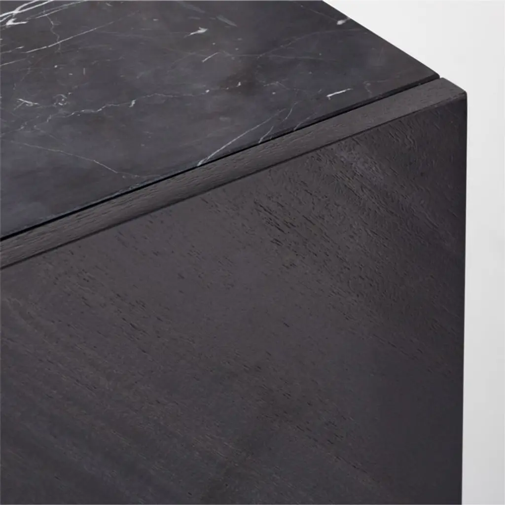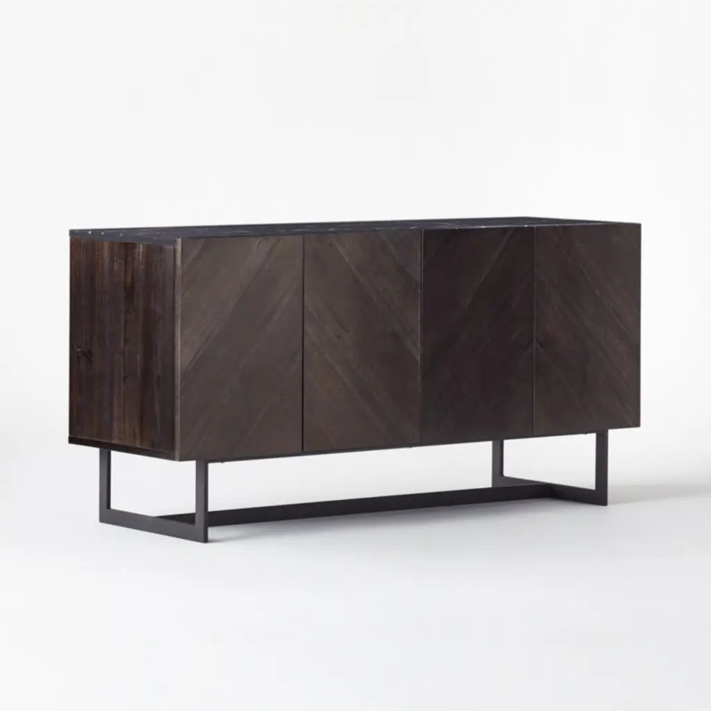 Designed by Melbourne-based VUUE, four-door walnut media console spotlights the richness of natural materials with a Marquina black marble top. Precisely cut panels of charcoal-finished walnut angle diagonally on the cabinet doors, creating an organic chevron pattern. Emphasizing the beauty of the wood grain, the doors open via discreet grooved channels to reveal two adjustable shelves inside. Shelves stop just short of the back of the console to feed cords through hidden cutouts with ease. CB2 exclusive.