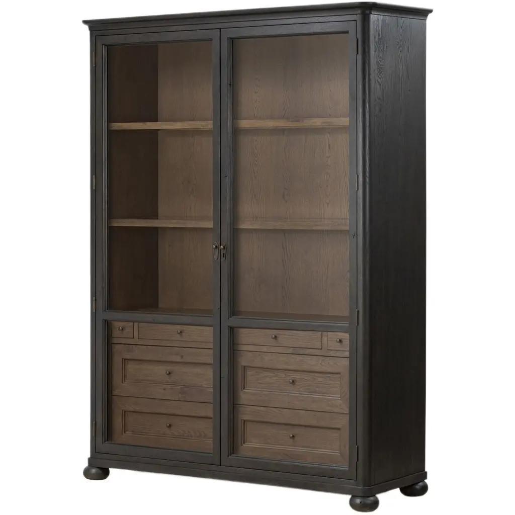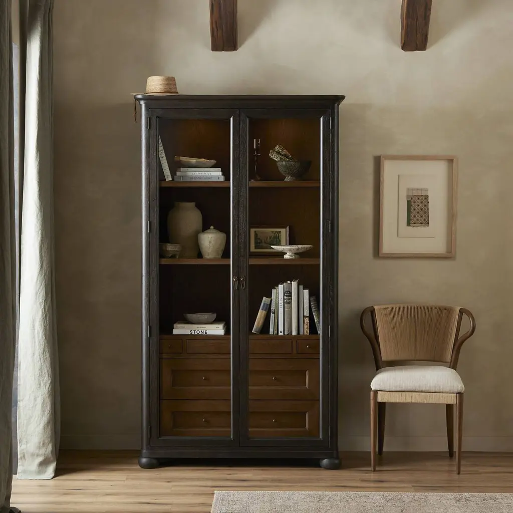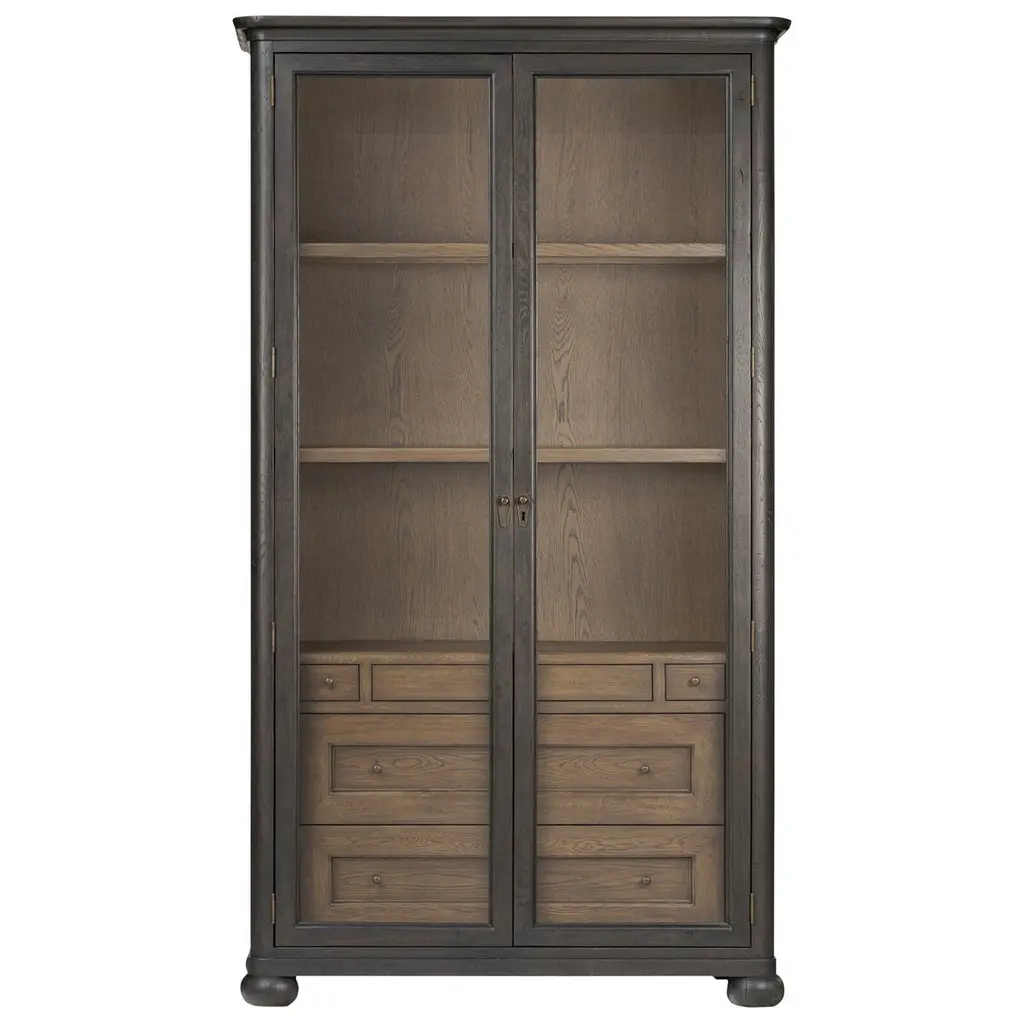 Rich in details, this cabinet features rounded edges, bun feet, and a smooth cornice on top, complete with glass doors and faux key plates for added character. Inside, drawers of varied sizes and shelves offer ample storage options. Two puck lights provide accent lighting. A design collaboration by Amber Lewis and Four Hands.