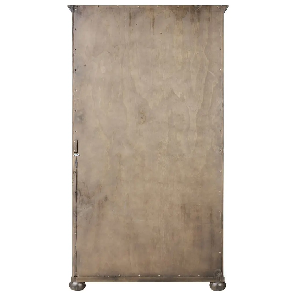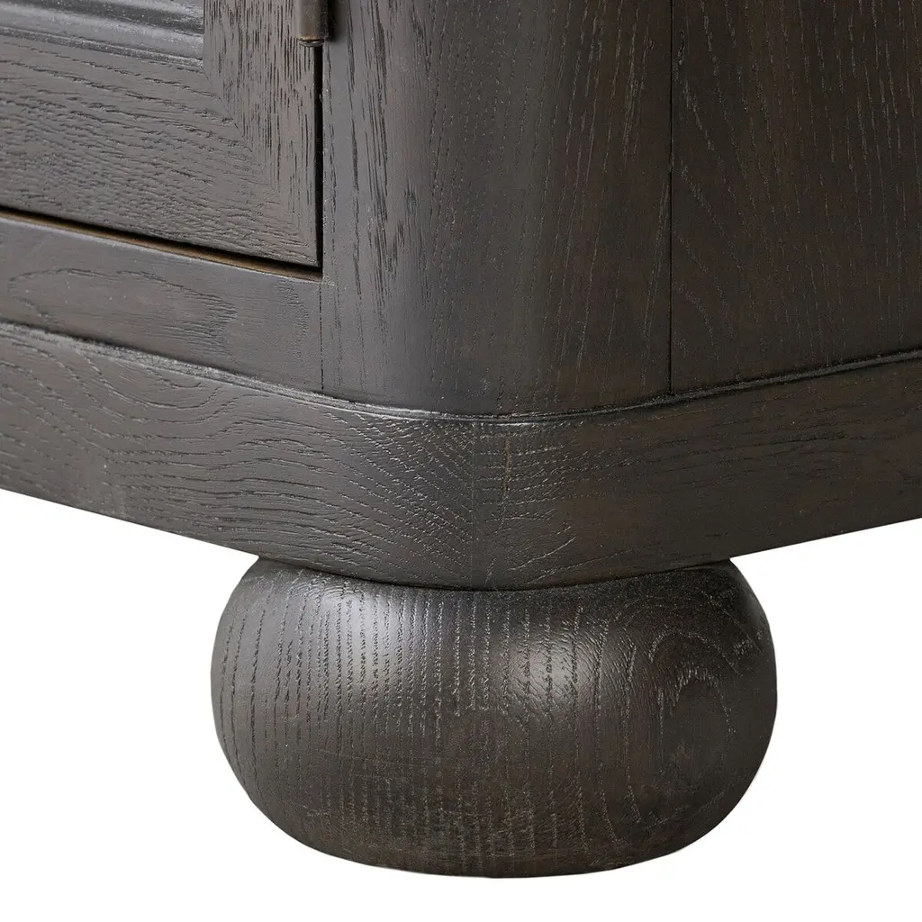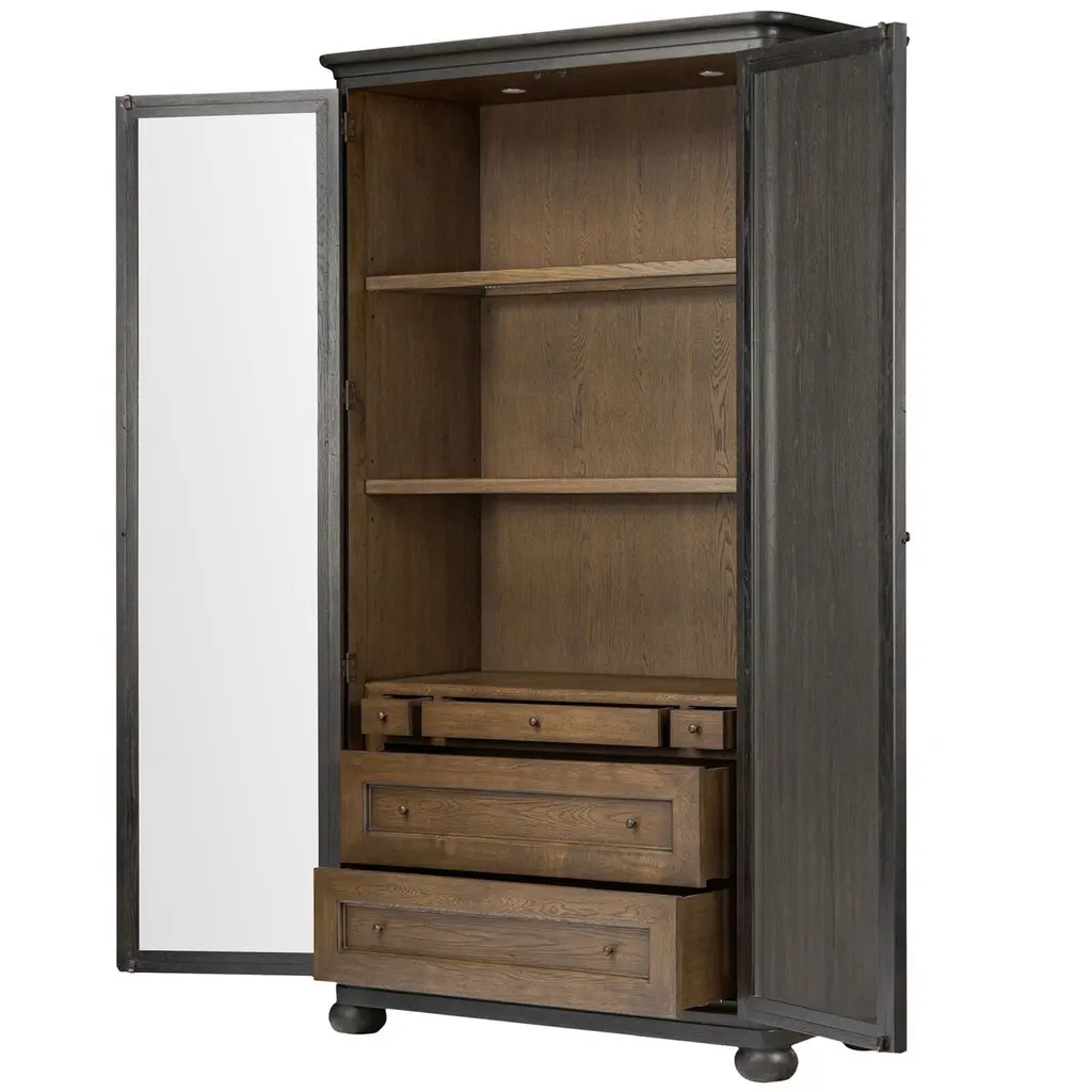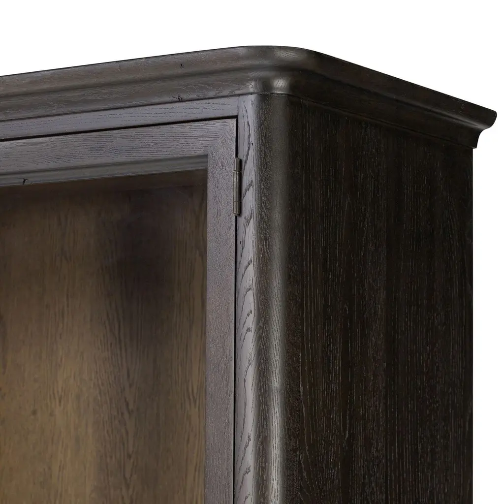 Rich in details, this cabinet features rounded edges, bun feet, and a smooth cornice on top, complete with glass doors and faux key plates for added character. Inside, drawers of varied sizes and shelves offer ample storage options. Two puck lights provide accent lighting. A design collaboration by Amber Lewis and Four Hands.