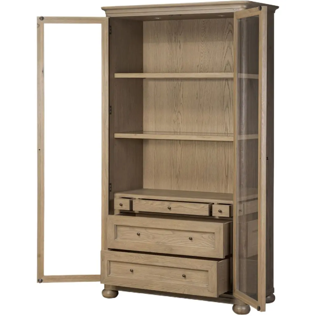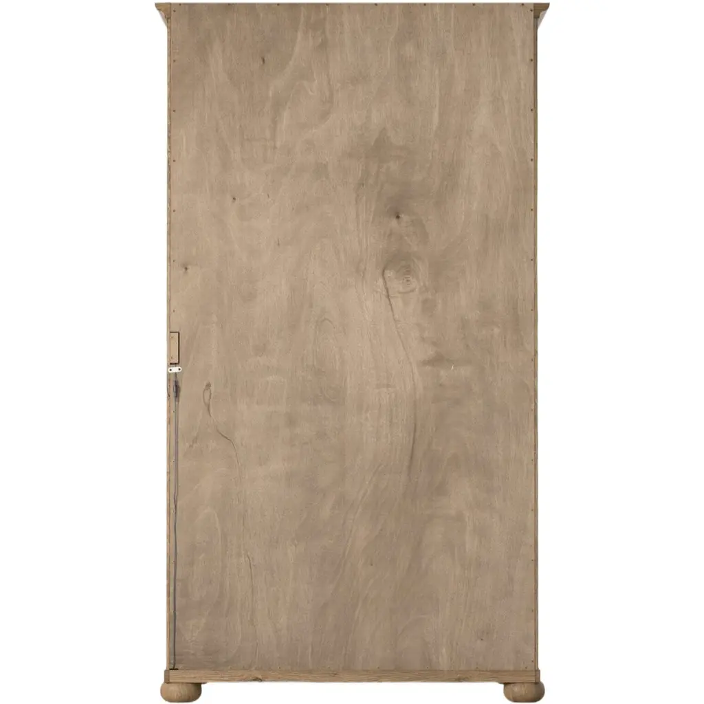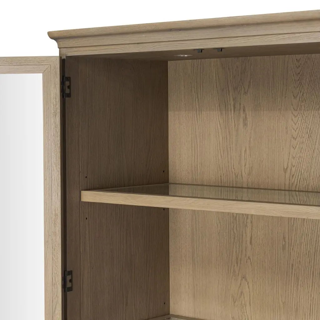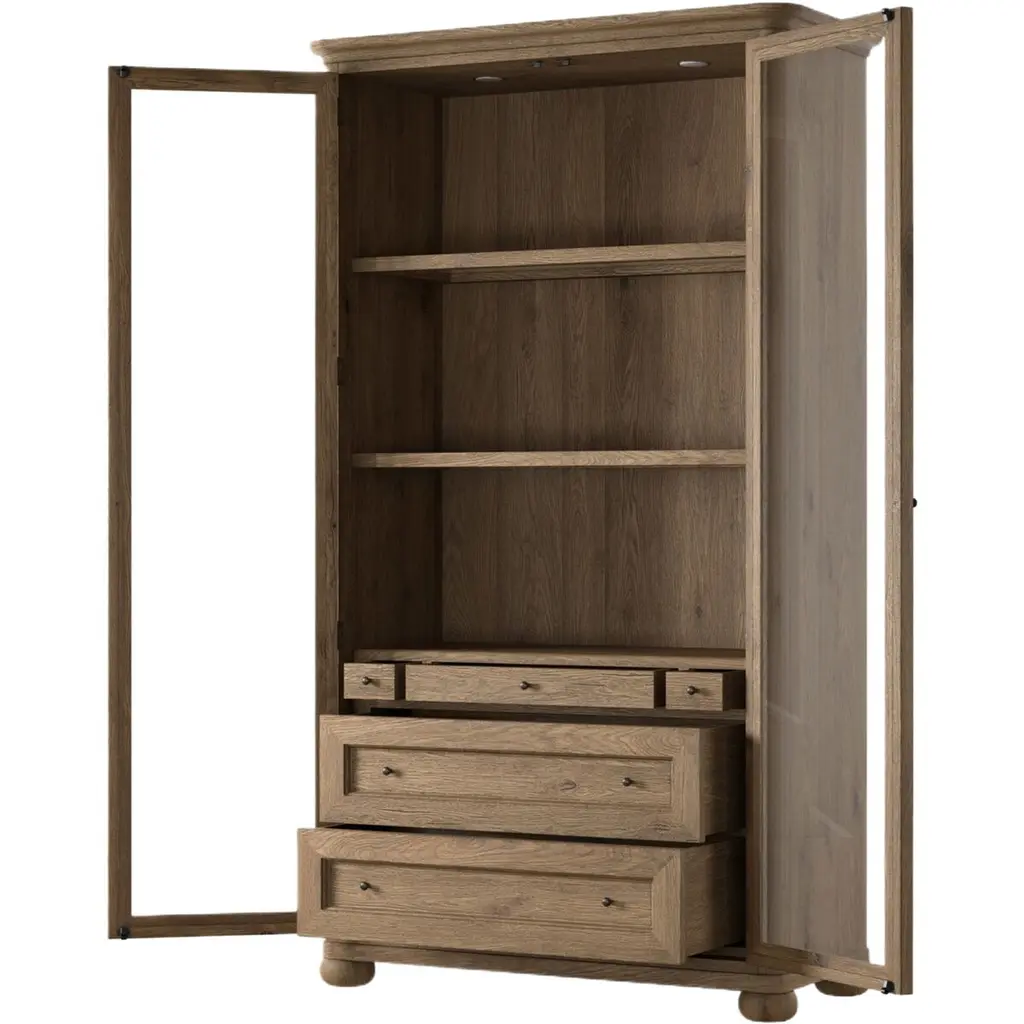 Rich in details, this cabinet features rounded edges, bun feet, and a smooth cornice on top, complete with glass doors and faux key plates for added character. Inside, drawers of varied sizes and shelves offer ample storage options. Two puck lights provide accent lighting. A design collaboration by Amber Lewis and Four Hands.
