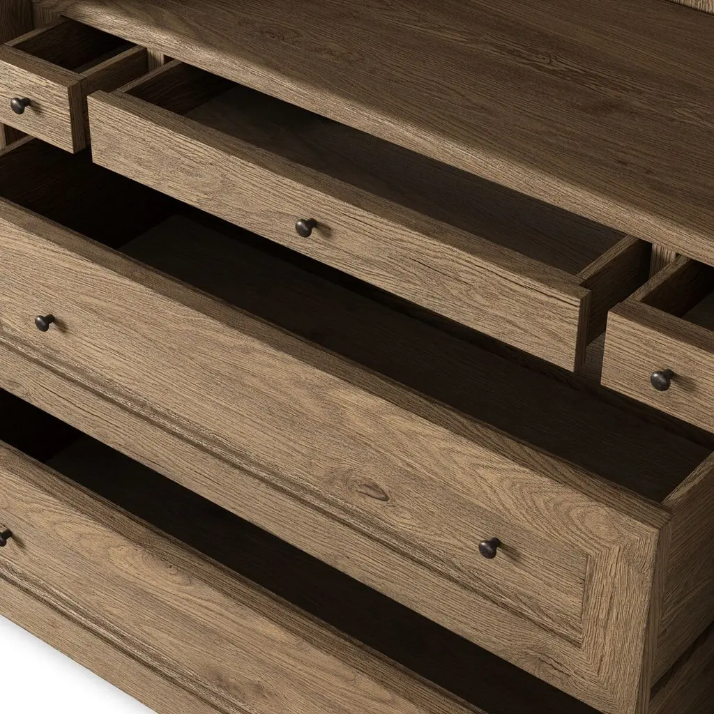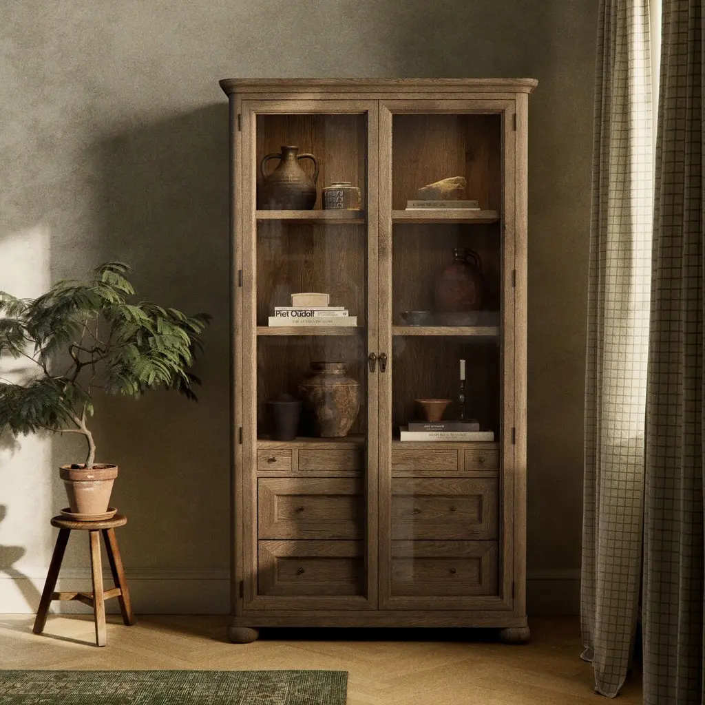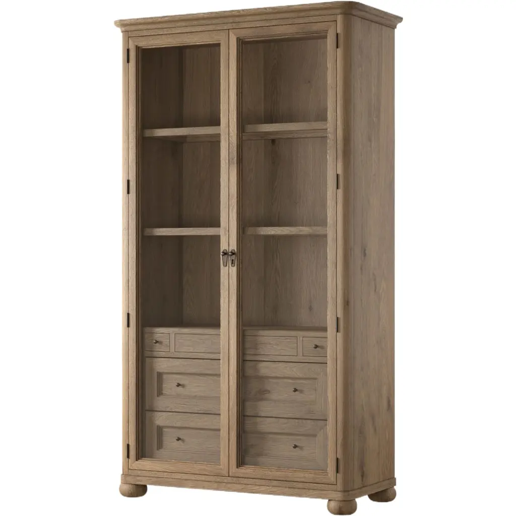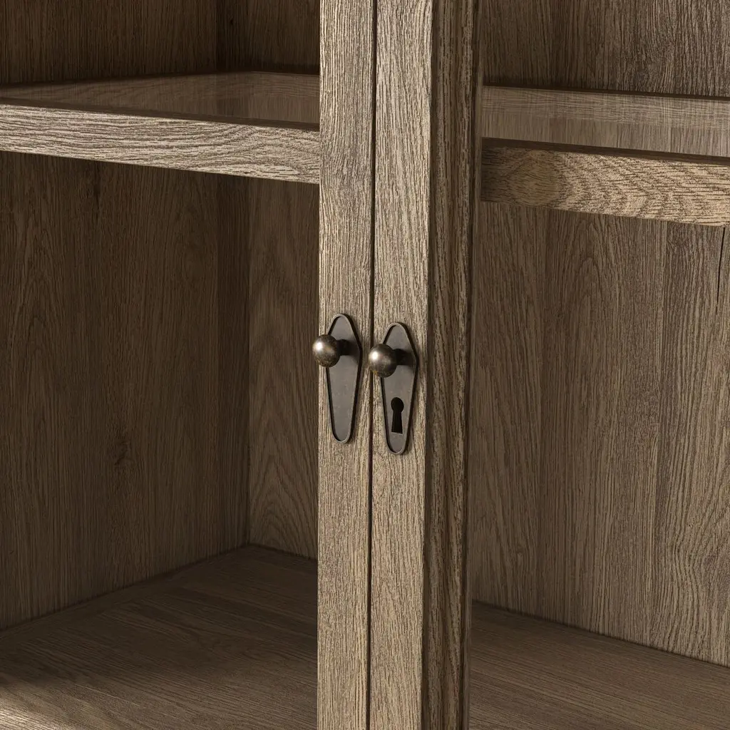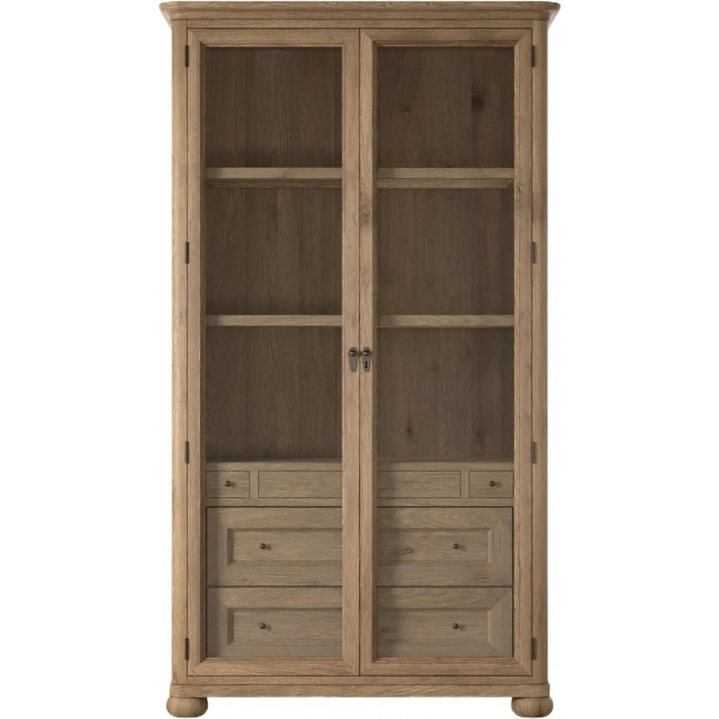 Rich in details, this cabinet features rounded edges, bun feet, and a smooth cornice on top, complete with glass doors and faux key plates for added character. Inside, drawers of varied sizes and shelves offer ample storage options. Two puck lights provide accent lighting. A design collaboration by Amber Lewis and Four Hands.