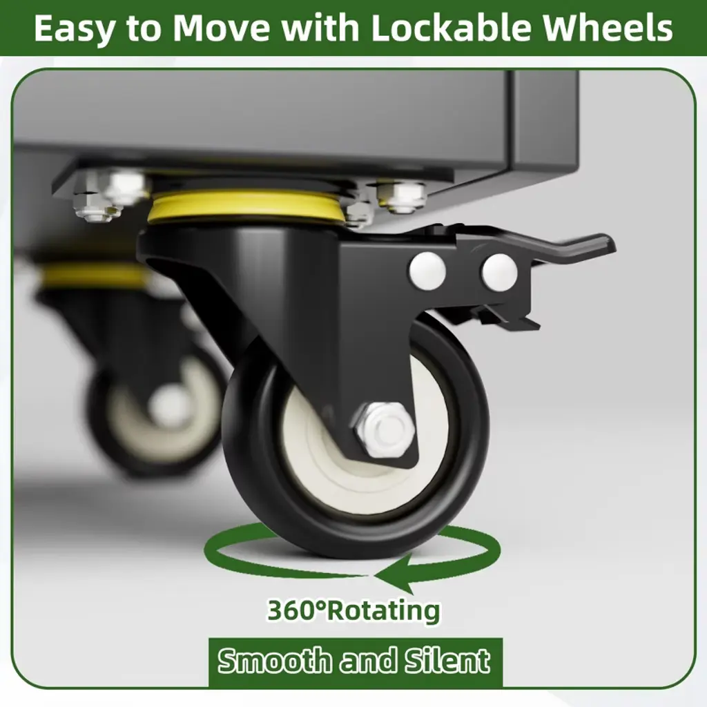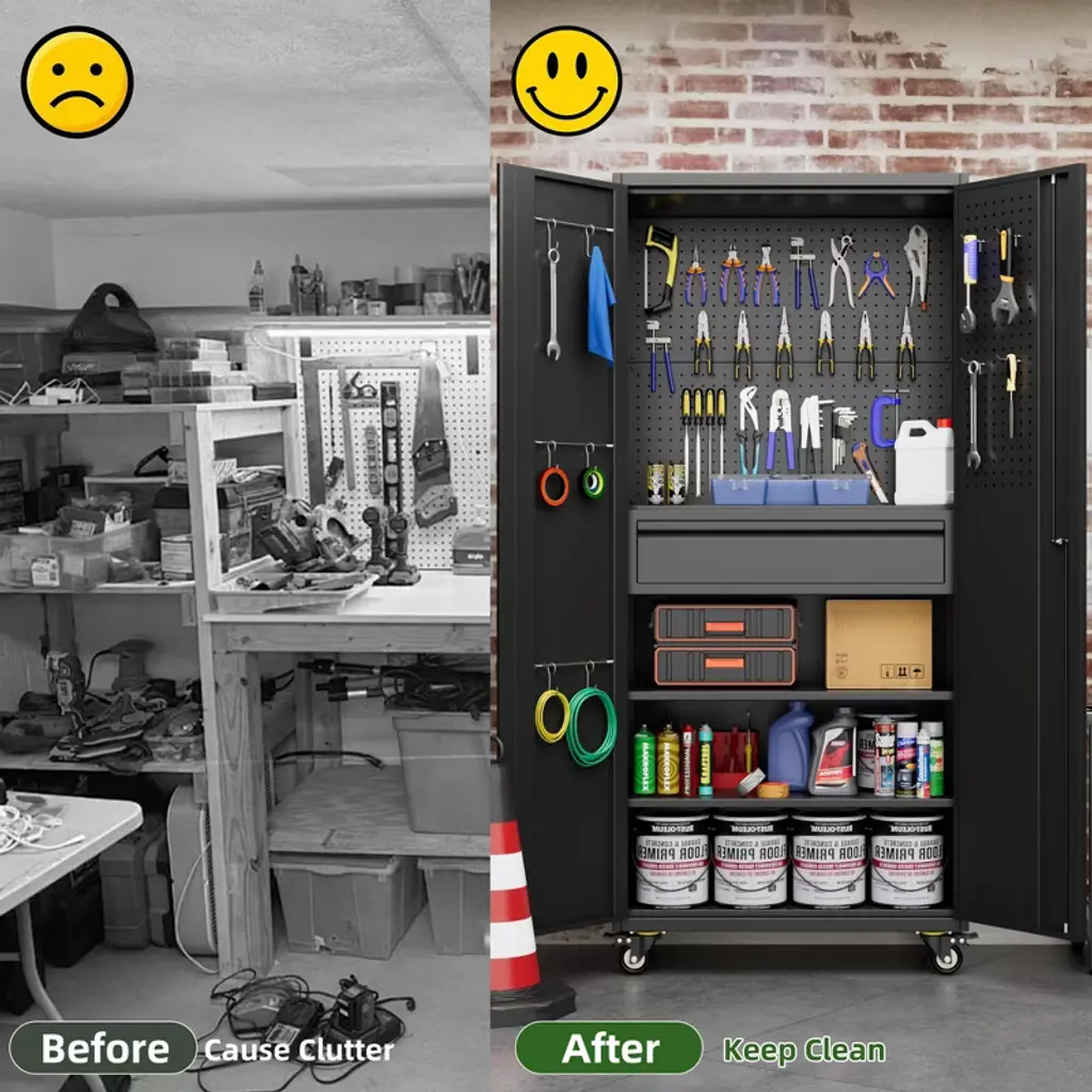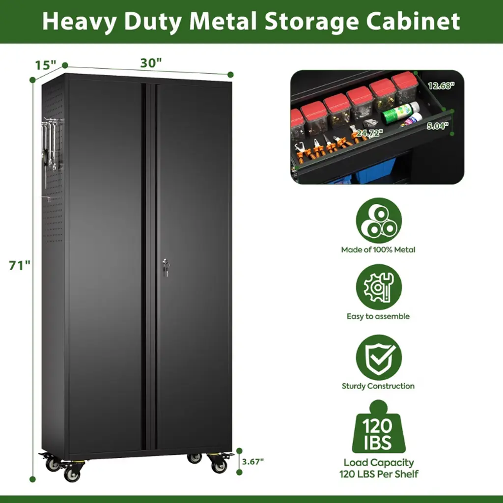 This 71" H Metal Garage Storage Cabinet combines smart organization with mobility, designed to streamline cluttered spaces in garages, workshops, or homes. Featuring a durable black metal construction, it includes 2 adjustable shelves, a secure drawer for valuables, and a pegboard back with 4 included hooks and 3 rods for versatile tool or accessory hanging. Four lockable rubber casters ensure easy, floor-friendly mobility, while the customizable layout adapts to your storage needs. Requires simple assembly and offers sturdy, long-lasting functionality to keep your space tidy and efficient.