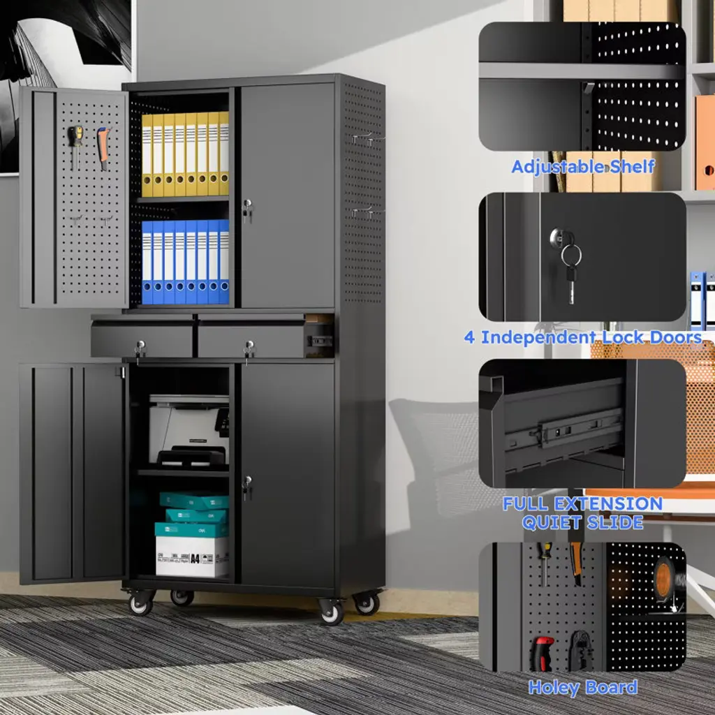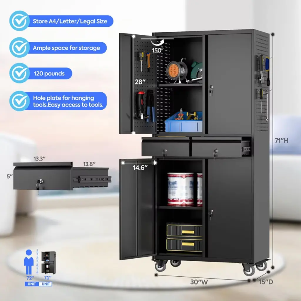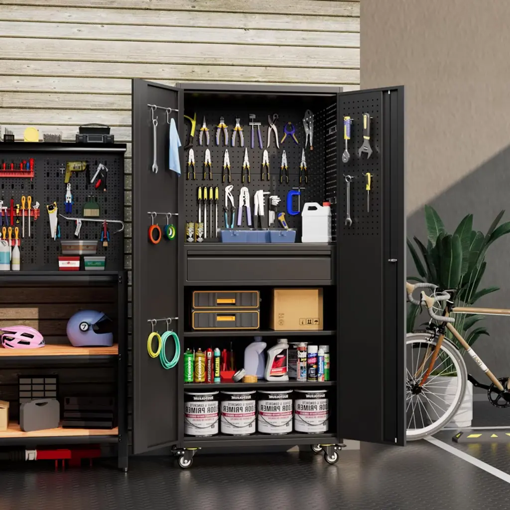 Why Buy This? This isn’t just storage—it’s a system that grows with your needs. Mobile, secure, and built to last, it’s the upgrade your space deserves. Click “Add to Cart” and ditch the clutter for good. Maximize your space with this 71" heavy-duty rolling metal cabinet, perfect for garages, workshops, or homes. Features a pegboard back, two lockable drawers, and adjustable shelves for customizable storage. Four rubber wheels offer easy mobility, while side/door ventilation holes keep tools organized and accessible. Quick assembly and a sleek black finish ensure durable, clutter-free storage.