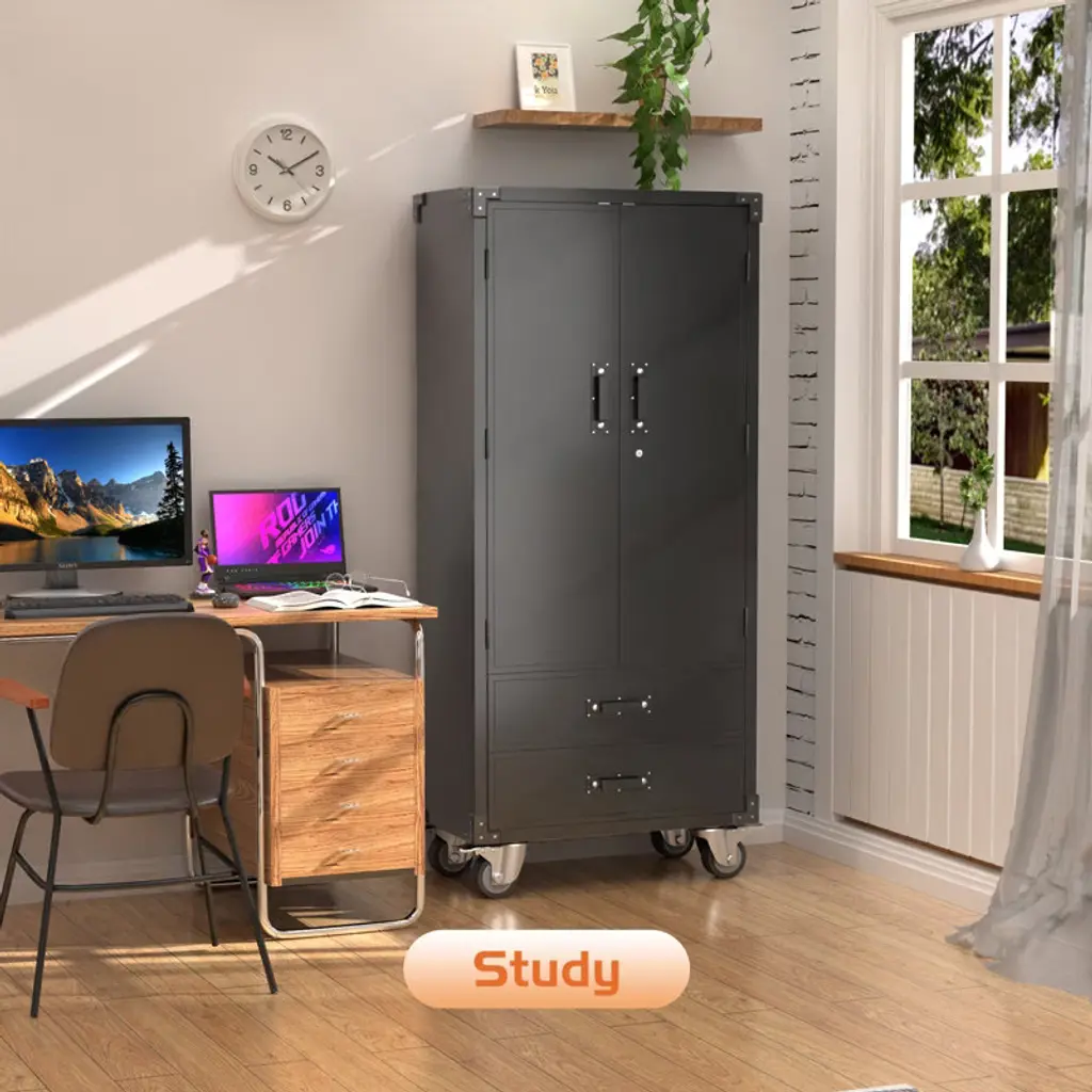 This metal cabinet with wheels and adjustable shelf can be used in garage, bedroom,office,study or any place where additional storage is required.The cabinet features 3 adjustable shelves and two drawers that provide lots of room to organize your household goods, supplies, tools, etc. The metal locker has 4 removable rubber casters for easy movement, 2 of which are lockable so you can secure it anywhere you need it.