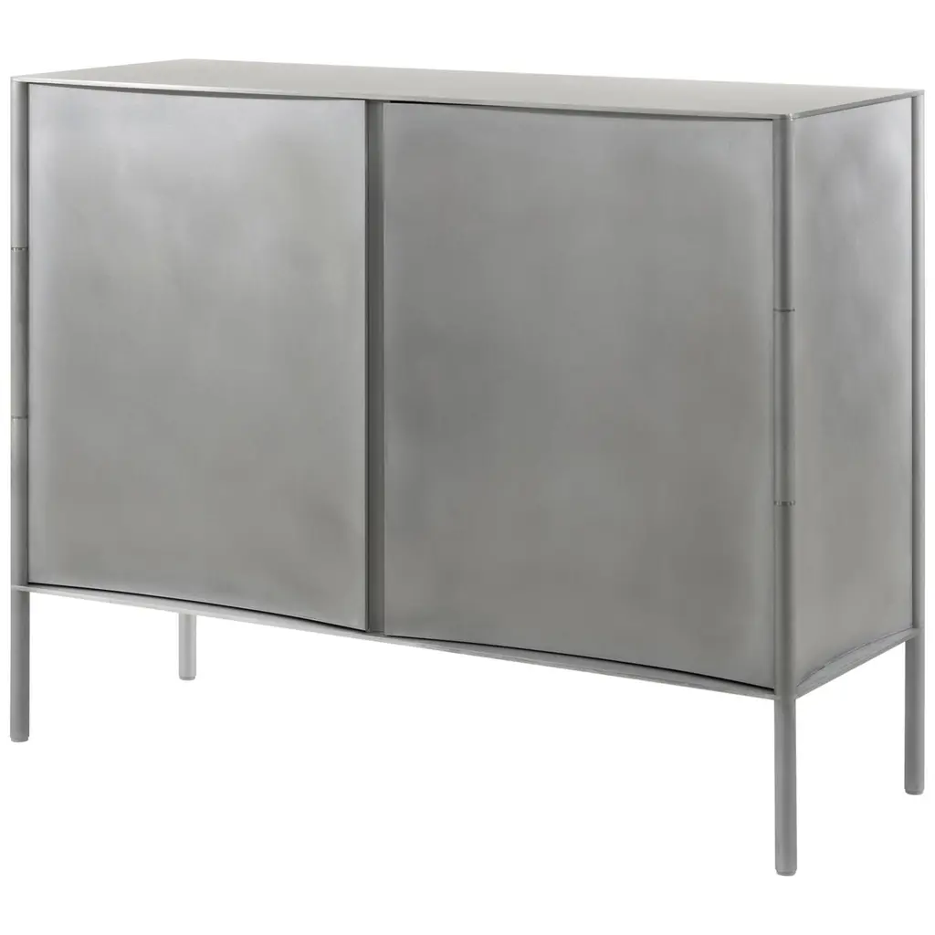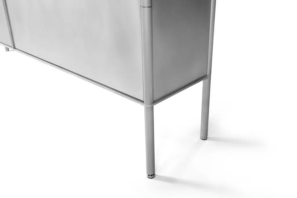 The SW cabinet by Jonathan Nesci is cut and machined aluminum with a waxed finish. The doors, back, and sides are milled into the legs. The doors are cut and are welded to machined custom hinges integrated into the legs. The doors open with a push-to-open Blum mechanism. The legs have machined foot levelers. The interior houses three fixed shelves each.