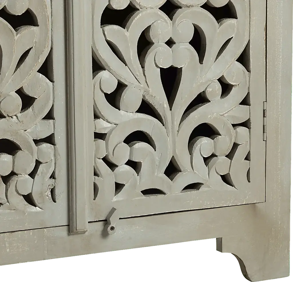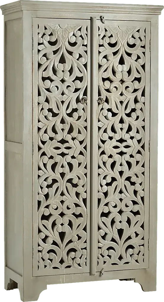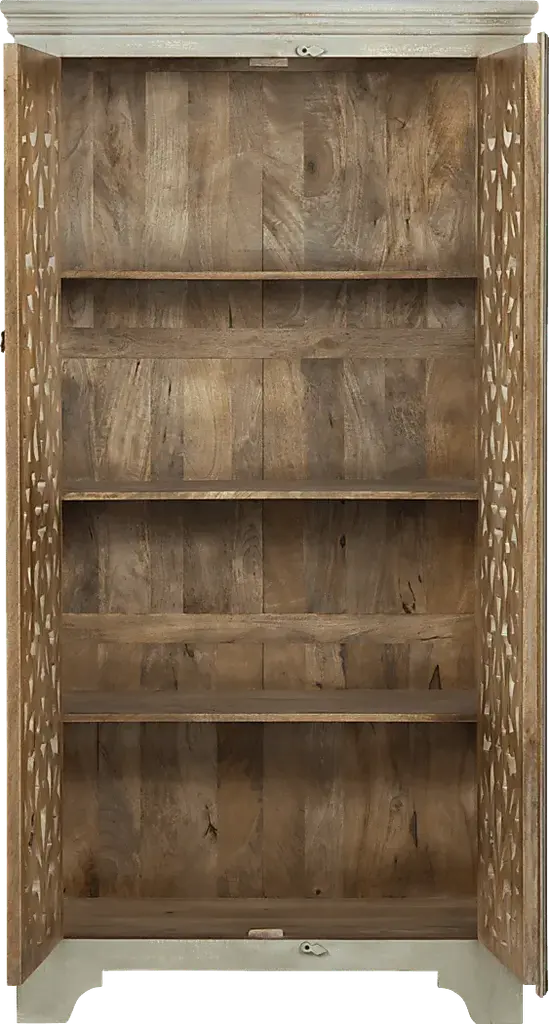 The interconnection of life's moments is reflected in the tight patterns of the Sylvia cabinet as its sweeping lines and curves resolve into a natural order. The tan floral latticework of this traditional accent is punctuated only by two small metal ring pulls, opening to four spacious shelves in warm brown. Adding a functional touch, a discreet pair of stays keep the doors closed when needed.