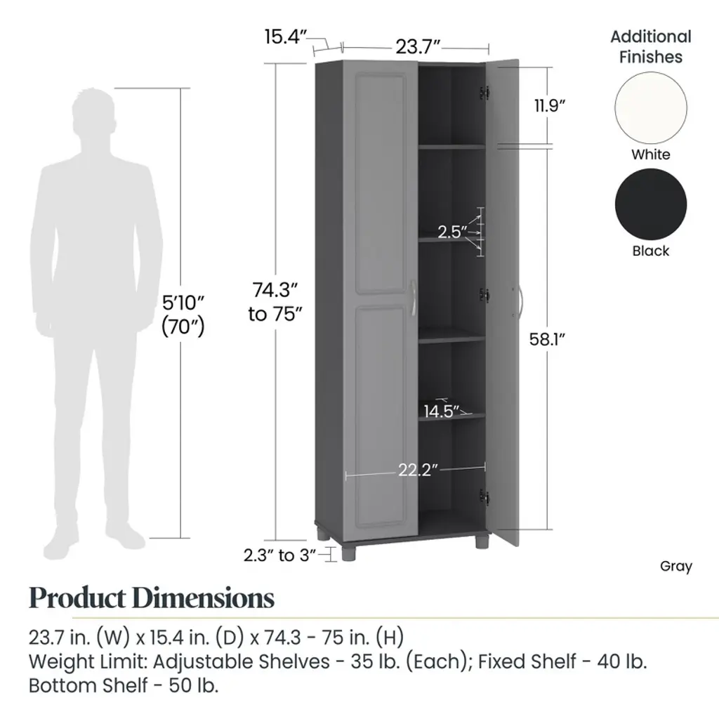 Add extra storage space to any room in your home with the SystemBuild Kendall Storage Cabinet. Made of laminated MDF and particleboard, the water resistant white finish is easy to clean so the Cabinet can be used anywhere. The interior of this Cabinet features 5 shelves, 3 adjustable, allowing you to customize your storage for both small and large items. Store and organize anything from office supplies to cleaning supplies and even kitchen pantry items. Soft close hinges are adjustable and prevent slamming doors. The adjustable feet make keeping your Cabinet level on uneven floors simple. A wall anchor kit is included to secure the Cabinet to the wall and prevent tipping injuries. Use this piece as a stand-alone item, or combine it with additional SystemBuild Kendall storage items to create the perfect storage solution for your home. The Storage Cabinet ships flat to your door and 2 adults are recommended to assemble.