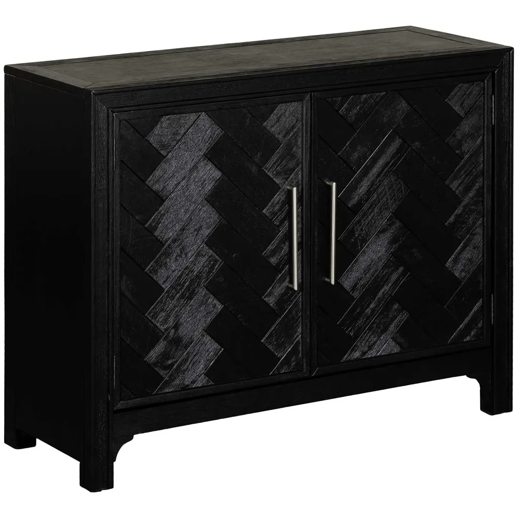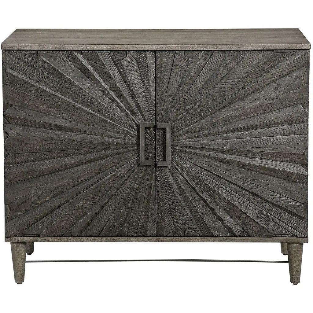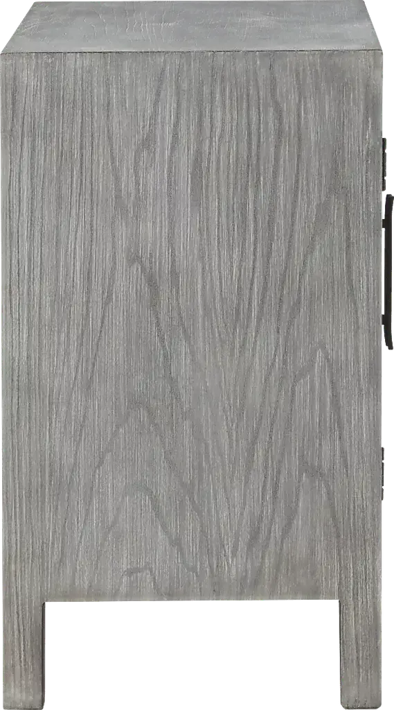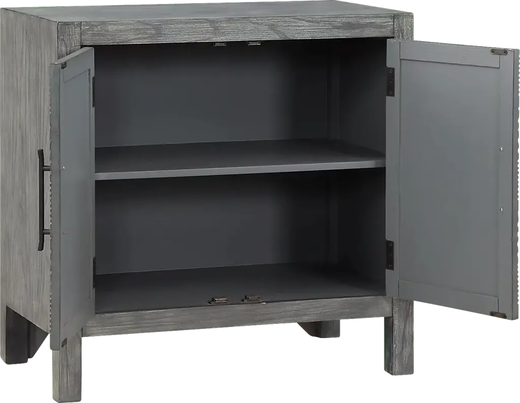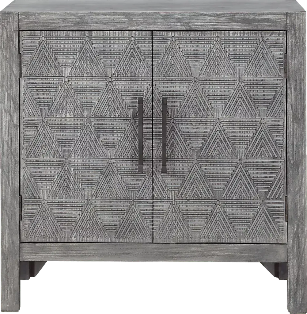 Enhance any room with this exquisite Talahi two-door cabinet. The slightly distressed gray finish offers a neutral palate that complements any color scheme. The raised geometric pattern across the door fronts creates a visually compelling texture and is enhanced by sleek metal hardware. The spacious shelved interior provides additional storage space adding versatility and convenience to this stylish design. Customer assembly is required.