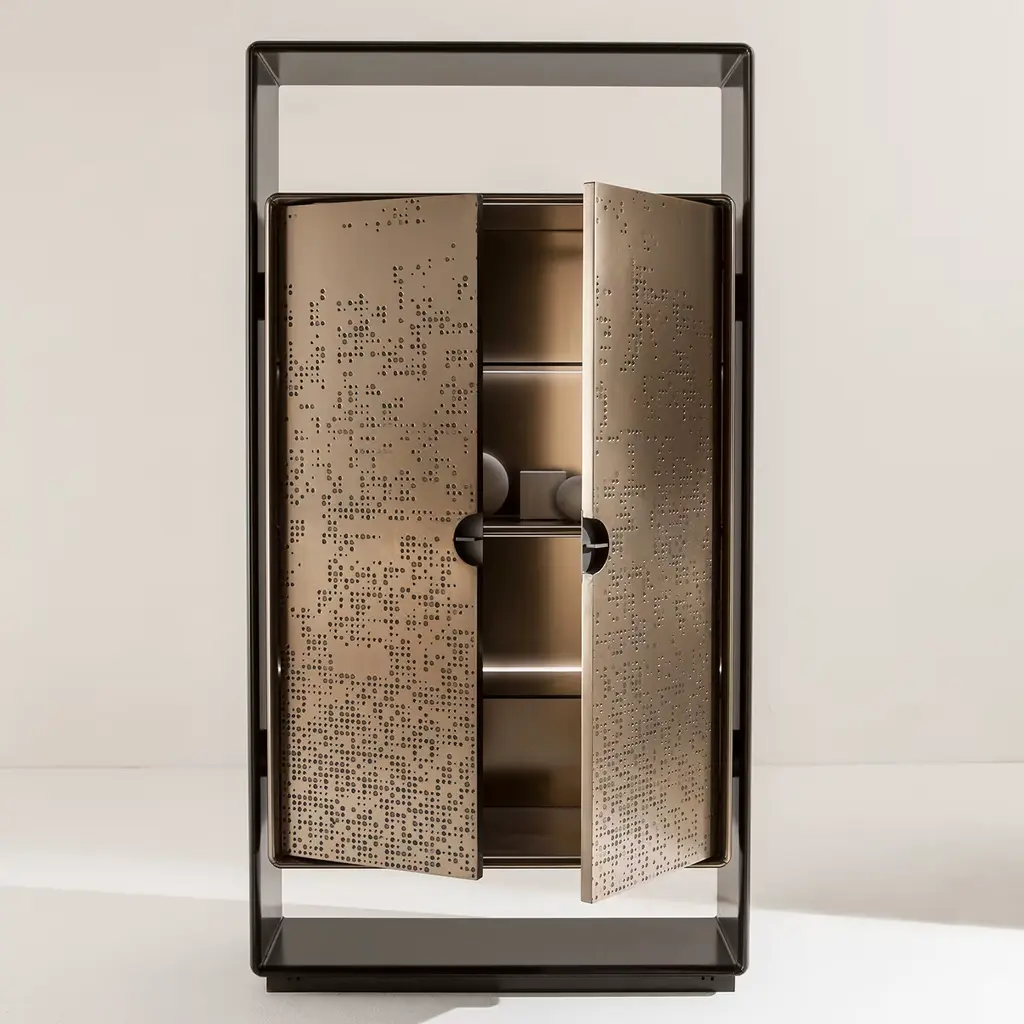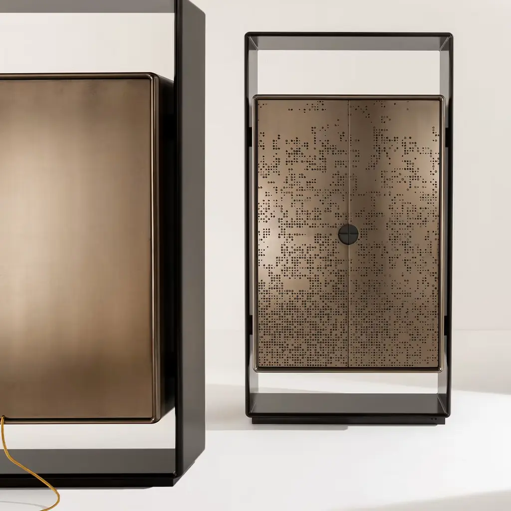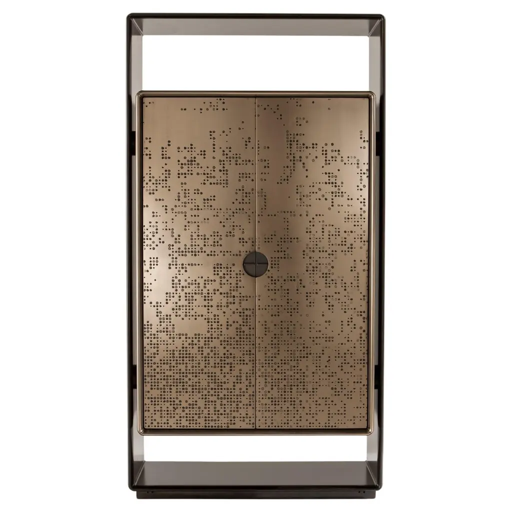 This cabinet features a structure in wood or lacquered wood. Its doors have a liquid metal finish and textured, Unlimited motif which enhances its warmth and energy with a 3D look. The interior is lacquered in liquid metal and includes glass and lacquered shelves, along with an LED light. Other finishings are available.