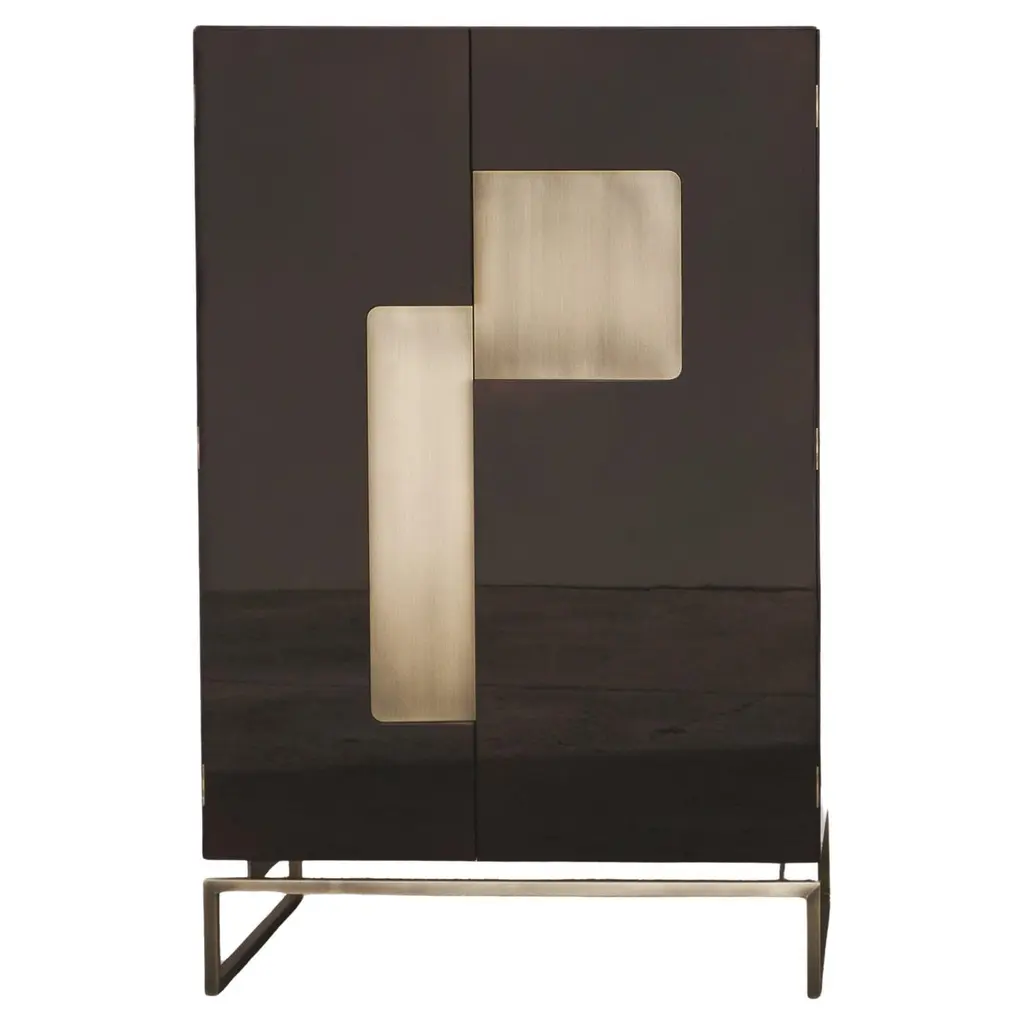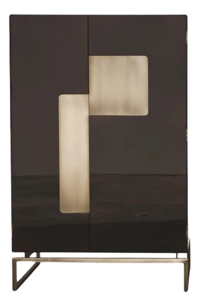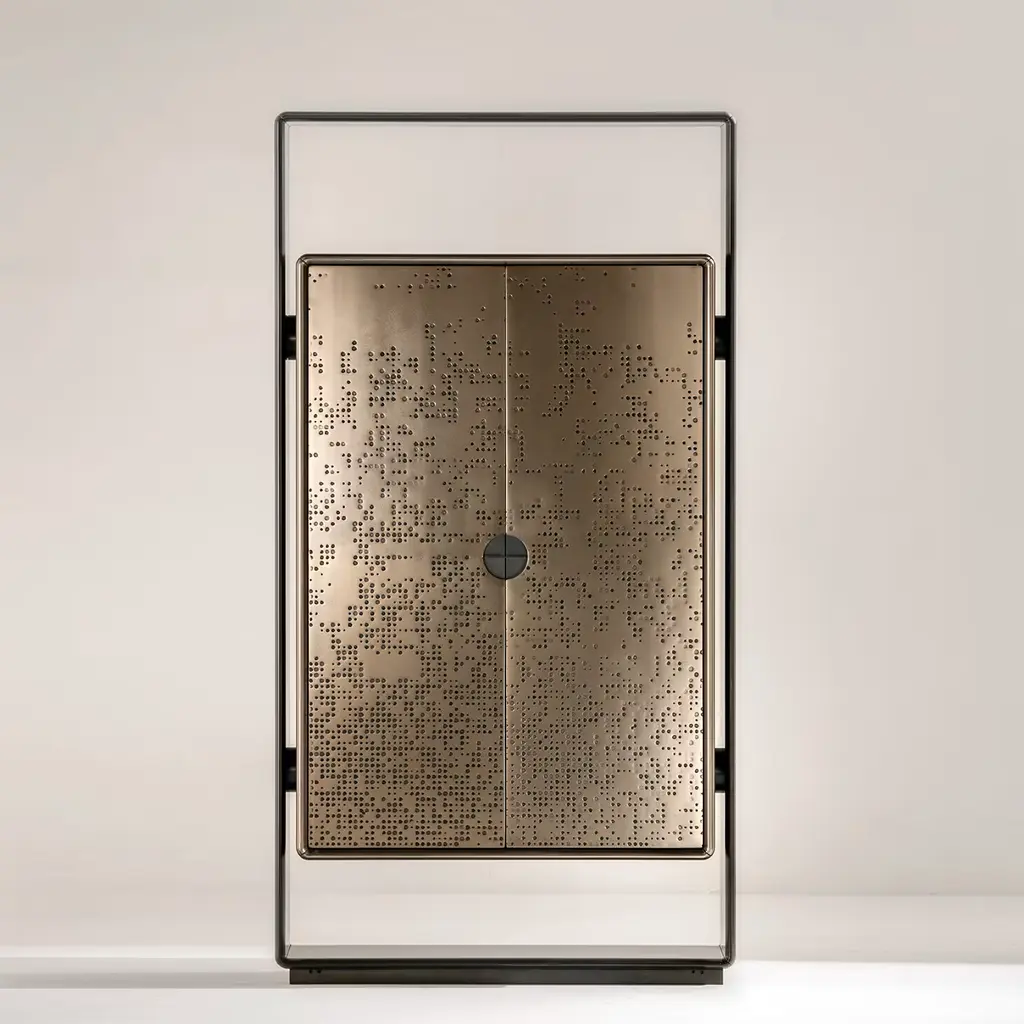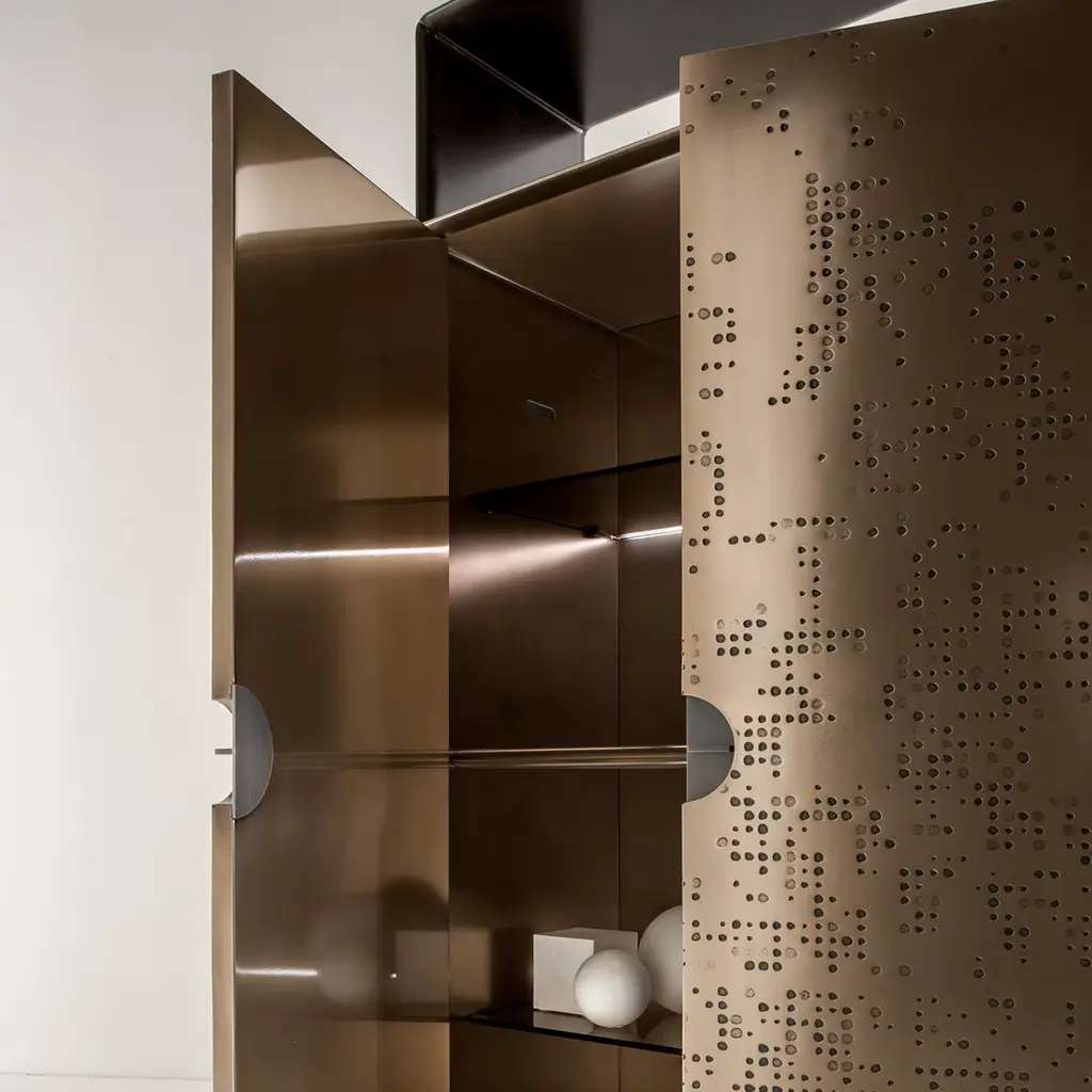 This cabinet features a structure in wood or lacquered wood. Its doors have a liquid metal finish and textured, Unlimited motif which enhances its warmth and energy with a 3D look. The interior is lacquered in liquid metal and includes glass and lacquered shelves, along with an LED light. Other finishings are available.