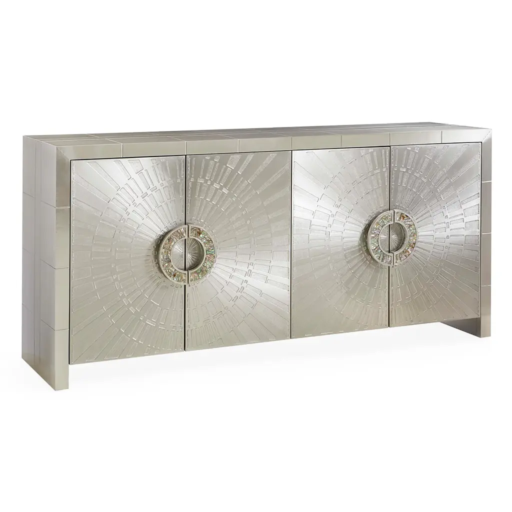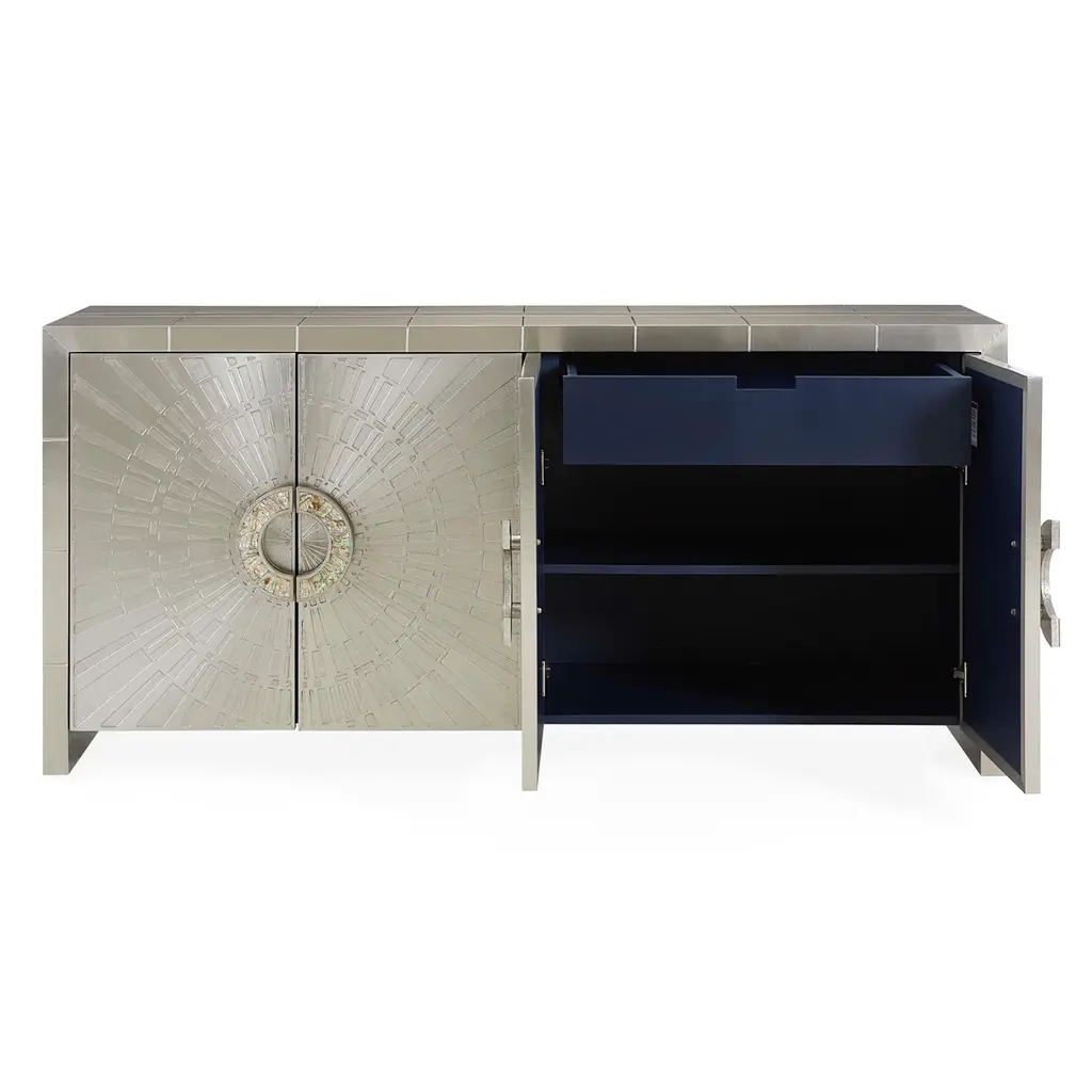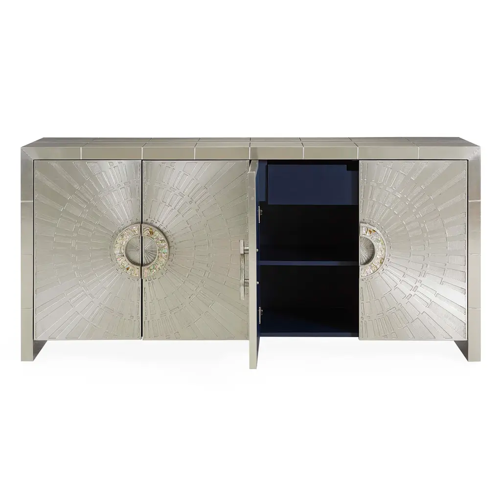 Global Glamour. We've taken our bestselling Talitha Cabinet and reimagined it as a matching credenza. Crafted from sheets of nickel-plated metal hand-stamped into a modern starburst pattern and routed onto solid wood. Each door is capped with jewel-like pulls featuring hand-cut abalone shell mosaic. Keep it hyper-haute and tidy with couture storage that hits all the right notes whether in the hall, behind the sofa, or duetting with your dining table.