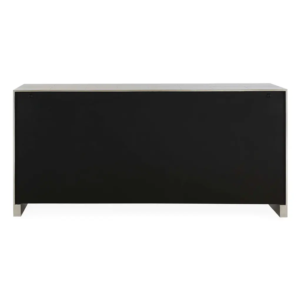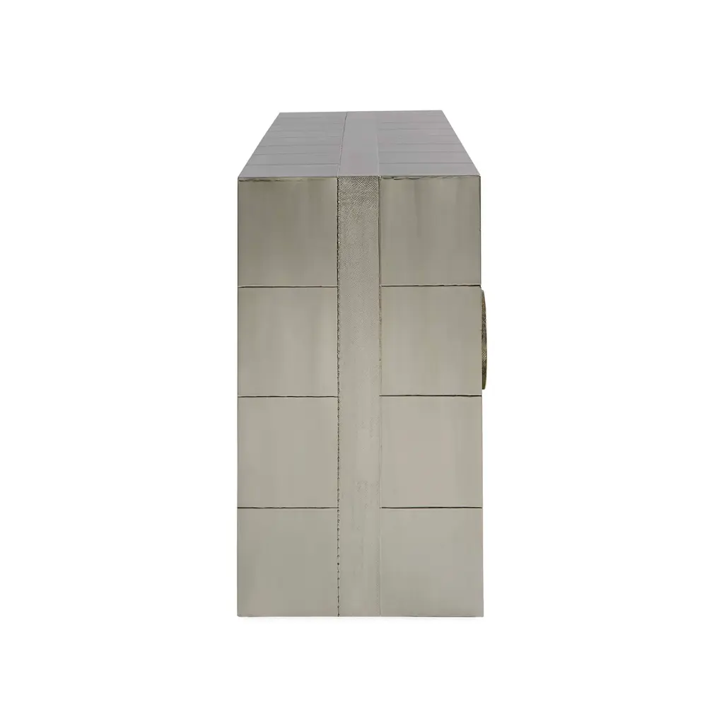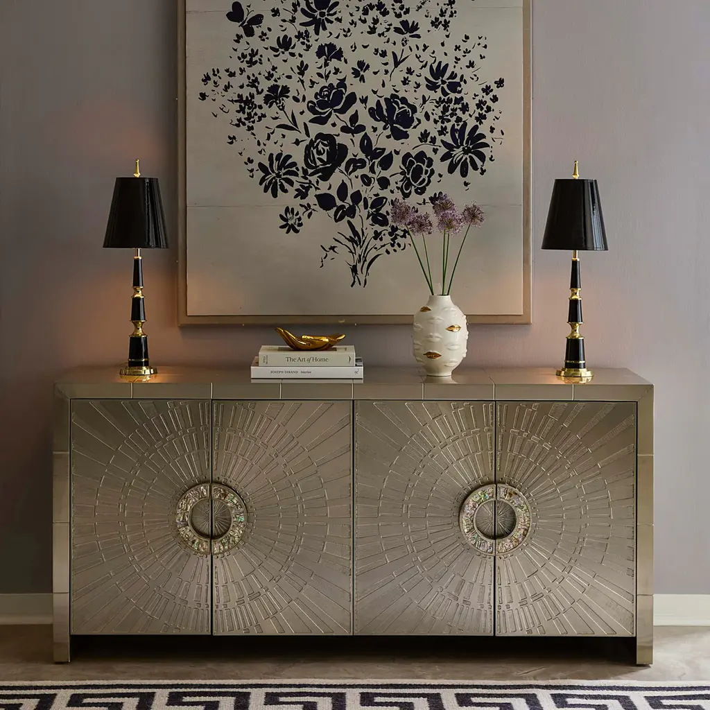 Global Glamour. We've taken our bestselling Talitha Cabinet and reimagined it as a matching credenza. Crafted from sheets of nickel-plated metal hand-stamped into a modern starburst pattern and routed onto solid wood. Each door is capped with jewel-like pulls featuring hand-cut abalone shell mosaic. Keep it hyper-haute and tidy with couture storage that hits all the right notes whether in the hall, behind the sofa, or duetting with your dining table.