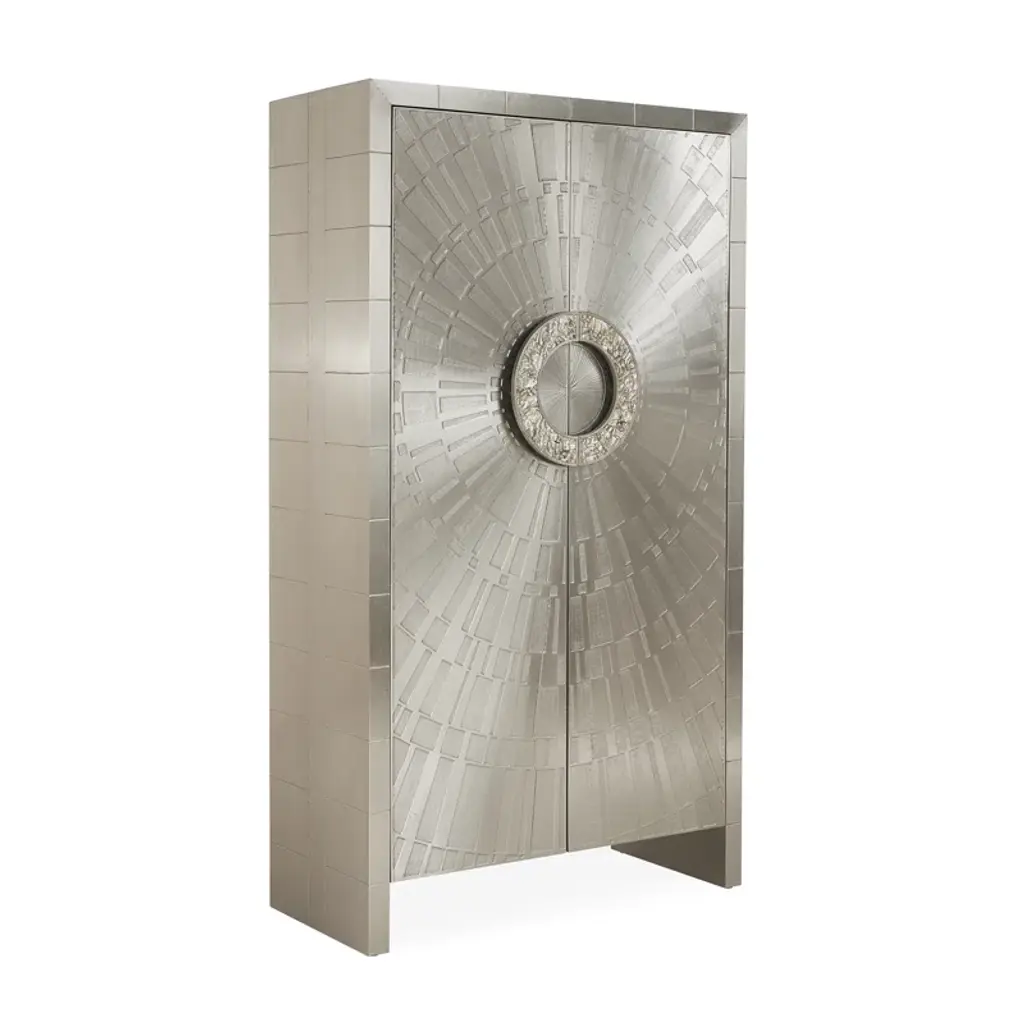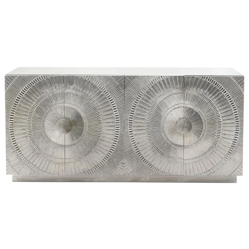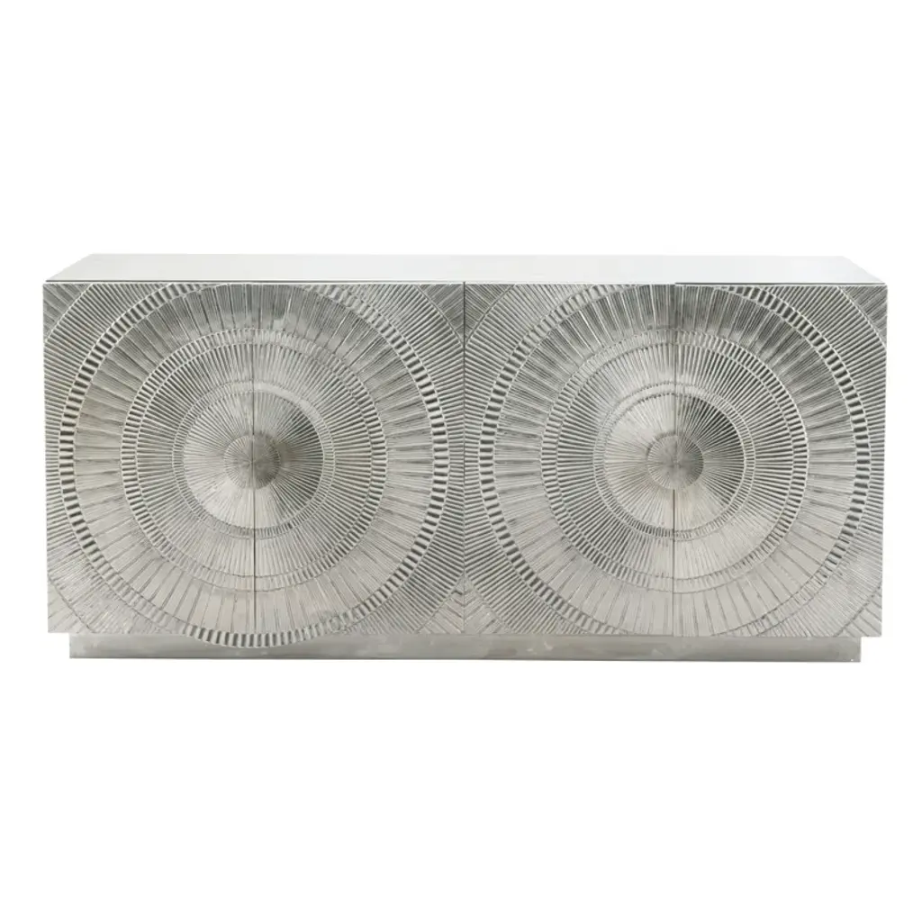 Our Talitha Cabinet features sheets of nickel-plated metal or solid brass hand-stamped into a modern starburst pattern routed onto solid wood. Each is capped with jewel-like door pulls featuring a luminous, hand-cut abalone shell mosaic, or naturally dazzling emerald malachite. The nickel-plated surface is reminiscent of silver leaf—it emits that same lustrous glow—while brass radiates a glowing warmth. Both are wonderfully durable, and add a rich hippie vibe to your Park Avenue penthouse or a bit of twinkly glamour to your downtown loft. Whichever way you glow, announce your hyper-haute bona fides by using it as a buffet, flanking a doorway, or as a small dresser.