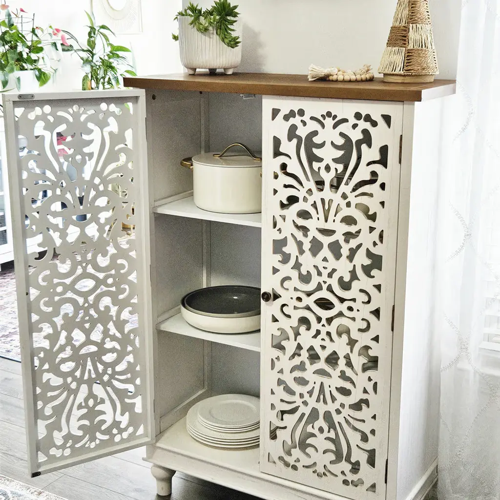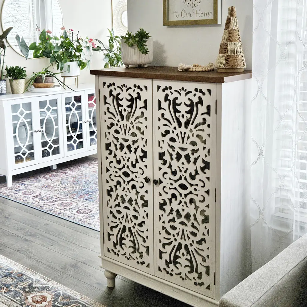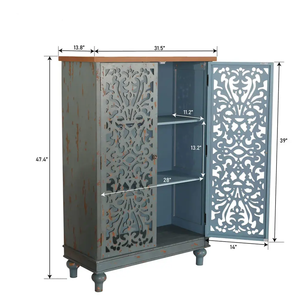 Tall Accent Storage Cabinet With Decorative Carved Design-Mfstudio