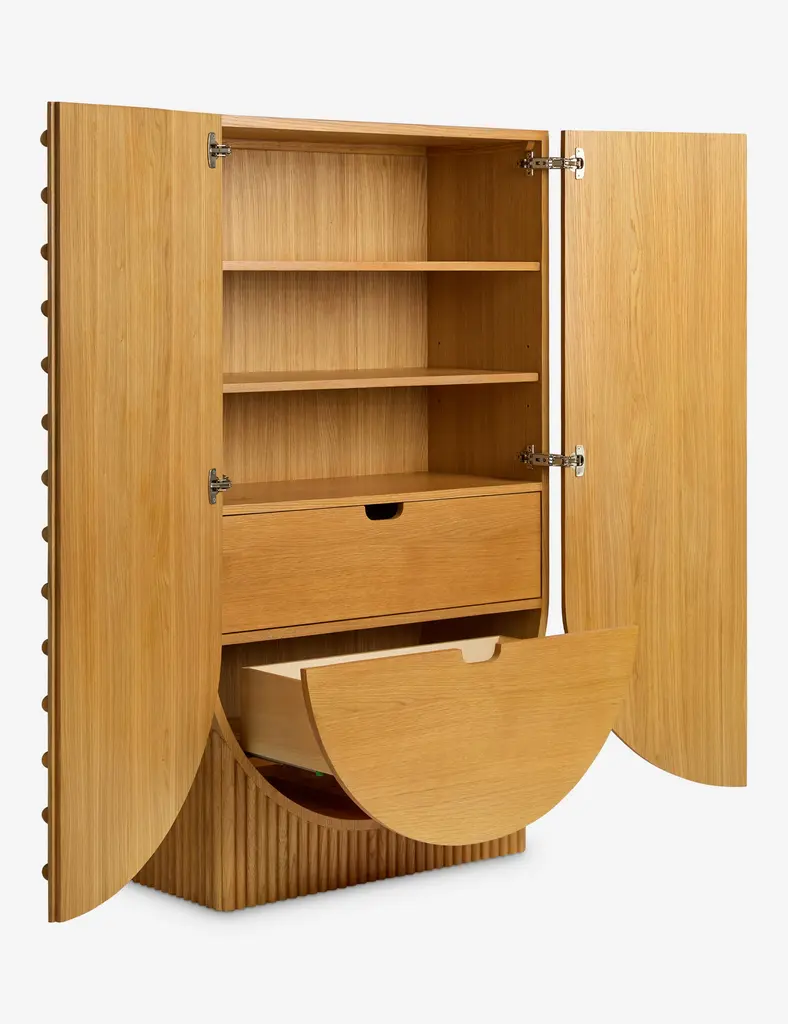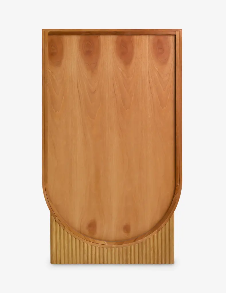 This tall bar cabinet stands out with a formal silhouette and sculptural detailing. An inverted arch adds a subtle curve to the design, while rounded wood pulls bring a buttoned-up touch, and the ribbed plinth base grounds the piece with a textural base. This piece is from our exclusive Sarah Sherman Samuel collaboration and features all the trademarks of her warm, edited style.