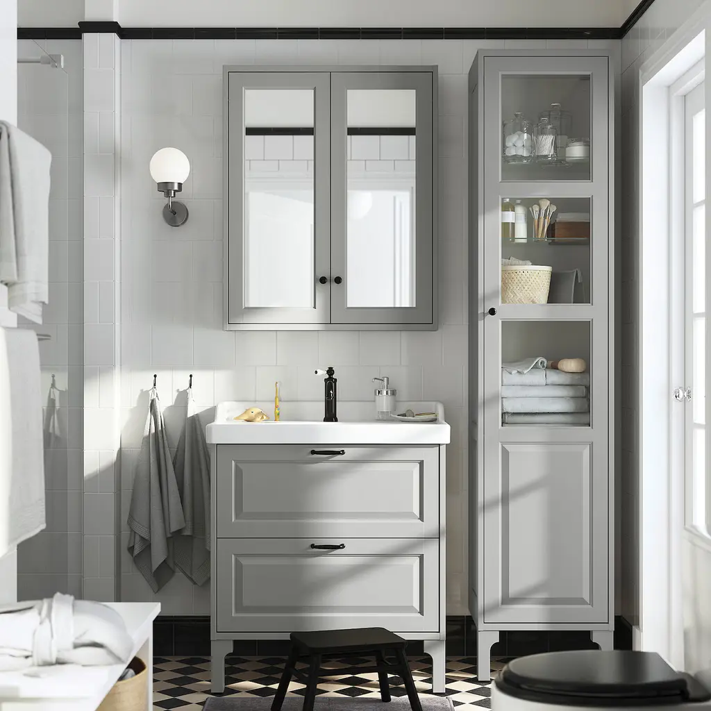 TÄNNFORSEN High cabinet with doors - light gray 18x15x77 ". This cabinet offers both visible and hidden storage as the upper part of the door has clear glass and the bottom part has a panel. The glass door creates a spacious feel and allows you to see your things, while protecting them from dust.