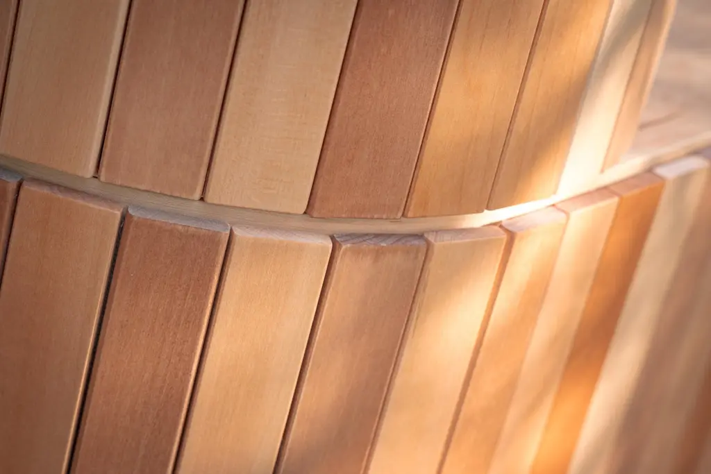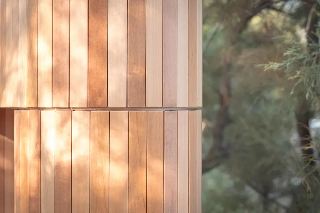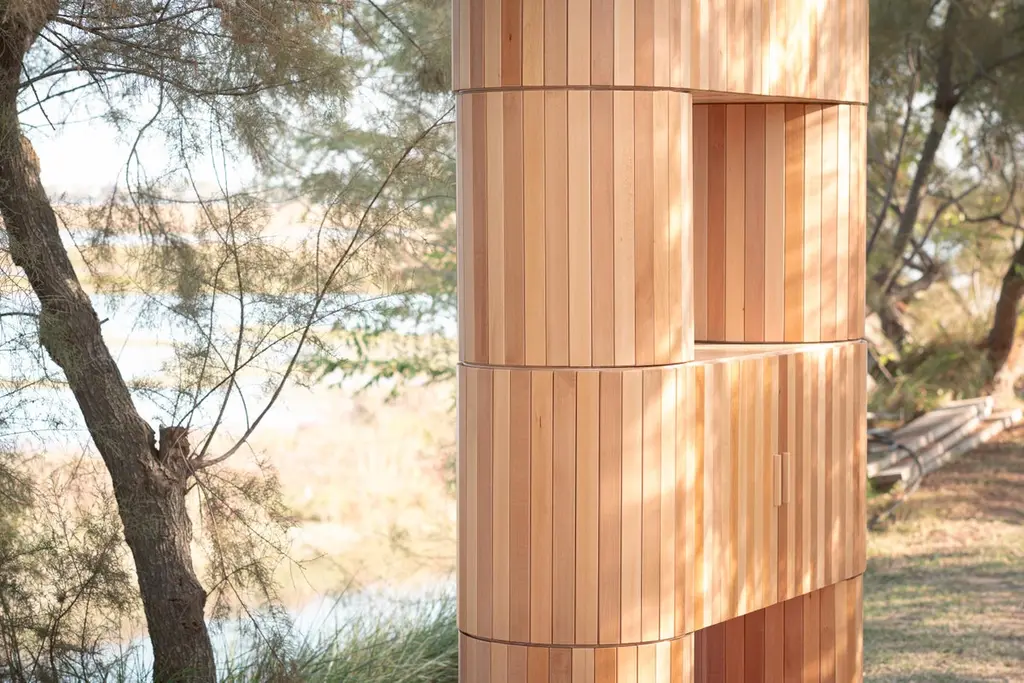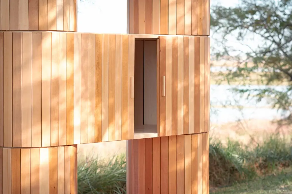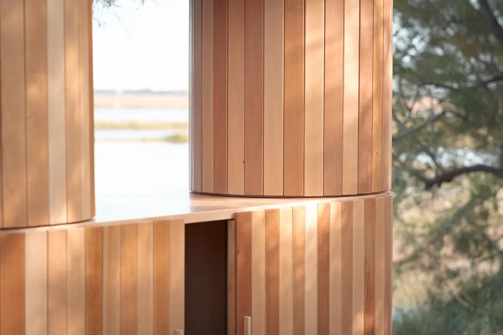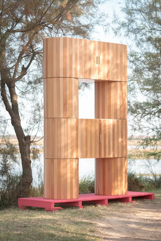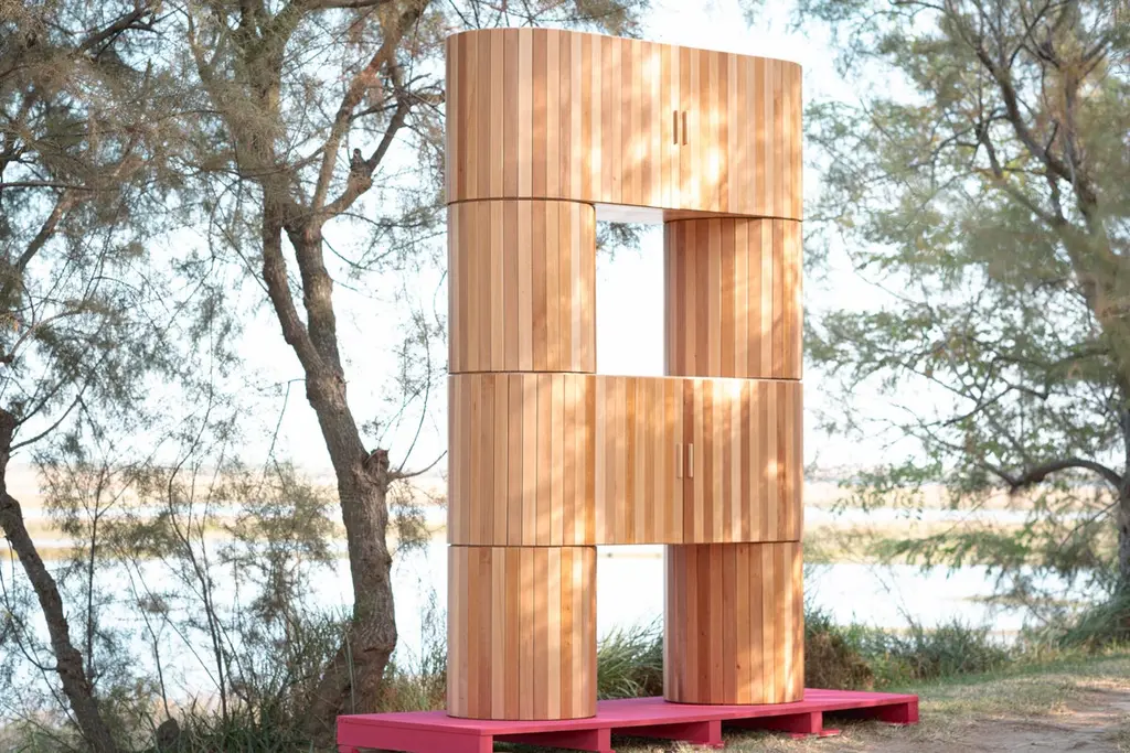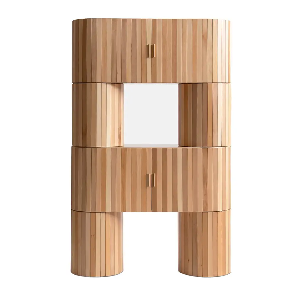 Venetian windows, with shutters, blinds and shutters, burst with light capturing enchantments of sunrises and sunsets. CARA \ DAVIDE studio celebrates this iconic element with the Tapparella furniture series, made by Medulum. The cabinet, designed by Cara Judd and Davide Gramatica, features a block structure with curved surfaces and an elegant color scheme reminiscent of Venetian craftsmanship. Different wood essences are arranged vertically, creating a sculptural and refined design. This imposing yet lightweight piece of furniture blends high craftsmanship and design, paying homage to Venetian windows and enriching any home environment. A piece that represents the very life of the home, revealing who is inside and their state of mind through its distinctive design, and bringing with it the unique charm of Venice.
