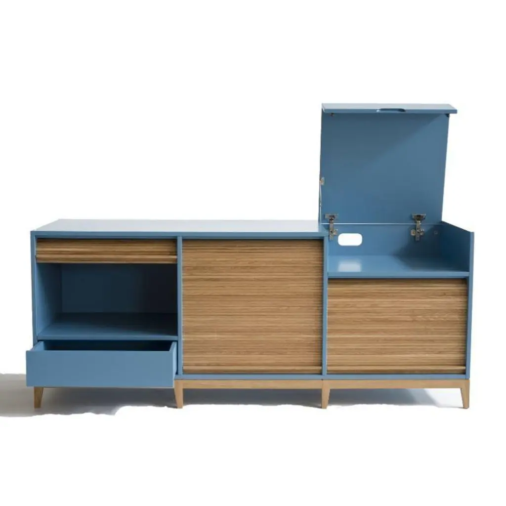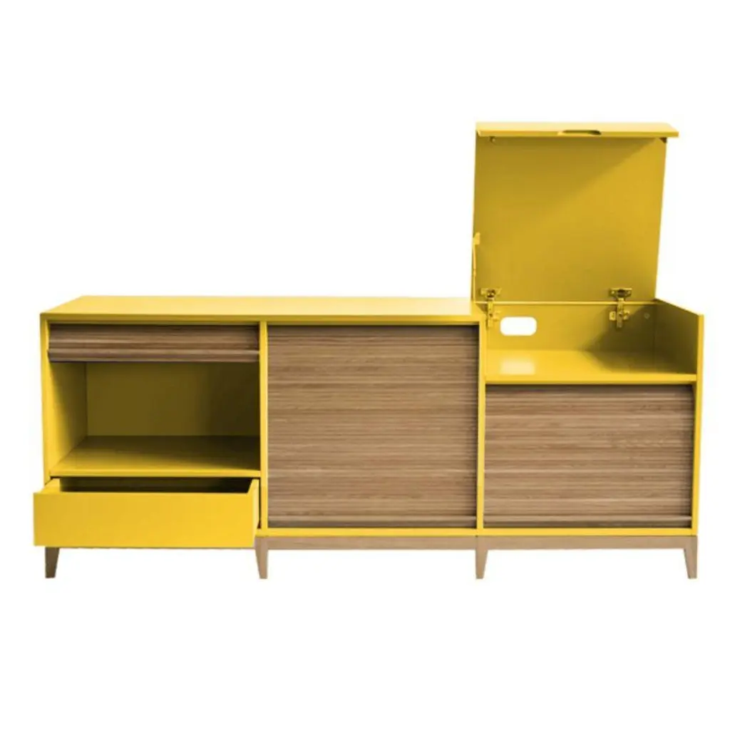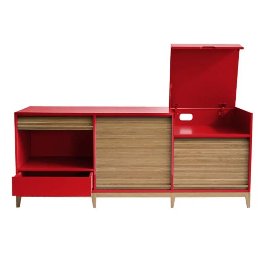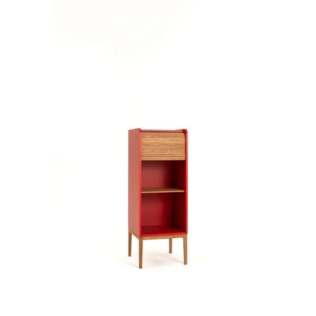 Tapparellelarge cabinet, cherry red by Colé Italia with Emmanuel GallinaDimensions: H.135, D.46, W.78 cmMaterials: Container with legs and “tapparella” sliding shutter in solid oak.Matt lacquered structure; inside 2 oak veneered shelfAlso available: Tapparelle M cabinet, L cabinet, hanging unit, mirror hanging unit, lacquered in azure, lacquered in blue/gray, lacquered in sand white, lacquered in mustard yellow, .lacquered in cherry red, lacquered in black.Tapparelle is a collection of elements that explore the traditional technique of antan office furniture with sliding shutters no longer in use, turning them into furniture for the contemporary home with soft and unusual lines. The sliding shutters in solid oak are specially designed for this collection and hand mounted on cotton canvas, as true artisan tradition wants. Basement and sliding shutters in solid oak. MDF structure, matt lacquered with a double bottom that hides the sliding of the shutter. Shelves veneered in natural oak. In addition Tapparelle sideboard has a bottom push- pull drawer for cutlery or small items and a top folding compartment flap with slow motion pistons to use with multiple cable ideal for installations to conceal dvd, console, table, pc. Colé is a young Italian design brand, with a high-end production 100% made in Italy. Born from the experience of Matteo De Ponti, architect, who grew up in one of the most outstanding Milanese design families, and the artistic sensibility of Laura Macagno, degree in Economics and passionate of art and design. Our Mission is to create design icons, beautiful and comfortable pieces that can Stand the test of time, furnishing houses of international and sophisticated clients, and realized with craftsmanship, thus unique. “We love objects which own deep roots, excellent quality, and a strong evocative power. Archetypal forms dressed with new beauty without losing their classical composure”.Our expressive research is inspired by the utopian force of Italian eminences grises architects and designers of the ’50s, the Scandinavian design, the Bauhaus, ethnic handcraft and houses of famous writers of the XX century, all different as a style but united by the intense soul of those who worked and lived there.