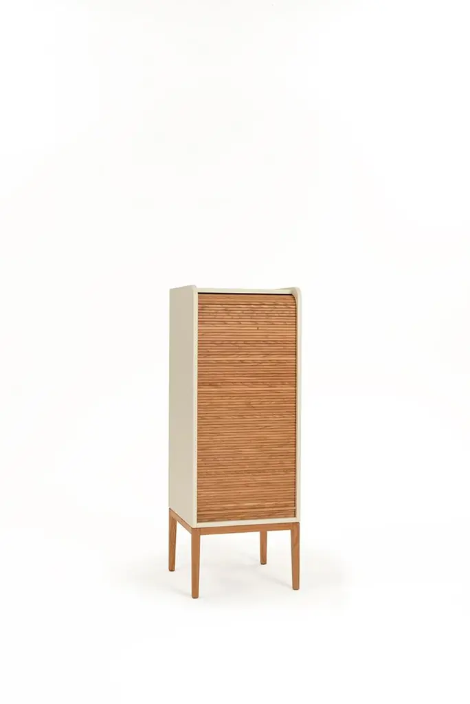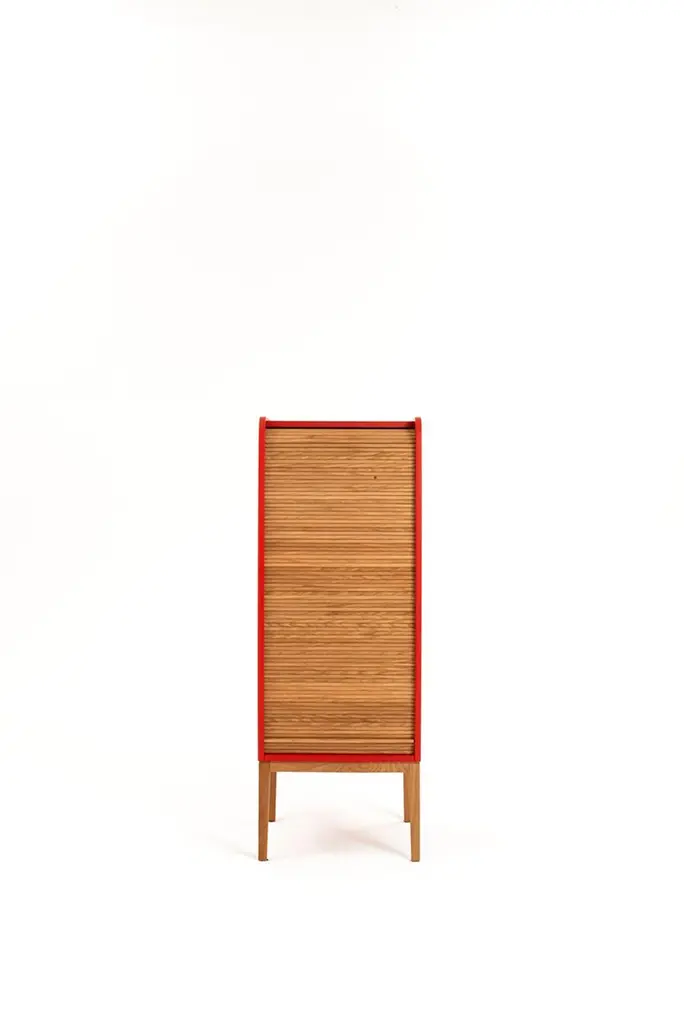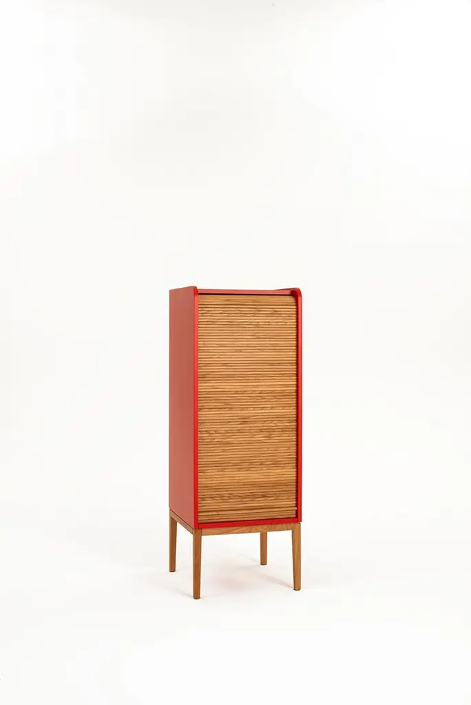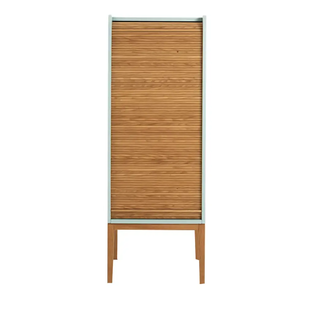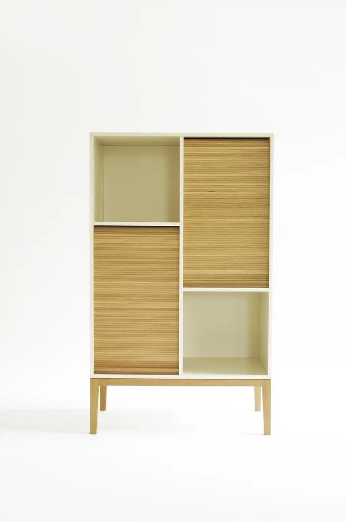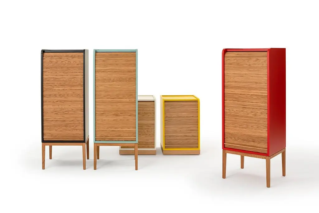 Tapparelle is a collection of cabinets that explore the traditional technique of old office furniture with tambour sliding shutters no longer in use, turning them into furniture for the contemporary home with soft and unusual lines.The base has tapered solid oak feet and sliding shutters. The sliding shutters, "Tapparelle" in Italian (from there comes the name of the product), specially designed for this collection, are composed in chopsticks in solid oak and hand finished and assembled on cotton canvas, as true artisan tradition wants! The structure is in wood panels thickness 16 mm, with double bottom that hides the sliding of the shutter. Finishing in matte lacquered in three colors: Perl white, pastel blue or a dramatic dark Hague blue. Shelves are veneered in natural oak. In the collection you can find small elements on wheels, big sideboards, and a writing desk, of course closed with "Tapparelle" shutters.