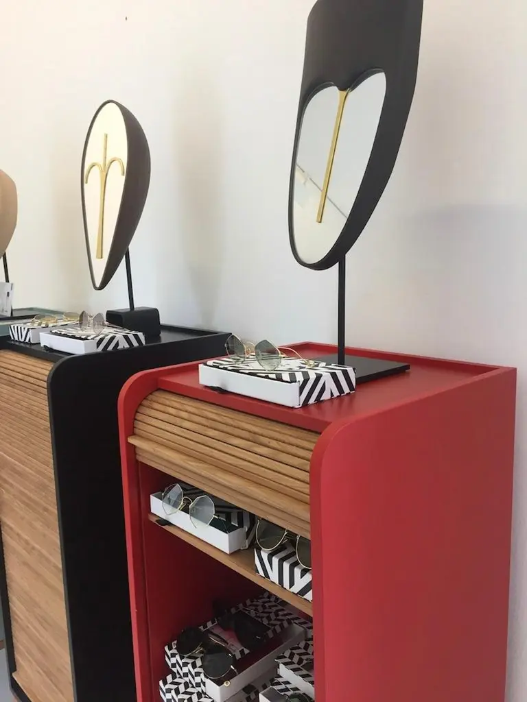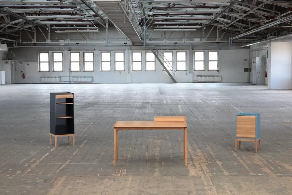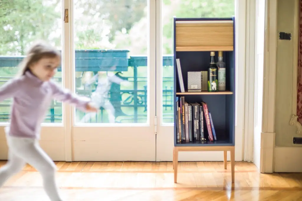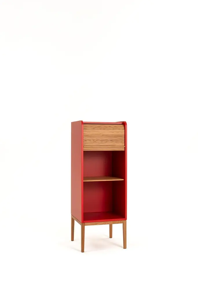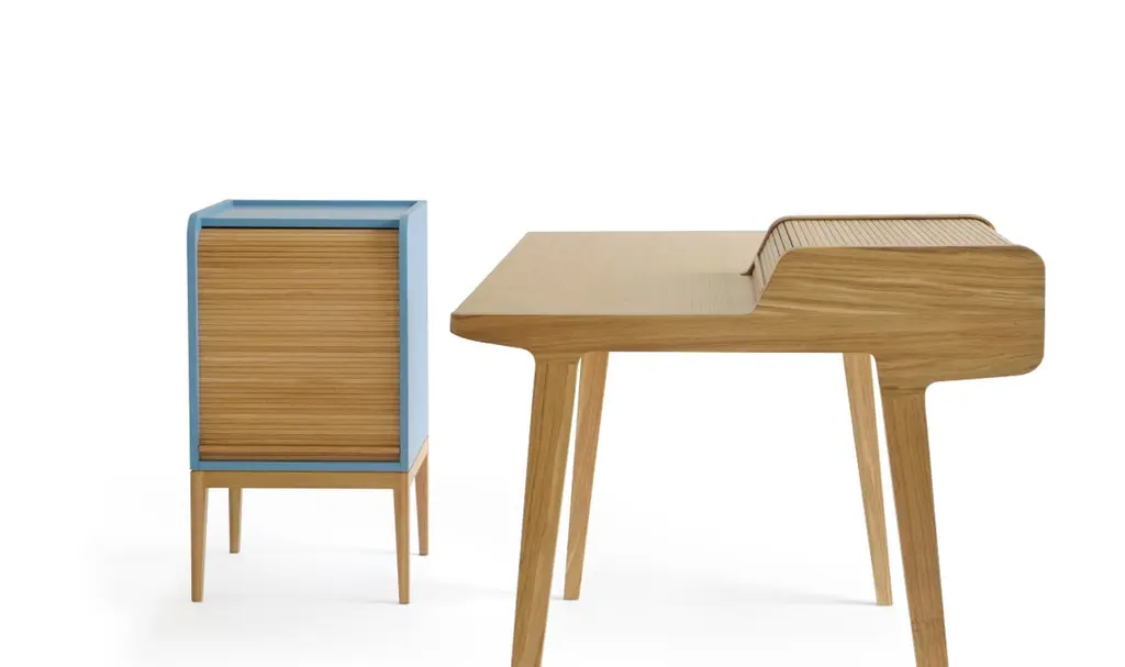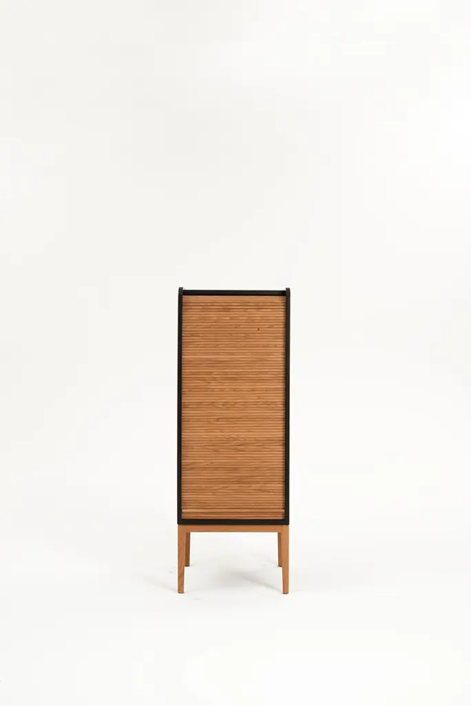 Tapparelle is a collection of cabinets that explore the traditional technique of old office furniture with tambour sliding shutters no longer in use, turning them into furniture for the contemporary home with soft and unusual lines.The base has tapered solid oak feet and sliding shutters. The sliding shutters, "Tapparelle" in Italian (from there comes the name of the product), specially designed for this collection, are composed in chopsticks in solid oak and hand finished and assembled on cotton canvas, as true artisan tradition wants! The structure is in wood panels thickness 16 mm, with double bottom that hides the sliding of the shutter. Finishing in matte lacquered in three colors: Perl white, pastel blue or a dramatic dark Hague blue. Shelves are veneered in natural oak. In the collection you can find small elements on wheels, big sideboards, and a writing desk, of course closed with "Tapparelle" shutters.