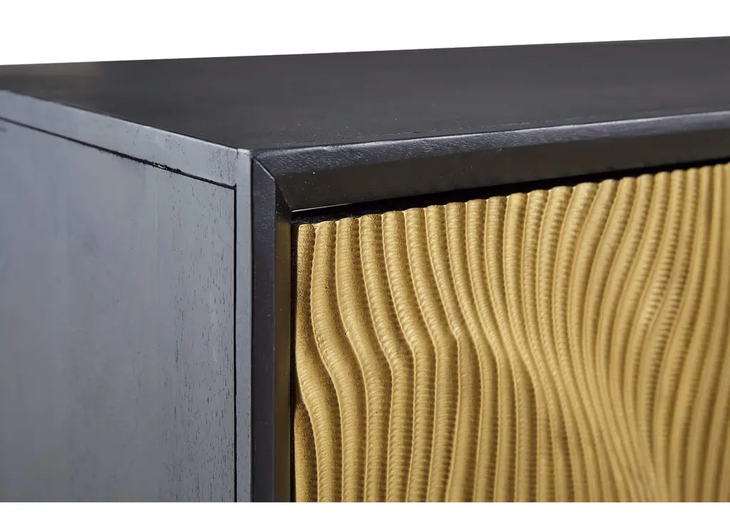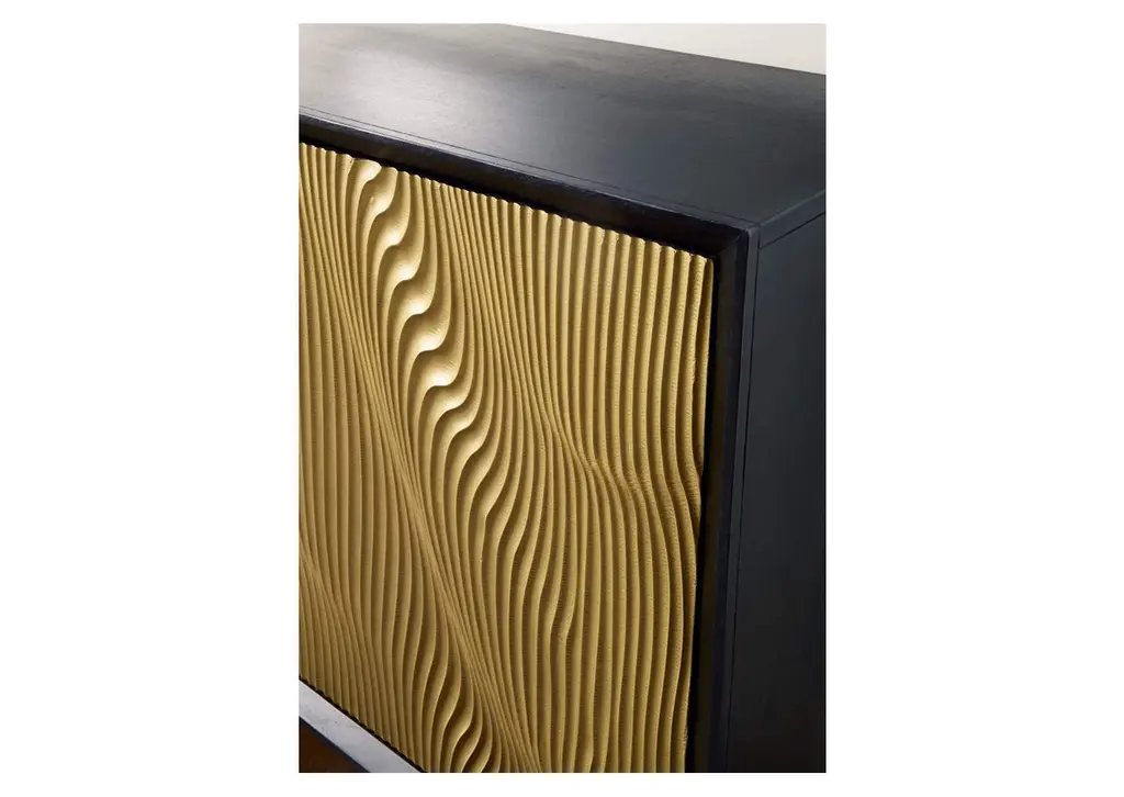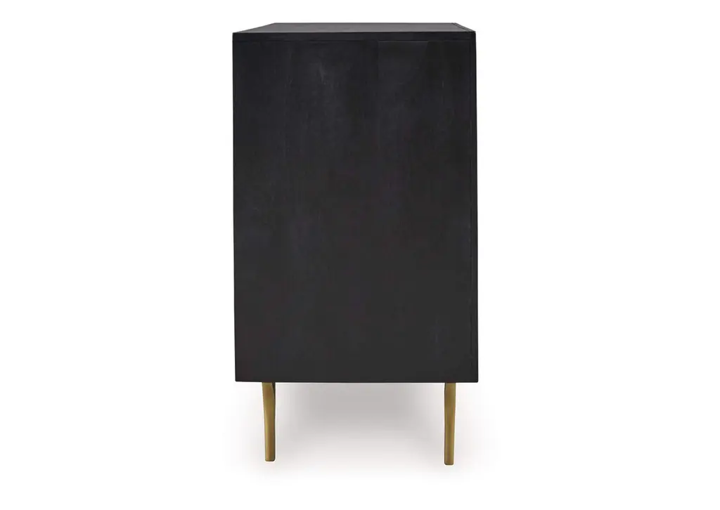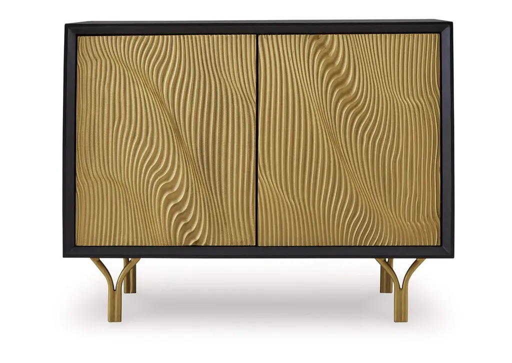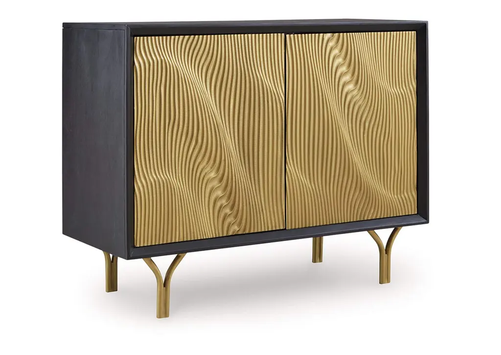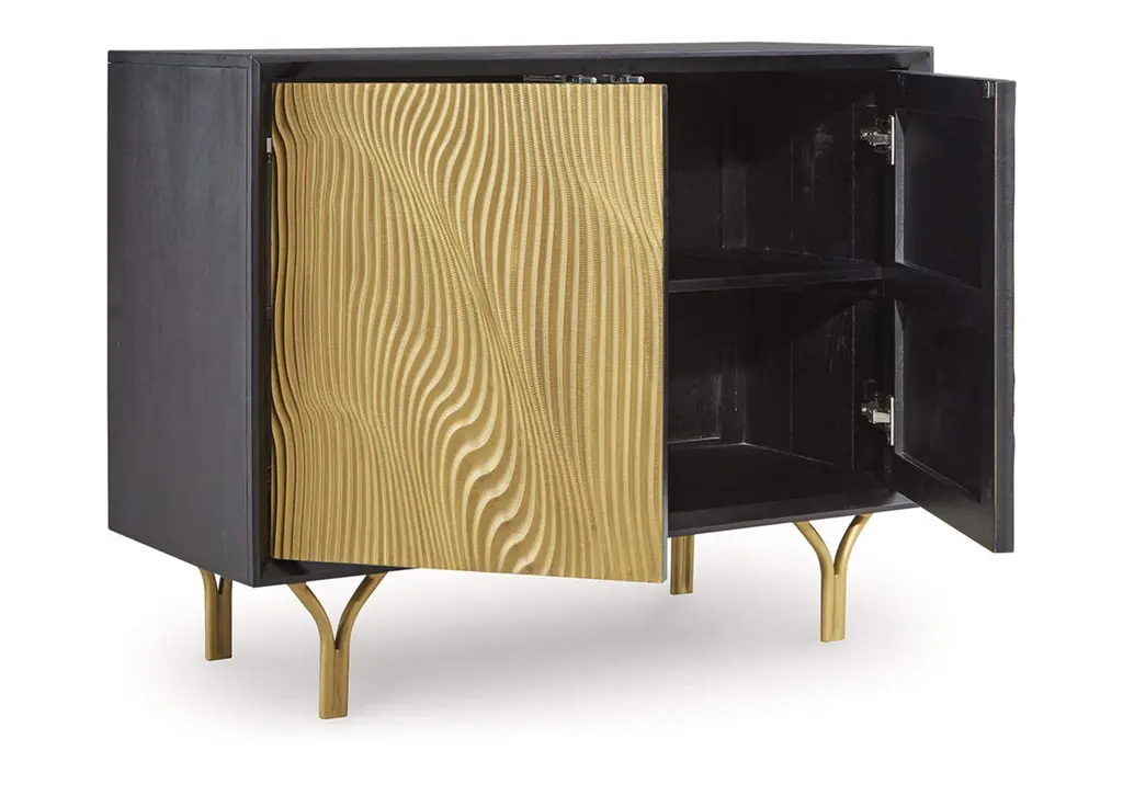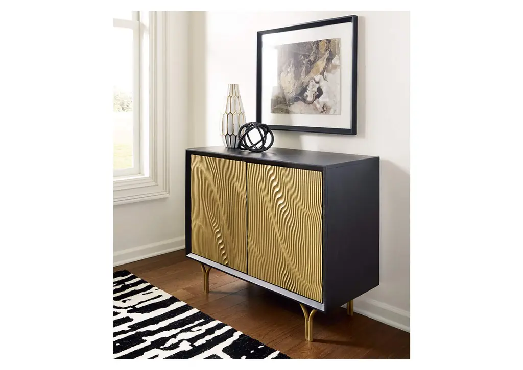 Style? Tons. Storage? Check. The Tayner accent cabinet adds more than just a contemporary cool design to your space. Finished in black and goldtone with a carved pattern on the door fronts, it conveys a sophisticated style that's perfect for a bar area. Push magnet doors open to reveal a shelf. After a long day of adulting, let this piece help you mix up a little reward. Weight 102.000 lbs. (45.9kgs.)