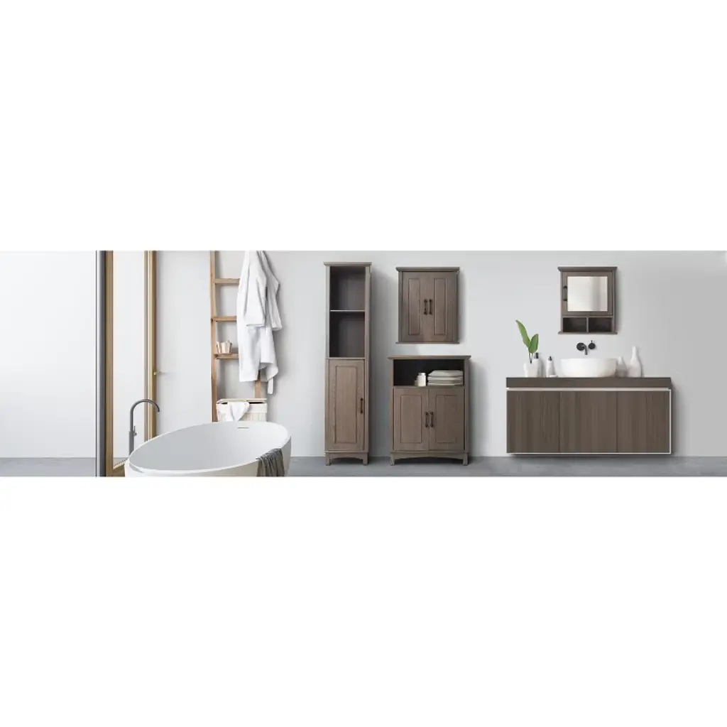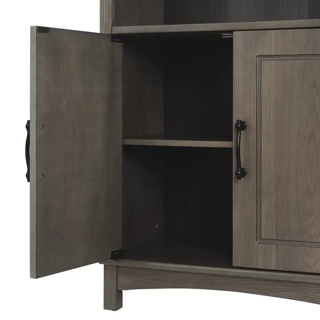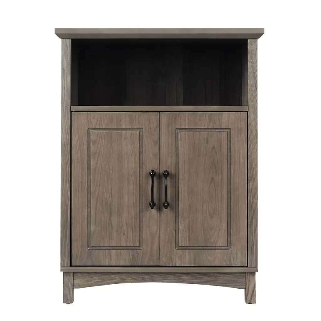 Upgrade your home storage while adding modern farmhouse decor with the Elegant Home Fashions Russell Modern Farmhouse Wooden Floor Cabinet. This decorative cabinet features a rustic salt oak finish with two paneled doors and matte black pulls for an elevated and stylish addition to your space. The adjustable interior shelf and open top shelf provide ample storage and help to reduce clutter, and its versatile design can be used in the bedroom, bathroom, living room, or in any room around the home. Constructed from durable engineered wood, this floor cabinet is built to provide you with long-lasting organization. Easy, step-by-step instructions and all of the hardware needed for installation are included for quick assembly. Purchase this stylish cabinet alone or with other items from the Russell collection for a cohesive, updated look. The Elegant Home Fashions Russell Wooden Floor Cabinet with 2 Doors and Open Shelf measures 13" x 26" x 34.3" to provide accessible storage without taking up too much space in your living area or bathroom. An affordable extravagance.